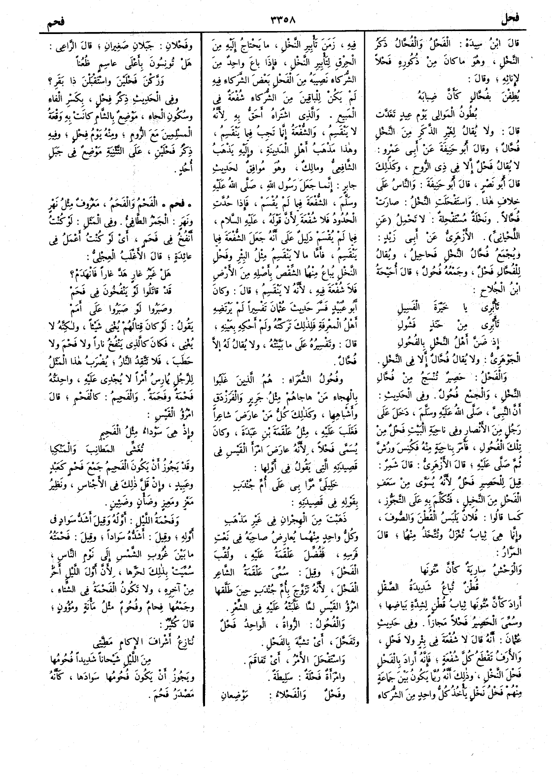 قال ابن سيده الفَحْل والفُحَّال ذكر النخل وهو ما كان من ذكوره فَحْلاً لإِناثِه وقال يُطِفْنَ بفُحَّالٍ كأَنَّ ضِبابَهُ بُطونُ المَوالي يوم عيدٍ تَغَدَّت قال ولا يقال لغير الذكر من النخل فُحَّال وقال أَبو حنيفة عن أَبي عمرو لا يقال فَحْل إِلا في ذي الرُّوح وكذلك قال أَبو نصر قال أَبو حنيفة والناس على خلاف هذا واستَفْحَلَت النخل صارت فُحَّالاً ونخلة مُسْتَفْحِلة لا تحمِل عن اللحياني الأَزهري عن أَبي زيد ويجمع فُحَّال النخل فَحاحِيل ويقال للفُحَّال فَحْل وجمعه فُحول قال أُحَيْحة ابن الجُلاح تَأَبَّرِي يا خَيْرَةَ الفَسِيل تَأَبَّرِي من حَنَذٍ فَشُول إِذ ضَنَّ أَهلُ النخْل بالفُحول الجوهري ولا يقال فُحَّال إِلا في النخل والفَحْل حَصِير تُنسَج من فُحَّال النخل والجمع فُحول وفي الحديث أَن النبي صلى الله عليه وسلم دخل على رجل من الأَنصار وفي ناحية البيت فَحْل من تلك الفُحول فأَمر بناحية منه فكُنِس ورشّ ثم صلى عليه قال الأَزهري قال شمر قيل للحصير فَحْل لأَنه يسوَّى من سعف الفَحْل من النخيل فتكلم به على التجوز كما قالوا فلان يلبس القُطْن والصوف وإِنما هي ثياب تغزَل وتتَّخذ منهما قال المرار والوَحْش سارِية كأَنَّ مُتونَها قُطْن تُباع شديدة الصَّقْلِ أَراد كأَن متونها ثياب قطن لشدَّة بياضها وسمي الحصير فَحْلاً مجازاً وفي حديث عثمان أَنه قال لا شُفْعة في بئر ولا فَحْل والأُرَف تَقْطع كلّ شفعة فإِنه أَراد بالفَحْل فَحْل النخل وذلك أَنه ربما يكون بين جماعة منهم فَحْل نخل يأْخذ كل واحد من الشركاء فيه زمَن تَأْبِير النخل ما يحتاج إِليه من الحِرْقِ لتَأْبير النخل فإِذا باع واحد من الشركاء نصيبه من الفحل بعضَ الشركاء فيه لم يكن للباقين من الشركاء شفعة في المبيع والذي اشتراه أَحق به لأَنه لا ينقسم والشُّفْعة إِنما تجب فيما ينقسم وهذا مذهب أَهل المدينة وإِليه يذهب الشافعي ومالك وهو موافق لحديث جابر إِنما جعل رسول الله صلى الله عليه وسلم الشُّفعة فيما لم يقسم فإِذا حُدت الحُدود فلا شُفعة لأَن قوله عليه السلام فيما لم يقسم دليل على أَنه جعل الشُّفعة فيما ينقسم فأَما ما لا ينقسم مثل البئر وفَحْل النخل يباع منهما الشِّقْص بأَصله من الأَرض فلا شُفعة فيه لأَنه لا ينقسِم قال وكان أَبو عبيد فسر حديث عثمان تفسيراً لم يرتضه أَهل المعرفة فلذلك تركته ولم أَحكه بعينه قال وتفسيره على ما بينته ولا يقال له إِلا فُحَّال وفُحول الشعراء هم الذين غلبوا بالهِجاء من هاجاهم مثل جرير والفرزدق وأَشباههما وكذلك كل من عارَض شاعراً فغلب عليه مثل علقمة بن عبدة وكان يسمى فَحْلاً لأَنه عارض امرأَ القيس في قصيدته التي يقول في أَولها خليليَّ مُرّا بي على أُمِّ جُنْدَبِ بقوله في قصيدته ذَهَبْت من الهجران في غير مذهَب وكل واحد منهما يعارض صاحبه في نعت فرسه ففُضِّل علقمةُ عليه ولقّب الفَحْل وقيل سمي علقمة الشاعر الفَحْل لأَنه تزوَّج بأُمِّ جُنْدَب حين طلقها امرؤ القيس لما غَلَّبَتْه عليه في الشعر والفُحول الرُّواة الواحد فَحْل وتفحَّل أَي تشبَّه بالفَحْل واستَفْحَل الأَمر أَي تَفاقَم وامرأَة فَحْلة سَلِيطة وفَحْل والفَحْلاء موضعان وفَحْلان جبلان صغيران قال الراعي هل تُونِسونَ بأَعْلى عاسِمٍ ظُعُناً وَرَّكْن فَحلَين واستَقبَلْن ذا بَقَرِ ؟ وفي الحديث ذكر فِحْل بكسر الفاء وسكون الحاء موضع بالشام كانت به وقعة المسلمين مع الروم ومنه يوم فِحْل وفيه ذكر فَحْلين على التثنية موضع في جبل أُحُد