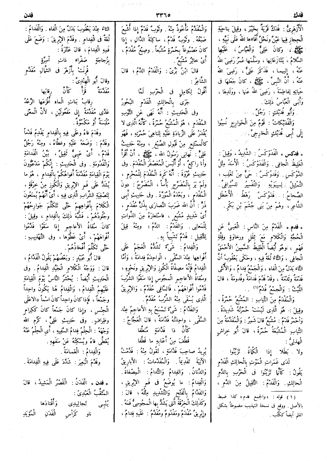والمُفْدَم من الثياب المُشْبَع حمرة وقيل هو الذي ليست حُمرته شديدة وأَحْمر فَدْم مشبع قال شمر والمُفَدَّمة من الثياب المُشْبَعة حمرة قال أبو خراش الهذلي ولا بَطَلاً إذا الكُماةُ تَزَيَّنُوا لَدَى غَمَراتِ المَوْتِ بالحالِكِ الفَدْمِ يقول كأنَّما تزينوا في الحرب بالدّم الحالك والفَدْم الثقيلُ من الدم والمُفَدَّم مأْخوذ منه وثوب فَدْم إذا أُشبع صَبْغُه وثوب فَدْم ساكنة الدال إذا كان مصبوغاً بحمرة مشبعاً وصِبْغ مُفْدَم أي خاثِر مُشْبَع قال ابن بري والفَدم الدم قال الشاعر أَقولُ لكامِلٍ في الحَرْب لَمَّا جَرى بالحالِكِ الفَدْمِ البُحورُ وفي الحديث أنه نهى عن الثوب المُفْدَم هو المشبع حمرة كأنه الذي لا يُقدر على الزيادة عليه لتناهي حمرته فهو كالممتنع من قبول الصبغ ومنه حديث علي نهاني رسول الله صلى الله عليه وسلم أن أَقرأَ وأنا راكع أو أَلبَسَ المُعَصْفَر المُفْدَم وفي حديث عروة أنه كره المُفْدَم للمُحرم ولم يرَ بالمُضَرَّج بأْساً المُضَرَّج دون المُفْدَم وبعده المُوَرَّد وفي حديث أبي ذرّ أن الله ضَرَبَ النصارى بِذلّ مُفْدَم أي شديد مشبع فاستعاره من الذوات للمعاني والفَدْم الدم ومنه قيل للثقيل فَدْم تشبيهاً به والفِدامُ شيء تشدُّه العجم على أفواهها عند السَّقْي الواحدة فِدامَة وأما الفِدام فإنه مِصْفاة الكوز والإبريق ونحوه وسُقاةُ الأَعاجم المجوس إذا سَقَوا الشِّرْبَ فَدَّمُوا أَفواههم فالساقي مُفَدَّم والإبريق الذي يُسقى منه الشِّرْب مُفَدَّم والفَدَّام شيء تمسح به الأعاجم عند السقي واحدته فَدَّامة قال العجاج كأَنَّ ذا فَدَّامةٍ مُنَطَّفا قَطَّفَ مِن أَعْنابه ما قَطَّفا يريد صاحب فَدَّامة تقول منه فَدَّمْت الآنية تَفدِيماً والمُفَدَّمات الأَباريق والدنان والفِدامُ والثِّدامُ المِصْفاة والفِدام ما يوضع في فم الإبريق والفَدَّم بالفتح والتشديد مثله قال وكذلك الخرقة التي يَشدّ بها المجوسي فمه وإبريق مُفْدَم ومَفدُوم ومُفَدَّم عليه فِدام الثاء عند يعقوب بدل من الفاء والفَدامُ لغة في الفِدام وفَدَّم الإبريقَ وضع على فمه الفِدَام قال عنترة بِزُجاجةٍ صَفْراءَ ذاتِ أسِرَّةٍ قُرِنَتْ بأَزْهَر في الشِّمال مُفَدَّمِ وقال أبو الهِندي مُفَدَّمة قَزّاً كأنَّ رِقابَها رِقابُ بَناتِ الماء أفْزَعَها الرَّعْدُ عدَّى مُفَدَّمة إلى مفعولين لأن المعنى ملبسة أو مكسوّة وفَدَم فاه وعلى فيه بالفِدام يَفْدِم فَدْماً وفَدَّم وضعه عليه وغطَّاه ومنه رجل فَدْمٌ أي عَييّ ثقيل بَيِّن الفَدامة والفُدومة وفي الحديث إنكم مَدْعُوُّون يوم القيامة مُفَدَّمة أفواهُكُم بالفِدام هو ما يشد على فم الإبريق والكوز من خرقة لتصفية الشَّراب الذي فيه أي أنهم يُمنعون الكلام بأَفواههم حتى تتكلم جوارحهم وجلودهم فشبه ذلك بالفدام وقيل كان سُقاة الأَعاجم إذا سَقَوْا فَدَّموا أفواههم أي غَطَّْوها وفي التهذيب حتى تكلم أفخاذهم قال أبو عبيد وبعضهم يقول الفَدَّام قال ووجه الكلام الجيد الفِدام وفي الحديث أيضاً يُحشر الناس يوم القيامة عليهم الفِدام والفِدام هنا يكون واحداً وجمعاً فإذا كان واحداً كان اسماً دالاً على الجنس وإذا كان جمعاً كان كَكِرام وظِراف وفي حديث عليّ كرم الله وجهه الحلم فِدام السفيه أي الحلم عنه يُغَطِّي فاه ويُسْكته عن سفهه والفِدام الغِمامة وفَدَّم البعيرَ شدَّد على فيه الفِدامة