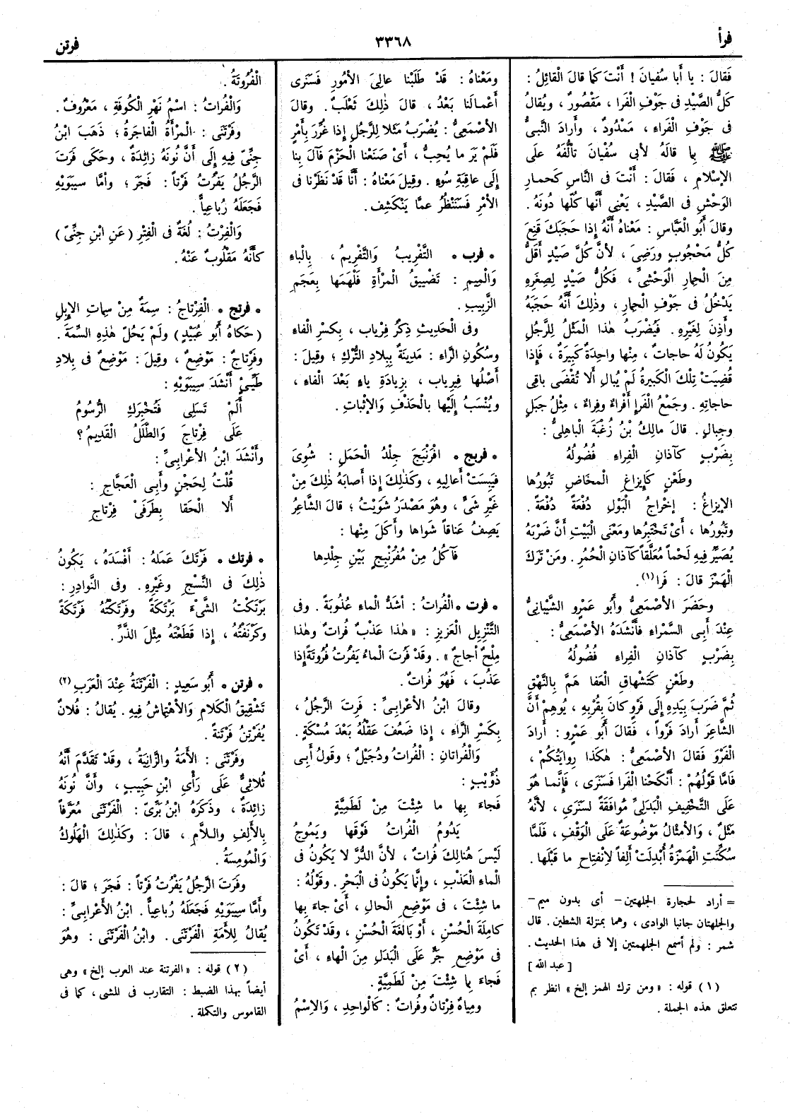( فربج ) افْرَنْبَجَ جِلْدُ الحَمَلِ شُوِي فَيَبِسَتْ أَعاليه وكذلك إِذا أَصابه ذلك من غير شَيٍّ وهو مصدر شَوَيْتُ قال الشاعر يصف عَناقاً شَواها وأَكل منها فآكُلُ مِنْ مُفْرَنْبِجٍ بين جلدها( فرت ) الفُراتُ أَشَدُّ الماء عُذوبةً وفي التنزيل العزيز هذا عَذْبٌ فُراتٌ وهذا مِلْحٌ أُجاجٌ وقد فَرُتَ الماءُ يَفْرُتُ فُروتةً إِذا عَذُبَ فهو فُراتٌ وقال ابن الأَعرابي فَرِتَ الرجلُ بكسر الراء إِذا ضَعُفَ عقلُه بعد مُسْكَةٍ والفُراتانِ الفُراتُ ودُجَيْلٌ وقول أَبي ذؤَيب فَجاءَ بها ما شِئْتَ من لَطَمِيَّةٍ يَدُومُ الفُراتُ فَوْقَها ويَمُوجُ ليس هنالك فُراتٌ لأَن الدُّرَّ لا يكون في الماء العذب وإِنما يكون في البحر وقوله ما شئت في موضع الحال أَي جاء بها كاملة الحُسْن أَو بالغةَ الحُسْن وقد تكون في موضع جَرّ على البدل من الهاء أَي فجاء بما شِئْتَ من لَطَمِيَّة ومياهٌ فِرْتانٌ وفُراتٌ كالواحدِ والاسم الفُروتَةُ والفُراتُ اسم نهر الكوفة معروف وفَرْتَنى المرأَةُ الفاجرةُ ذهب ابن جني فيه إِلى أَن نونه زائدة وحكى فَرَتَ الرجلُ يَفْرُتُ فَرْتاً فَجر وأَما سيبويه فجعله رباعياً والفِرْتُ لغةٌ في الفِتْر عن ابن جني كأَنه مقلوب عنه