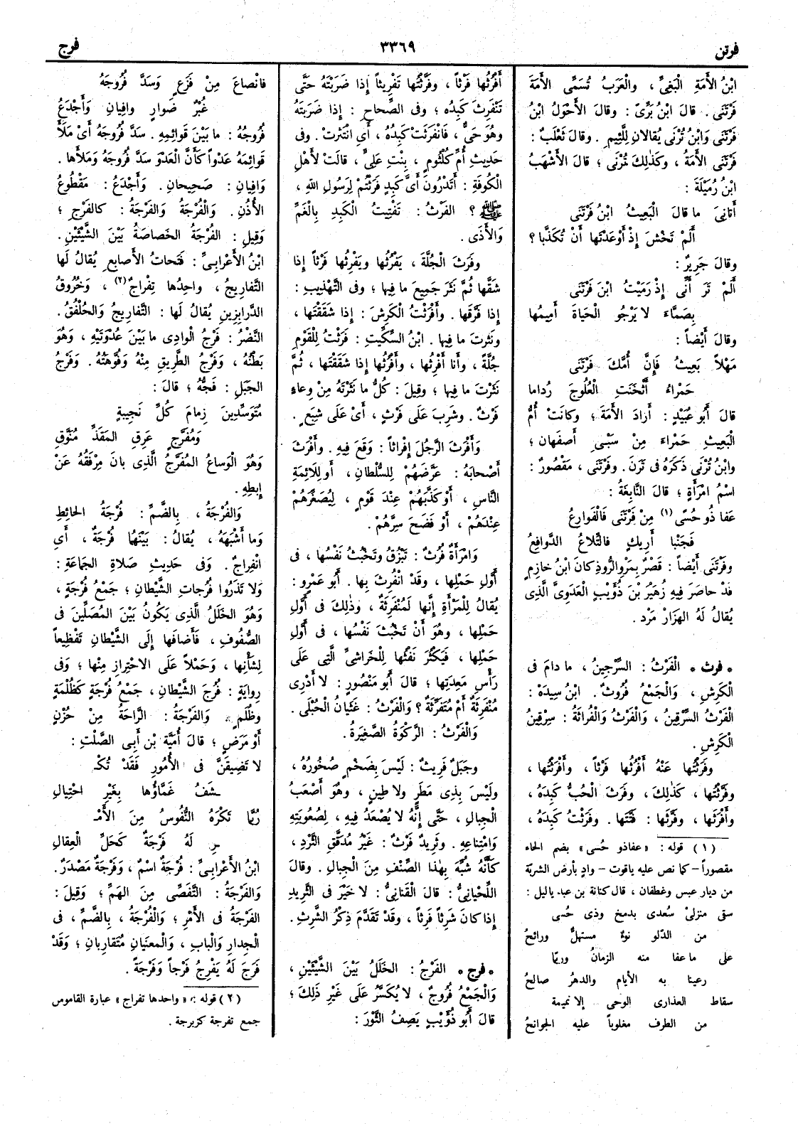 ( فرث ) الفَرْثُ السِّرْجينُ ما دام في الكَرِشِ والجمع فُرُوثٌ ابن سيده الفَرْثُ السِّرْقِينُ والفَرْثُ والفُراثة سِرْقِينُ الكَرشِ وفَرَثْتُها عنه أَفْرُثُها فَرْثاً وأَفْرَثْتُها وفَرَّثْتُها كذلك وفَرَثَ الحُبُّ كَبِدَه وأَفْرثَها وفَرَّثَها فَتَّتَها وفَرَثْتُ كَبِدَه أَفْرِثُها فَرْثاً وفَرَّثْتُها تَفْريثاً إِذا ضَرَبْتَه حتى تَنْفَرِثَ كَبِدُه وفي الصحاح إِذا ضَرَبتَه وهو حَيٌّ فانْفَرَثَتْ كَبِدُه أَي انْتَثرتْ وفي حديث أُم كُلْثوم بنتِ عليٍّ قالت لأَهل الكوفة أَتدرون أَيَّ كَبِدٍ فَرَثْتم لرسول الله صلى الله عليه وسلم ؟ الفَرْثُ تَفْتيت الكَبِد بالغم والأَذى وفَرَثَ الجُلَّة يَفْرُثُها ويَفْرِثُها فَرْثاً إِذا شَقَّها ثم نَثرَ جميعَ ما فيها وفي التهذيب إِذا فَرَّقها وأَفرَثْتُ الكَرِشَ إِذا شَقَقْتَها ونَثرْتَ ما فيها ابن السكيت فَرَثْتُ للقوم جُلَّةً وأَنا أَفْرِثها وأَفرُثُها إِذا شَقَقْتها ثم نَثرْتَ ما فيها وقيل كلُّ ما نثرْته من وِعاءٍ فَرْثٌ وشَرِبَ على فَرْثٍ أَي على شِبَع وأَفرَثَ الرجلَ إِفْراثاً وقَعَ فيه وأَفْرَثَ أَصحابَه عَرَّضَهم للسلطان أَو لِلائَمةِ الناس أَو كَذَّبهم عند قوم ليُصغَّرَهم عندَهم أَو فَضَحَ سِرَّهم وامرأَةٌ فُرُثٌ تَبْزُقُ وتَخْبُثُ نفسُها في أَول حَمْلِها وقد انْفُرِثَ بها أَبو عمرو يقال للمرأَة إِنها لمُنْفَرثةٌ وذلك في أَولِ حَمْلها وهو أَن تَخْبُثَ نفسُها في أَول حملها فيكْثُر نَفْثُها للخَراشِيِّ التي على رأْس مَعِدتِها قال أَبو منصور لا أَدري مُنْفَرِثةٌ أَم مُتَفَرِّثةٌ ؟ والفَرْثُ غَثَيانُ الحُبْلى والفَرْثُ الرَّكْوة الصغيرةُ وجبلٌ فَريثٌ ليس بضخْمٍ صُخورُه وليس بذي مَطَرٍ ولا طِينٍ وهو أَصعبُ الجبال حتى إِنه لا يُصْعَدُ فيه لصُعوبته وامتناعه وثَريدٌ فَرْثٌ غير مُدَقَّقِ الثَّرْدِ كأَنه شُبِّه بهذا الصِّنْفِ من الجبال وقال اللحياني قال القَنانيّ لا خير في الثريدِ إِذا كان شَرِثاً فَرِثاً وقد تقدم ذكر الشَّرِثِ ( فرج ) الفَرْجُ الخَلَلُ بين الشيئين والجمع فُرُوجٌ لا يكسَّر على غير ذلك قال أَبو ذؤيب يصف الثور فانْصاعَ مِنْ فَزَعٍ وسَدَّ فُرُوجَهُ غُبْرٌ ضَوارٍ وافِيانِ وأَجْدَعُ فُروجه ما بين قوائمه سَدَّ فُرُوجَه أَي مَلأَ قوائمه عَدْواً كأَن العَدْوَ سَدَّ فُروجَه ومَلأَها وافيان صحيحان وأَجْدَع مقطوع الأُذُن والفُرْجَة والفَرْجَة كالفَرْج وقيل الفُرْجَة الخَصاصَة بين الشيئين ابن الأَعرابي فَتَحات الأَصابع يقال لها التَّفارِيجُ واحدها تِفْراجٌ