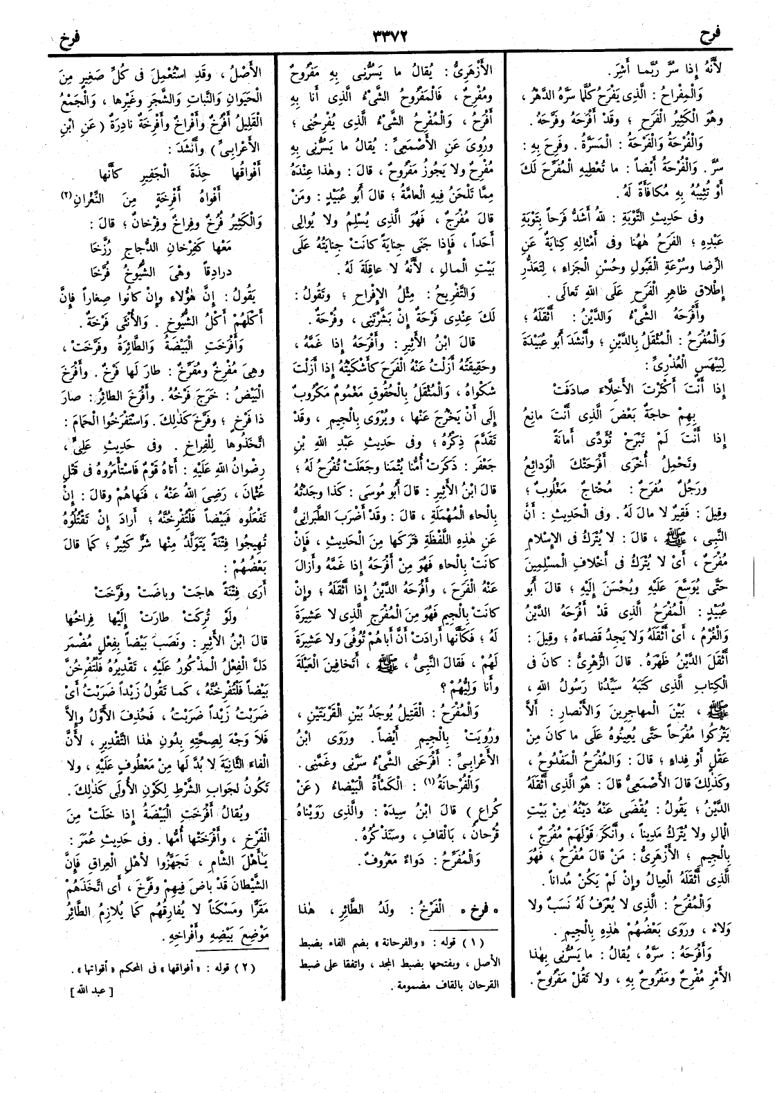 ( * قوله « والفرحانة » بضم الفاء بضبط الأصل وبفتحها بضبط المجد واتفقا على ضبط القرحان بالقاف مضمومة ) الكَمْأَةُ البيضاء عن كراع قال ابن سيده والذي رويناه قرحان بالقاف وسنذكره والمُفَرِّحُ دواء معروف ( فرخ ) الفَرْخ ولد الطائر هذا الأَصل وقد استعمل في كل صغير من الحيوان والنبات والشجر وغيرها والجمع القليل أَفرُخ وأَفراخه وأَفرِخَةٌ نادرة عن ابن الأَعرابي وأَنشد أَفْواقُها حِذَةَ الجَفِيرِ كأَنَّها أَفْواهُ أَفْرِخَةٍ من النِّغْرانِ والكثير فُرُخٌ وفِراخٌ وفِرْخانٌ قال مَعْها كفِرْخانِ الدجاجِ رُزَّخَا دَرادِقاً وهْيَ الشُّيوخُ فُرَّخَا يقول إِن هؤلاء وإِن كانوا صغاراً فإِن أَكلهم أَكل الشيوخ والأُنثى فرخة وأَفْرَخَت البيضة والطائرة وفرّخت وهي مُفْرِخٌ ومُفْرِّخٌ طار لها فَرْخ وأَفرخ البيضُ خرج فرخه وأَفرخ الطائر صار ذا فرخ وفرَّخ كذلك واسْتَفْرَخُوا الحَمامَ اتخذوها للفراخ وفي حديث عليّ رضوان الله عليه أَتاه قوم فاستأْمروه في قتل عثمان رضي الله عنه فنهاهم وقال إِن تفعلوه فَبَيْضاً فَلْيُفْرِخَنَّه أَراد إِن تقتلوه تهيجوا فتنة يتولى منها شيء كثير كما قال بعضهم أَرى فتنةً هاجت وباضت وفرّخت ولو تُركت طارت إِليها فراخُها قال ابن الأَثير ونصب بيضاً بفعل مضمر دل الفعل المذكور عليه تقديره فَلْيُفْرِخَنَّ بَيْضاً فَلْيُفْرِخَنَّه كما تقول زيداً أَضرب ضربت