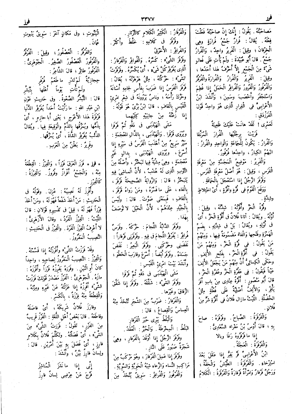 مصاحبته يقول إِنك إِن صاحبتَه فعلتَ فعلَه يقال فُرارٌ جمع فُرارةٍ وهي الخِرْفان وقيل الفَرير واحد والفُرارُ جمع قال أَبو عبيدة ولم يأْت على فُعالٍ شيء من الجمع إِلا أَحرف هذا أَحدها وقيل الفَرِيرُ والفُرارُ والفُرارَةُ والفُرْفُر والفُرْفُورُ والفَرورُ والفُرافِرُ الحَمَل إِذا فطم واستَجْفر وأَخصب وسَمِن وأَنشد ابن الأَعرابي في الفُرارِ الذي هو واحد قول الفرزدق لَعَمْري لقد هانتْ عليكَ ظَعِينةٌ فَرَيْتَ برجليها الفُرارَ المُرَنَّقا والفُرارُ يكون للجماعة والواحد والفُرار البهْم الكبار واحدها فُرْفُور والفَرِيرُ موضع المَجَسَّة من مَعْرفة الفرس وقيل هو أَصل مَعْرفة الفرس وفَرْفَرَ الرجلُ إِذا استعجل بالحماقة ووقع القوم في فُرَّةٍ وأُفُرَّة أَي اختلاط وشدة وفُرَّةُ الحرّ وأُفُرَّتهُ شدته وقيل أَوله ويقال أَتانا فلان في أُفُرَّةِ الحر أَي في أَوله ويقال بل في شدته بضم الهمزة وفتحها والفاء مضمومة فيهما ومنهم من يقول في فُرَّةِ الحر ومنهم من يقول في أَفُرَّةِ الحر بفتح الأَلف وحكى الكسائي أَن منهم من يجعل الأَلف عيناً فيقول في عَفُرَّة الحرِّ وعُفُرّةِ الحر قال أَبو منصور أُفُرَّةٌ عندي من باب أَفَرَ يأْفِر والأَلف أَصلية على فُعُلَّةٍ مثل الخُضُلَّةِ الليث ما زال فلان في أُفُرَّةِ شَرٍّ من فلان والفَرْفَرَةُ الصياح وفَرْفَرَه صاح به قال أَوس بن مغراء السعدي إِذا ما فَرْفَروه رَغَا وبالا والفَرْفَرةُ العجلة ابن الأَعرابي فَرَّ يَفِرُّ إِذا عقل بعد استرخاء والفَرْفَرةُ الطيش والخفة ورجلٌ فَرْفارٌ وامرأَة فَرْفارةٌ والفَرْفَرةُ الكلام والفَرْفارُ الكثير الكلام كالثَّرْثارِ وفَرْفَر في كلامه خلَّط وأَكثر والفُرافِرُ الأَخْرَقُ وفَرْفَر الشيءَ كسره والفُرافِرُ والفَرْفار الذي يُفَرْفِرُ كل شيء أَي يكسره وفَرْفَرْت الشيء حركته مثل هَرْهَرْته يقال فَرْفَرَ الفرسُ إِذا ضرب بفأْس لجامه أَسنانه وحرك رأْسه وناس يَرْوُونه في شعر امرئ القيس بالقاف قال ابن بري هو قوله إِذا زُعْتُه من جانِبَيْهِ كِلَيْهما مشى الهَيْذَبى في دَفِّه ثم فَرْفَرا ويروى قَرْقَرا والهَيْذَبى بالذال المعجمة سير سريع من أَهْذَبَ الفرسُ في سيره إِذا أَسرع ويروى الهَيْدَبى بدال غير معجمة وهي مِشْية فيها تبختر وأَصله من الثوب الذي له هدب لأَن الماشي فيه يتبختر قال والرواية الصحيحة فَرْفَر بالفاء على ما فسره ومن رواه قَرْقَر بالقاف فبمعنى صَوَّت قال وليس بالجيد عندهم لأَن الخيل لا توصف بهذا وفَرْفَر الدابةُ اللجامَ حركه وفرس فُرفِرٌ يُفَرْفِرُ اللجام في فيه وفَرْفَرَني فَرْفاراً نفضني وحركني وفَرْفَر البعيرُ نفض جسده وفَرْفَرَ أَيضاً أَسرع وقارب الخَطْو وأَنشد بيت امرئ القيس مشى الهَيْذَبى في دَفِّه ثم فَرْفَرا وفَرْفَر الشيءَ شققه وفَرْفَر إِذا شقق الزِّقاقَ وغيرها والفَرْفار ضرب من الشجر تتخذ منه العِساسُ والقِصاعُ قال والبَلْطُ يَبْرِي حُبَرَ الفَرْفارِ البَلط المِخرطة والحُبَر العُقَد وفَرْفَرَ الرجل إِذا أَوقد بالفَرْفار وهي شجرة صَبُور على النار وفَرْفَر إِذا عمل الفَرْفار وهو مَرْكب من مراكب النساء والرِّعاءِ شِبْه الحَوِيَّة والسَّوِيَّة والفُرْفُور والفُرافِرُ سَوِيق يتخذ من اليَنْبُوتِ وفي مكان آخر سويقُ يَنْبوتِ عُمان والفُرْفُر العصفور وقيل الفُرْفُر والفُرْفُور العصفور الصغير الجوهري الفُرْفُور طائر قال الشاعر حجازيَّة لم تَدْرِ ما طَعْمُ فُرْفُرٍ ولم تأْتِ يوماً أَهلَها بِتُبُشِّرِ قال التُّبُشِّر الصَّعْوة وفي حديث عون بن عبد الله ما رأَيت أَحداً يُفَرْفِرُ الدنيا فَرْفَرَةَ هذا الأَعرج يعني أَبا حازم أَي يذمها ويمزِّقها بالذم والوقيعة فيها ويقال الذئب يُفَرْفِرُ الشاة أَي يمزقها وفَرِير بطن من العرب