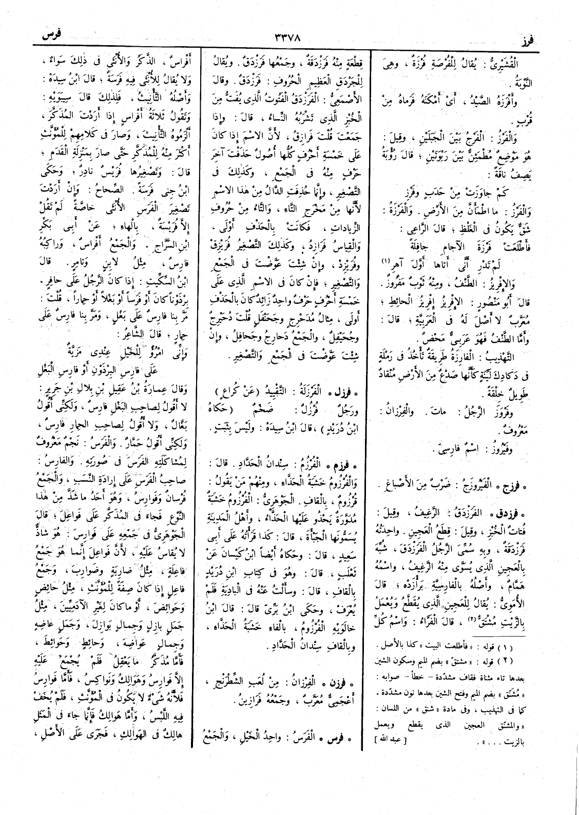 ( فرزج ) الفَيْرُوزَجُ ضَرْبٌ من الأَصباغِ ( فرزدق ) الفَرَزْدَقُ الرغيف وقيل فُتات الخبز وقيل قِطَع العجين واحدته فَرَزْدَقَة وبه سمي الرجل الفَرَزْدَق شبه بالعجين الذي يسوِّي منه الرغيف واسمه هَمَّام وأَصله بالفارسية بَرأزَدْه قال الأُموي يقال للعجين الذي يقطع ويعمل بالزيت مشتقّ قال الفراء واسم كل قطعة منه فَرَزْدَقة وجمعها فَرَزْدَق ويقال للجَرْذَقِ العظيم الحروف فَرَزْدَق وقال الأَصمعي الفَرَزْدَقُ الفَتُوت الذي يُفَتّ من الخبز الذي تشربه النساء قال وإذا جمعت فَرازِق لأَن الإسم إذا كان على خمسة أَحرف كلها أُصول حذفت آخر حرف منه في الجمع وكذلك في التصغير وإنما حذفت الدال من هذا الإسم لأَنها من مخرج التاء والتاءُ من حروف الزيادات فكانت بالحذف أولى والقياس فَرَازِد وكذلك التصغير فُرَيْزِقْ وفُرَيْزِدْ التصغير فُرَيْزِقْ وفُرَيْزِدْ وإن شئت عوضتَ في الجمع والتصغير فإن كان في الإسم الذي على خمسة أَحرف حرف واحد زائد كان بالحذف أَولى مثال مُدَحْرِج وجَحَنْفَل قلت دُحَيْرج وجُحَيْفِل والجمع دَحارج وجَحافل وإن شئت عوضت في الجمع والتصغير