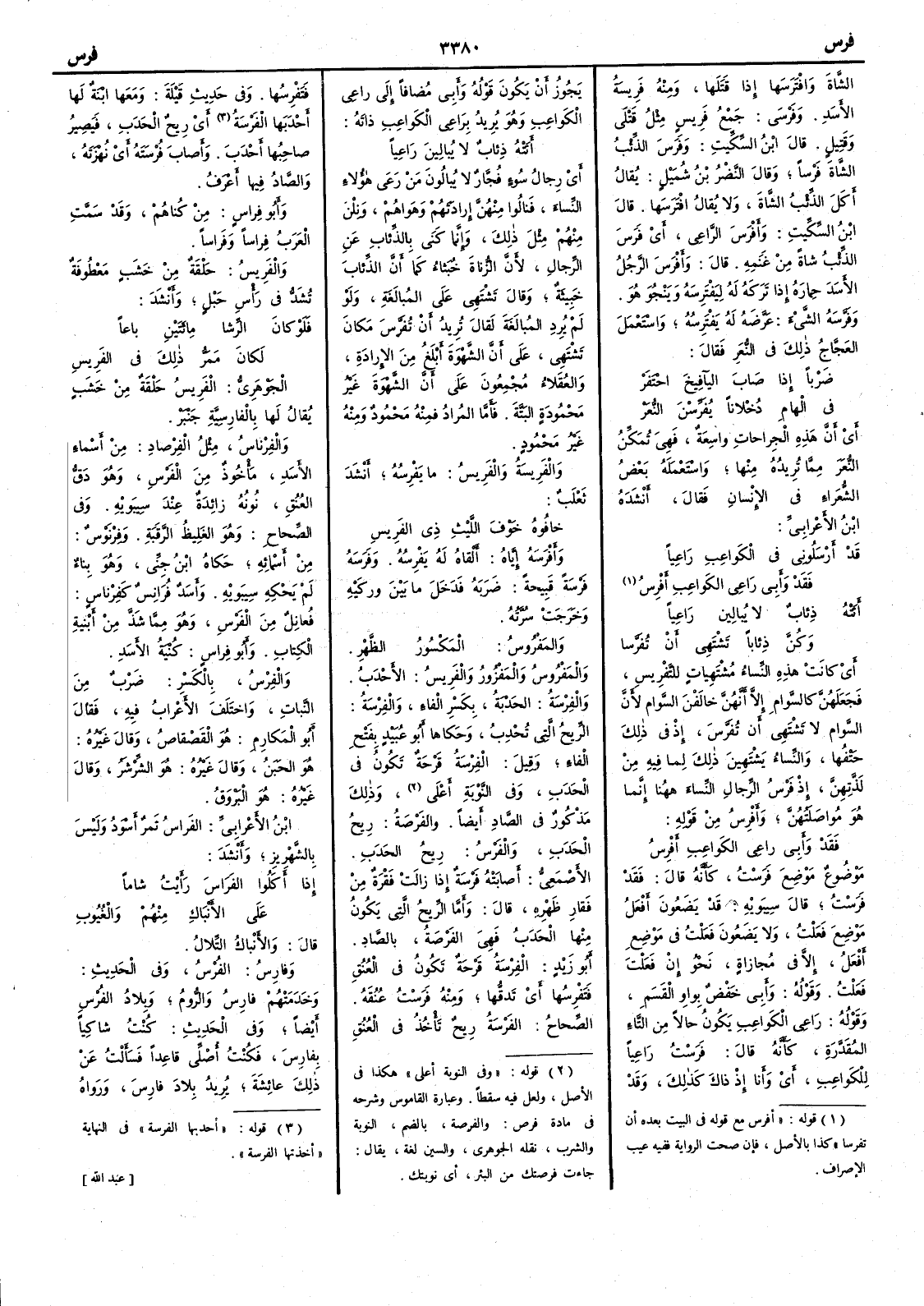 وذلك مذكور في الصاد أَيضاً والفَرْصَة ريح الحَدَب والفَرْس ريح الحَدَب الأَصمعي أَصابته فَرْسَة إِذا زالت فَقْرة من فَقار ظهره قال وأَمّا الرِّيح التي يكون منها الحَدَب فهي الفَرْصَة بالصاد أَبو زيد الفِرسَة قَرْحَة تكون في العُنُق فَتَفْرِسها أَي تدقها ومنه فَرَسْتُ عُنُقه الصحاح الفَرْسَة ريح تأْخذُ في العُنُق فَتَفْرِسُها وفي حديث قَيْلَة ومعها ابنة لها أَحْدَبَها الفِرْسَة أَي ريح الحدَب فيَصير صاحبها أَحْدَب وأَصاب فُرْسَتَه أَي نُهْزَته والصاد فيها أَعرف وأَبو فِراسٍ من كُناهُم وقد سَمَّت العرَب فِراساً وفَراساً والفَرِيسُ حَلْقَة من خَشب معطوفة تُشَدُّ في رأْس حَبْل وأَنشد فلو كانَ الرِّشا مِئَتَيْنِ باعاً لَكان مَمرُّ ذلك في الفَرِيسِ الجوهري الفَريس حَلْقَة من خَشب يقال لها بالفارسيَّة جَنْبر والفِرْناس مثل الفِرْصاد من أَسماء الأَسد مأْخوذة من الفَرْسِ وهو دقّ العُنُق نونه زائدة عند سيبويه وفي الصحاح وهو الغليظ الرَّقبة وفِرْنَوْس من أَسمائه حكاه ابن جني وهو بناء لم يحكه سيبويه وأَسد فُرانِس كفِرْناس فُعانِل من الفَرْس وهو مما شذَّ من أَبنية الكتاب وأَبو فِراس كُنية الأَسد والفِرس بالكسر ضرب من النَّبات واختَلَف الأَعراب فيه فقال أَبو المكارِم هو القَصْقاص وقال غيره هو الحَبَنٌ وقال غيره هو الشَِّرْشَِرُ وقال غيره هو البَرْوَقُ ابن الأَعرابي الفَراس تمر أَسود وليس بالشِّهْرِيزِ وأَنشد إِذا أَكلُوا الفَراسَ رأَيت شاماً على الأَنْثال منهمْ والغُيُوبِ قال والأَنْثال التِّلال وفارِسُ الفُرْسُ وفي الحديث وخَدَمَتْهم فارِسُ والرُّوم وبِلادُ الفُرْس أَيضاً وفي الحديث كنت شاكِياً بفارس فكنتُ أُصلي قاعدا فسأَلت عن ذلك عائشة يريد بلادَ فارِس ورواه