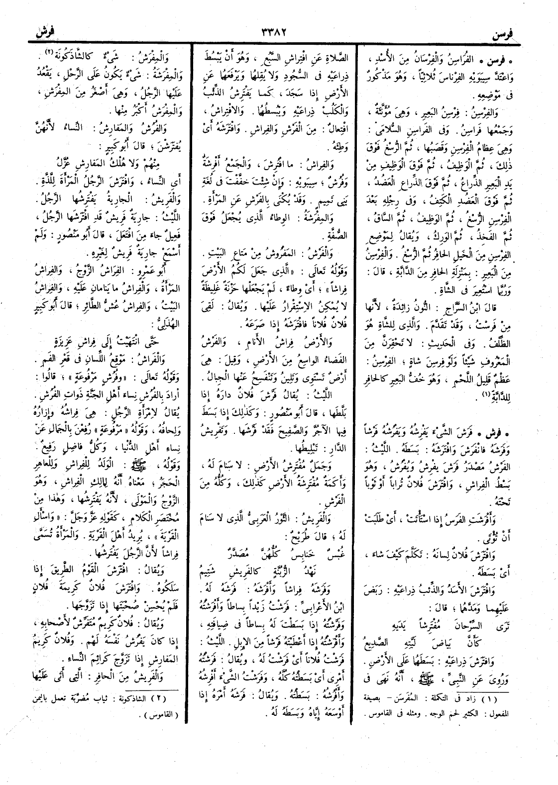 ( فرسن ) الفُرَاسِنُ والفِرْسَانُ من الأُسْد واعْتَدَّ سيبويه الفِرْناسَ ثلاثيّاً وهو مذكور في موضعه والفِرْسِنُ فِرْسِنُ البعير وهي مؤنثة وجمعها فَراسِنُ وفي الفَراسِنِ السُّلامَى وهي عظام الفِرْسِن وقَصَبُها ثم الرُّسْغ فوق ذلك ثم الوَظِيفُ ثم فوق الوَظِيفِ من يد البعير الذِّراعُ ثم فوق الذراع العَضُدُ ثم فوق العَضُدِ الكتفُ وفي رجله بعد الفِرْسِنِ الرُّسغُ ثم الوظيفُ ثم الساق ثم الفخذ ثم الوَرِكُ ويقال لموضع الفِرْسِن من الخيل الحافرُ ثم الرُّسْغُ والفِرْسِنُ من البعير بمنزلة الحافر من الدابة قال وربما استعير في الشاة قال ابن السراج النون زائدة لأَنها من فَرسْتُ وقد تقدم والذي للشاة هو الظَّلْفُ وفي الحديث لا تَحْقِرَنَّ من المعروف شيئاً ولو فِرسِنَ شاة الفِرْسِنُ عظم قليل اللحم وهو خُفَّ البعير كالحافر للدابة ( فرش ) فَرَشَ الشيء يفْرِشُه ويَفْرُشُه فَرْشاً وفَرَشَه فانْفَرَش وافْتَرَشَه بسَطَه الليث الفَرْشُ مصدر فَرَشَ يَفْرِش ويفْرُش وهو بسط الفراش وافْتَرشَ فلان تُراباً أَو ثوباً تحته وأَفْرَشَت الفرس إِذا اسْتَأْتَتْ أَي طلبت أَن تُؤْتى وافْتَرشَ فلان لسانَه تكلم كيف شاء أَي بسطه وافْتَرشَ الأَسدُ والذئب ذراعيه رَبَضَ عليهما ومدّهما قال تَرى السِّرْحانَ مُفْتَرِشاً يَدَيه كأَنَّ بَياضَ لَبَّتِه الصَّدِيعُ وافتَرَشَ ذراعيه بسطهما على الأَرض وروي عن النبي صلى اللَّه عليه وسلم أَنه نهى في الصلاة عن افتراش السبع وهو أَن يَبْسُط ذراعيه في السجود ولا يُقِلَّهما ويرْفَعَهما عن الأَرض إِذا سَجَد كما يَفْتَرشُ الذئبُ والكلب ذراعيه ويبسطهما والافْتِراشُ افْتِعالٌ من الفَرْش والفِراش وافْتَرَشَه أَي وطِئَه والفِراشُ ما افْتُرِش والجمع أَفْرِشةٌ وفُرُشٌ سيبويه وإِن شئت خفَّفْت في لغة بني تميم وقد يكنى بالفَرْش عن المرأَة والمِفْرَشةُ الوِطاءُ الذي يُجْعل فوق الصُّفَّة والفَرْشُ المَفْروشُ من متاع البيت وقوله تعالى الذي جعل لكم الأَرض فِراشاً أَي وِطاءً لم يَجْعلها حَزْنةً غَليظة لا يمكن الاستقرار عليها ويقال لَقِيَ فلان فلاناً فافْتَرَشَه إِذا صرَعَه والأَرض فِراشُ الأَنام والفَرْشُ الفضاءُ الواسع من الأَرض وقيل هي أَرض تَسْتوي وتَلِين وتَنْفَسِح عنها الجبال الليث يقال فَرَّش فلان داره إِذا بلّطَها قال أَبو منصور وكذلك إِذا بَسَطَ فيها الآجُرَّ والصَفِيحَ فقد فَرَّشَها وتَفْرِيشُ الدار تَبْلِيطُها وجمَلٌ مُفْتَرِشُ الأَرض لا سَنام له وأَكمةٌ مُفْتَرِشةُ الأَرض كذلك وكلُّه من الفَرْشِ والفَرِيشُ الثَوْرُ العربي الذي لا سنام له قال طريح غُبْس خَنابِس كلّهنّ مُصَدّرٌ نَهْدُ الزُّبُّنّة كالفَرِيشِ شَتِيمُ وفَرَشَه فِراشاً وأَفْرَشَه فَرَشَه له ابن الأَعرابي فَرَشْتُ زيداً بِساطاً وأَفْرَشْته وفَرَّشْته إِذا بَسَطت له بِساطاً في ضيافتِه وأَفْرَشْته إِذا أَعْطَبته فَرْشاً من الإِبل الليث فَرَشْت فلاناً أَي فَرَشْت له ويقال فَرَشْتُه أَمْري أَي بسطته كلَّهُ وفَرَشْت الشيء أَفْرِشُه وأَفْرُشُه بسطته ويقال فَرَشَه أَمْرَهي إِذا أَوسَعه إِياه وبسَطه له والمِفْرَشُ شيء كالشاذَكُونَة