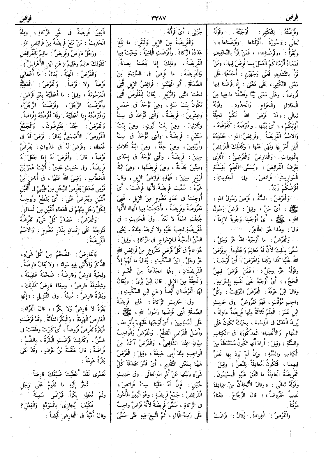 وفَرَّضْتُه للتكثير أَوْجَبْتُه وقوله تعالى سُورةٌ أَنْزَلْناها وفَرَضْناها ويقرأ وفرَّضْناها فمن قرأَ بالتخفيف فمعناه أَلزَمْنا كم العَمل بما فُرِضَ فيها ومن قرأَ بالتشديد فعلى وجهين أَحدهما على معنى التكثير على معنى إِنا فرضنا فيها فُرُوضاً وعلى معنى بَيَّنَّا وفَصَّلْنا ما فيها من الحلال والحرام والحدُود وقوله تعالى قد فرَضَ اللّه لكم تَحِلّةَ أَيْمانِكم أَي بيَّنها وافْتَرَضَه كفَرَضَه والاسم الفَرِيضةُ وفَرائضُ اللّهِ حُدودُه التي أَمرَ بها ونهَى عنها وكذلك الفَرائضُ بالمِيراثِ والفارِضُ والفَرَضِيُّ الذي يَعْرِف الفرائضَ ويسمى العِلْمُ بقِسْمةِ المَوارِيث فَرائضَ وفي الحديث أَفْرَضُكم زيد والفَرْضُ السُّنةُ فَرَضَ رسول اللّه صلّى اللّ عليه وسلّم أَي سَنَّ وقيل فَرَضَ رسولُ اللّه صلّى اللّه عليه وسلّم أَي أَوْجَبَ وُجُوباً لازماً قال وهذا هو الظاهر والفَرْضُ ما أَوْجَبه اللّه عزّ وجلّ سمي بذلك لأَنَّ له مَعالِمَ وَحُدُوداً وفرَض اللّه علينا كذا وكذا وافْتَرَضَ أَي أَوْجَب وقوله عزّ وجلّ فمَن فرَض فيهنّ الحج أَي أَوْجَبه على نفسه بإِحرامه وقال ابن عرفة الفَرْضُ التوْقِيتُ وكلُّ واجِبٍ مؤقَّتٍ فهو مَفْرُوضٌ وفي حديث ابن عمر العِلْمُ ثلاثةٌ منها فرِيضةٌ عادلةٌ يريد العَدْل في القِسْمة بحيث تكون على السِّهام والأَنْصِباء المذكورة في الكتاب والسنَّة وقيل أَراد أَنها تكون مُسْتَنْبَطَةً من الكتاب والسنة وإِن لم يَرِد بها نص فيهما فتكون مُعادِلةً للنص وقيل الفَرِيضةُ العادِلةُ ما اتفق عليه المسلمون وقوله تعالى وقال لأَتَّخِذنَّ من عِبادِكَ نصِيباً مَفْرُوضاً قال الزجاج معناه مؤقتاً والفَرْضُ القِراءة يقال فَرَضْتُ جُزْئي أَي قرأْته والفَرِيضةُ من الإِبل والبقر ما بلغ عَدَدُه الزكاةَ وأَفْرَضَتِ الماشِيةُ وجبت فيها الفَرِيضة وذلك إِذا بلغت نِصاباً والفَرِيضةُ ما فُرِضَ في السائمةِ من الصدقة أَبو الهيثم فَرائضُ الإِبل التي تحتَ الثَّنيّ والرُّبُعِ يقال للقَلُوصِ التي تكون بنت سنة وهي تؤخذ في خمس وعشرين فَرِيضةٌ والتي تؤخذ في ست وثلاثين وهي بنت لَبُونٍ وهي بنت سنتين فريضةٌ والتي تؤخذ في ست وأَربعين وهي حِقّة وهي ابنة ثلاثِ سنين فريضة والتي تؤخذ في إِحدى وستين جَذَعةٌ وهي فريضتها وهي ابنة أَربع سنين فهذه فرائضُ الإِبلِ وقال غيره سميت فريضة لأَنها فُرِضَتْ أَي أُوجِبَتْ في عَدَدٍ معلوم من الإِبل فهي مَفْروضةٌ وفَريضة فأُدخلت فيها الهاء لأَنها جعلت اسماً لا نعتاً وفي الحديث في الفريضة تجبُ عليه ولا توجَدُ عنده يعني السِّنَّ المعين للإِخراج في الزكاة وقيل هو عامّ في كل فرْضٍ مَشْروعٍ من فرائضِ اللّه عزّ وجل ابن السكيت يقال ما لهم إِلا الفَرِيضتانِ وهما الجَذَعةُ من الغنم والحِقّةُ من الإِبل قال ابن بري ويقال لهما الفرْضتانِ أَيضاً عن ابن السكيت وفي حديث الزكاة هذه فَرِيضةُ الصدقةِ التي فَرَضَها رسولُ اللّه صلّى اللّه عليه وسلّم على المسلمين أَي أَوجَبها عليهم بأَمر اللّه وأَصلُ الفرض القطْعُ والفَرْضُ والواجِبُ سِيّانِ عند الشافعي والفَرْضُ آكَدُ من الواجب عند أَبي حنيفة وقيل الفرْضُ ههنا بمعنى التقدير أَي قَدّرَ صدَقةَ كلِّ شيء وبَيَّنَها عن أَمر اللّه تعالى وفي حديث حُنَيْنٍ فإِن له علينا ستّ فَرائضَ الفرائضُ جمع فَرِيضةٍ وهو البعير المأْخوذ في الزكاة سمي فريضة لأَنه فَرْضٌ واجب على ربّ المال ثم اتُّسِع فيه حتى سمي البعيرُ فريضة في غير الزكاة ومنه الحديث مَن مَنَعَ فَرِيضةً من فَرائضِ اللّه ورجل فارِضٌ وفَرِيضٌ عالِمٌ بالفَرائضِ كقولك عالِمٌ وعَلِيمٌ عن ابن الأعْرابي والفَرْضُ الهِبةُ يقال ما أَعطاني فَرْضاً ولا قَرْضاً والفرْضُ العَطيّةُ المَرْسُومةُ وقيل ما أَعْطَيْتَه بغير قَرْضٍ وأَفْرَضْتُ الرَّجل وفَرَضْتُ الرَّجل وافْتَرَضْتُه إِذا أَعطيته وقد أَفْرَضْتُه إِفْراضاً والفرْضُ جُنْدٌ يَفْتَرِضُون و