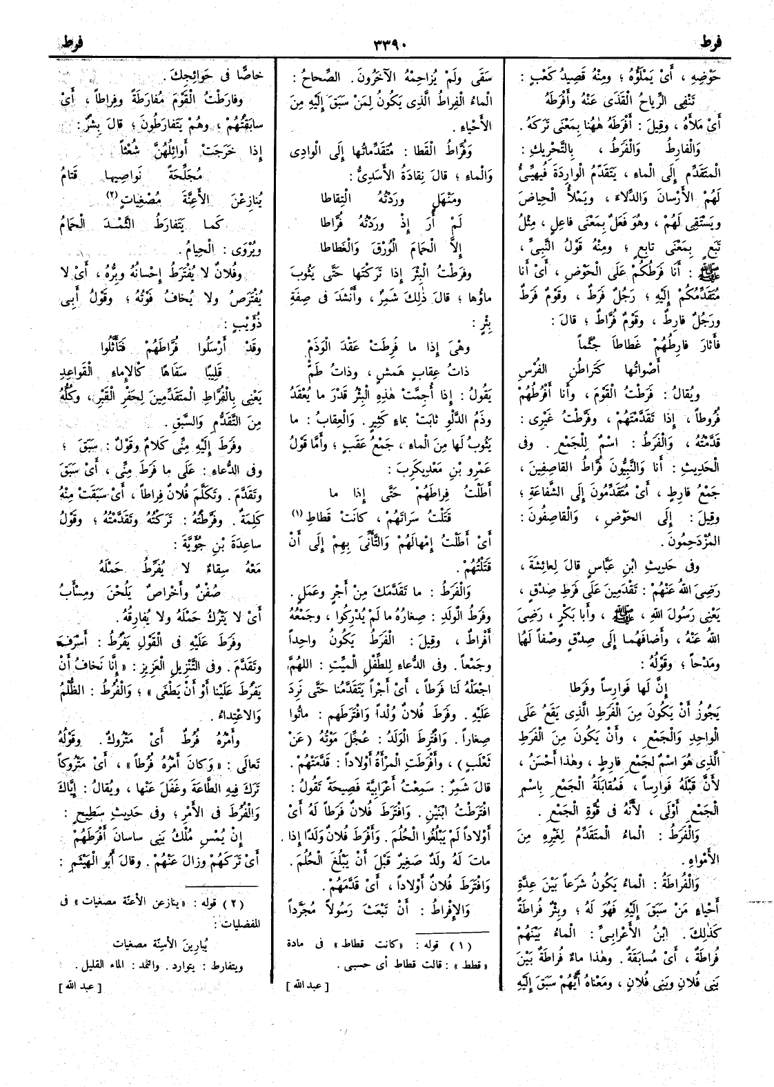 حوْضِه أَي يَمْلَؤُه ومنه قصيد كعب تَنْفي الرِّياحُ القَذَى عنه وأَفْرَطَه أَي ملأَه وقيل أَفْرَطَه ههنا بمعنى تركَه والفارِطُ والفَرَطُ بالتحريك المتقدِّم إِلى الماء يتقدَّمُ الوارِدةَ فُيهَيِّء لهم الأَرْسانَ والدِّلاءَ ويملأُ الحِياضَ ويستقي لهم وهو فَعَلٌ بمعنى فاعِلٍ مثل تَبَعٍ بمعنى تابِعٍ ومنه قول النبي صلّى اللّه عليه وسلّم أَنا فرَطُكم على الحوْضِ أَي أَنا متقدِّمُكم إِليه رجل فرَطٌ وقوم فرَطٌ ورجل فارِطٌ وقوم فُرَّاطٌ قال فأَثارَ فارِطُهم غَطاطاً حُثَّماً أَصْواتُها كتَراطُنٍ الفُرْسِ ويقال فرَطْتُ القومَ وأَنا أَفرُطُهم فُروطاً إِذا تقدَّمْتَهم وفرَّطْت غيري قدَّمْتُه والفَرَطُ اسم للجمع وفي الحديث أَنا والنبيّون فُرَّاطٌ لقاصِفينَ جمع فارِطٍ أَي متقدّمون إِلى الشَّفاعةِ وقيل إِلى الحوْضِ والقاصِفونَ المُزْدَحِمون وفي حديث ابن عباس قال لعائشة رضي اللّه عنهم تَقْدَمِينَ على فَرَطِ صِدْقٍ يعني رسولَ اللّه صلّى الله عليه وسلّم وأَبا بكر رضي اللّه عنه وأَضافهما إِلى صِدْقٍ وصفاً لهما ومَدْحاً وقوله إِنَّ لها فَوارِساً وفَرَطا يجوز أَن يكون من الفَرَط الذي يقع على الواحد والجمع وأَن يكون من الفَرط الذي هو اسم لجمع فارِطٍ وهذا أَحسن لأَن قبله فوارساً فَمُقابلة الجمع باسم الجمع أَوْلى في قوة الجمع والفَرَطُ الماء المتقدّمُ لغيره من الأَمْواه والفُراطةُ الماء يكون شَرَعاً بين عدَّةِ أَحْياء مَن سبَق إِليه فهو له وبئر فُراطةٌ كذلك ابن الأَعرابي الماء بينهم فُراطةٌ أَي مُسابَقة وهذا ماء فُراطة بين بني فلان وبني فلان ومعناه أَيُّهم سبَق إِليه سَقى ولم يُزاحِمْه الآخَرُون الصحاح الماء الفِراطُ الذي يكون لمن سبق إِليه من الأَحْياء وفُرَّاطُ القَطا متقدِّماتُها إِلى الوادي والماء قال نِقادَةُ الأَسدي ومَنْهَلٍ ورَدْتُه التِقاطا لم أَرَ غِذْ ورَدْتُه فُرّاطا إِلاَّ الحَمام الوُرْقَ والغَطاطا وفرَطْت البئرَ إِذا تركتَها حتى يَثوب ماؤها قال ذلك شمر وأَنشد في صفة بئر وهْيَ إِذا ما فُرِطَتْ عَقْدَ الوَذَمْ ذاتُ عِقابٍ همشٍ وذاتُ طَمْ يقول إِذا أُجِمَّتْ هذه البئرُ قَدْرَ ما يُعْقَدُ وذَمُ الدلْوِ ثابت بماء كثير والعِقابُ ما يَثوب لها من الماء جمع عَقبٍ وأَما قول عمْرو بن معديكرب أَطَلْتُ فِراطَهم حتى إِذا ما قَتَلْتُ سَراتَهم كانت قَطاطِ أَي أَطَلْت إِمْهالَهم والتَّأَني بهم إِلى أَن قتلتُهم والفرَطُ ما تقدَّمك من أَجْرٍ وعَمَل وفرَطُ الولد صِغاره ما لم يُدْرِكوا وجمعُه أَفراط وقيل الفرَطُ يكون واحداً وجمعاً وفي الدعاء للطِّفل الميت اللهم اجعله لنا فَرَطاً أَي أَجراً يتقدَّمُنا حتى نَرِدَ عليه وفرَطَ فلانٌ وُلْداً وافْتَرطَهم ماتوا صِغاراً وافْتُرِطَ الوَلدُ عُجِّلَ موتُه عن ثعلب وأَفرطَتِ المرأَةُ أَولاداً قدَّمتهم قال شمر سمعتُ أَعرابية فصيحة تقول افْتَرَطْتُ ابنينِ وافترَط فلان فرَطاً له أَي أَولاداً لم يبلغوا الحُلُم وأَفْرَطَ فلان ولداً إِذا مات له ولد صغير قبل أَن يبلغُ الحُلُم وافترط فلان أَولاداً أَي قدَّمهم والإِفْراط أَن تَبعث رسولاً مجرَّداً خاصّاً في حوائجك وفارَطْتُ القومَ مُفَارَطة وفِرطاً أَي سابقتُهم وهم يتَفارَطون قال بشر إِذا خَرَجَتْ أَوائلُهُنَّ شُعْثاً مُجَلِّحةً نَواصيها قتامُ يُنازِعْنَ الأَعِنَّةَ مُصْغِياتٍ كما يتَفارَطُ الثَّمْدَ الحَمامُ ويُروى الحِيامُ وفلانٌ لا يُفْتَرَطُ إِحسانه وبِرُّه أَي لا يُفْتَرص ولا يُخاف فَوْتُه وقول أَبي ذؤيب وقد أَرْسَلُوا فُرَّاطَهم فتَأَثَّلُوا قَلِيباً سَفاهاً كالإِماءِ القَواعِدِ يعني بالفُرَّاط المتقدِّمين لحفر القَبْرِ وكله من التقدُّم والسبقِ وفرَط إِليه مِنِّي كلامٌ وقولٌ سبَق وفي الدعاء على ما فرَط مِنِّي أَي سبق وتقدَّم وتكلم فلانٌ فِراطاً أَي سبقت منه كلمة وفَرَّطْته تركتُه وتقدّمته وقول ساعدة بن جؤية معه سِقاءٌ لا يُفَرِّط حَمْلَ