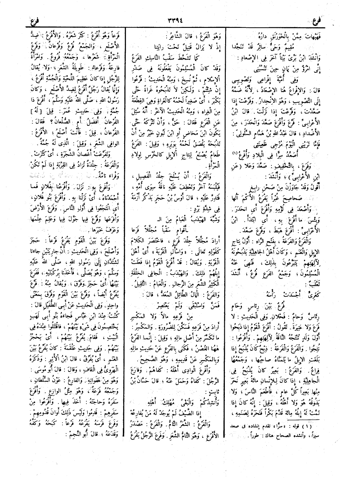 وفَرعَ بالتخفيف صَعَّدَ وعَلا عن ابن الأَعرابي وأَنشد أَقولُ وقد جاوَزْنَ مِنْ صَحْنِ رابِغٍ صَحاصِحَ غُبْراً يَفْرَعُ الأُكْمَ آلُها وأَصْعَدَ في لُؤْمِه وأَفْرَعَ أَي انحَدَرَ وبئس ما أَفْرَعَ به أَي ابتدأَ ابن الأَعرابي أَفْرَعَ هَبَطَ وفَرَّعَ صَعَّدَ والفَرَعُ والفَرَعَةُ بفتح الراء أَوَلُ نتاج الإِبل والغنم وكان أَهل الجاهلية يذبحونه لآلِهتهم يَتَبَرَّعُون بذلك فنُهِيَ عنه المسلمون وجمع الفَرَعِ فُرُعٌ أَنشد ثعلب كَغَرِيّ أَجْسَدَتْ رأْسه فُرُعٌ بَيْنَ رئاسٍ وحَامِ رئاس وحام فحلانِ وفي الحديث لا فَرَعَ ولا عَتِيرةَ تقول أَفْرَعَ القومُ إِذا ذبحوا أَوَّلَ ولدٍ تُنْتَجُه الناقة لآلِهتهم وأَفْرَعُوا نُتِجُوا والفرَعُ والفَرَعةُ ذِبْح كان يُذْبَحُ إِذا بلت الإِبل ما يتمناه صاحبها وجمعهما فِراعٌ والفَرَعُ بعير كان يذبح في الجاهلية إِذا كان للإِنسان مائة بعير نحر منها بعيراً كل عام فأَطْعَمَ الناسَ ولا يَذُوقُه هو ولا أَهلُه وقيل إِنه كان إِذا تمت له إِبله مائة قدَّم بكراً فنحره لصنمه وهو الفَرَع قال الشاعر إِذْ لا يَزالُ قَتِيلٌ تَحْتَ رايَتِنا كما تَشَحَّطَ سَقْبُ الناسِكِ الفَرَعُ وقد كان المسلمون يفعلونه في صدر الإِسلام ثم نسخ ومنه الحديث فَرِّعُوا إِن شئتم ولكن لا تَذْبَحوه غَراةً حتى يَكْبَرَ أَي صغيراً لحمه كالغَراة وهي القِطْعة من الغِراء ومنه الحديث الآخر أَنه سئل عن الفَرَعِ فقال حق وأَن تتركه حتى يكون ابن مخاضٍ أَو ابن لَبُونٍ خير من أَن تَذْبَحَه يَلْصَقُ لحمه بِوَبَرِه وقيل الفَرَعُ طعام يصنع لنَتاجِ الإِبل كالخُرْسِ لولادِ المرأَة والفَرَعُ أَن يسلخ جلد الفَصِيلِ فيُلْبَسَه آخَرُ وتَعْطِفَ عليه سِوَى أُمه فَتَدِرَّ عليه قال أَوس بن حجر يذكر أَزْمةً في شدَّة برد وشُبِّهَ الهَيْدَبُ العَبامُ مِنَ ال أَقوام سَقْباً مُجَلَّلاً فَرَعا أَراد مُجَلَّلاً جِلْدَ فَرَعٍ فاختصر الكلام كقوله واسأَلِ القرية أَي أَهل القرية ويقال قد أَفْرَعَ القومُ إِذا فعلت إِبلهم ذلك والهَيْدَبُ الجافي الخِلْقة الكثيرُ الشعر من الرجال والعَبامُ الثَّقِيلُ والفَرَعُ المال الطائلُ المُعَدّ قال فَمَنَّ واسْتَبْقَى ولم يَعْتَصِرْ مِنْ فَرْعِه مالاً ولا المَكْسِرِ أَراد من فَرَعِه فسكن للضرورة والمَكْسرُ ما تَكَسَّرَ من أَصل ماله وقيل إِنما الفَرْعُ ههنا الغُصْنُ فكنى بالفَرْعِ عن حديث ماله وبالمَكْسِرِ عن قديمه وهو الصحيح وأَفْرَعَ الوادي أَهلَه كَفاهُم وفارَعَ الرجلَ كفاه وحَمَلَ عنه قال حسان بن ثابت وأُنشِدُكُمْ والبَغْيُ مُهْلِكُ أَهْلِه إِذا الضَّيْفُ لم يُوجَدْ له مَنْ يُفارِعُهْ والفَرْعُ الشعر التام والفَرَعُ مصدر الأَفْرَعِ وهو التامُّ الشعَر وفَرِعَ الرجلُ يَفْرَعُ فَرَعاً وهو أَفْرَعُ كثر شعَره والأَفْرَعُ ضِدُّ الأَصْلَعِ وجمعهما فُرْعٌ وفُرْعانٌ وفَرْعُ المرأَة شعَرُها وجعه فُرُوعٌ وامرأَة فارِعةٌ وفَرْعاءُ طويلة الشعر ولا يقال للرجل إِذا كان عظيم اللحية والجُمَّة أَفْرَعُ وإِنما يقال رجل أَفْرَعُ لضدّ الأَصْلَع وكان رسول الله صلى الله عليه وسلم أَفْرَعَ ذا جُمَّة وفي حديث عمر قيل الفُرْعانُ أَفضَلُ أَمِ الصُّلْعانُففقال الفُرعان قيل فأَنت أَصْلَعُ الأَفْرَعُ الوافي الشعر وقيل الذي له جُمَّةٌ وتَفَرَّعَتْ أَغصانُ الشجرة أَي كثرت والفَرَعَةُ جِلدةٌ تزاد في القِرْبة إِذا لم تكن وفْراء تامة وأَفرَعَ به نزل وأَفرَعْنا بفلان فما أَحْمَدناه أَي نَزَلْنا به وأَفْرَعَ بنو فلان أَي انتجعوا في أَوّل الناس وفَرَعَ الأَرض وأَفْرَعَها وفرَّع فيها جوَّل فيها وعَلِمَ عِلْمَها وعَرَفَ خَبَرَها وفَرعَ بين القوم يَفْرَعُ فَرْعاً حَجَزَ وأَصلَح وفي الحديث أَن جاريتين جاءتا تَشْتَدّانِ إِلى رسول الله صلى الله عليه وسلم وهو يصلي فأَخذتا بركبتيه فَفَرَعَ بينهما أَي حَجَزَ وفرَّق ويقال منه فرَّع يُفَرِّعُ أَيضاً وفَر