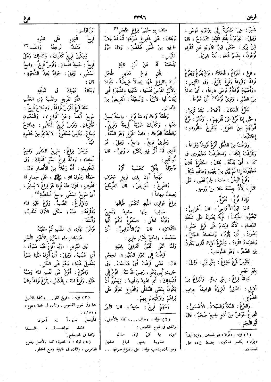 شمر هي منسوبة إِلى فِرْعَوْنِ موسى وقيل الفِرْعَوْنُ بلغة القِبْط التّمسَاح قال ابن بري حكى ابن خالويه عن الفراء فُرْعُون بضم الفاء لغة نادرة ( فرغ ) الفَراغُ الخَلاءُ فَرَغَ يَفْرَغُ ويَفْرُغُ فَراغاً وفُروغاً وفَرِغَ يَفْرَغُ وفي التنزيل وأَصْبَحَ فُؤادُ أُمِّ موسى فارِغاً أَي خالياً من الصبر وقرئ فُرُغاً أَي مُفَرَّغاً وفَرَّغَ المكانَ أَخلاه وقد قرئ حتى إِذا فُرِّغَ عن قلوبِهم وفسر فَرَّغَ قلوبَهم من الفَزَعِ وتَفْرِيغُ الظُّرُوفِ إِخْلاؤها وفَرَغْتُ من الشُّغُلِ أَفْرُغُ فُروغاً وفَراغاً وتَفَرَّغْتُ لكذا واستَفْرَغْتُ مَجْهُودِي في كذا أَي بذلتُه يقال اسْتَفْرَغَ فلان مَجْهُودَه إِذا لم يُبْق من جُهْدِه وطاقتِه شيئاً وفَرَغَ الرجلُ ماتَ مثل قَضَى على المثَل لأَن جسمه خَلا من رُوحِه وإِناءٌ فُرُغٌ مُفَرَّغٌ قال ابن الأَعرابي قال أَعرابي تَبَصَّرُوا الشَّيِّفانَ فإِنه يَصُوكُ على شَعَفةِ المَصادِ كأَنه قِرْشامٌ على فَرْغِ صَقْرٍ يَصُوك أَي يَلْزَمُ والمَصادُ الجبل والقِرْشامُ القُرادُ والفَرْغُ الإِناء الذي يكون فيه الصَّقْرُ وهو الدُّوشابُ وقَوْسٌ فُرُغٌ وفِراغٌ بغير وَتَرٍ وقيل بغير سَهْمٍ وناقة فِراغٌ بغير سِمةٍ والفِراغُ من الإِبل الصَّفِيُّ الغَزِيرةُ الواسِعةُ جِرابِ الضَّرْعِ والفَرْغُ السَّعةُ والسَّيَلانُ الأَصمعي الفِراغُ حَوْضٌ من أَدَمٍ واسِعٌ ضَخْمٌ قال أَبو النجم طافَ به جَنْبَيْ فِراغٍ عَثْجَل ويقال عنى بالفِراغِ ضَرْعها أَنه قد جَفَّ ما فيه من اللَّبَن فَتَغَضَّنَ وقال امرؤُ القيس ونَحَتْ له عن أَرزِ تالئة فِلْقٍ فِراغٍ مَعابِلٍ طُحْل أَراد بالفِراغِ ههنا نِصالاً عَرِضةً وأَراد بالأَرْزِ القَوْسَ نفسَها شبَّهها بالشجرة التي يقال لها الأَرْزةُ والمِعْبَلةُ العَرِيضُ من النِّصالِ وطَعْنةٌ فَرْغاءُ وذاتُ فَرْغٍ واسِعةٌ يَسِيلُ دَمُها وكذلك ضَرْبة فرِيغةٌ وفَرِيغٌ والطعنةُ الفَرْغاءُ ذات الفَرْغ وهو السَّعةُ وطرِيقٌ فرِيغٌ واسِعٌ وقيل هو الذي قد أُثِّرَ فيه لكثرة ما وُطِئَ قال أَبو كبير فأَجَزْتُه بأَفَلَّ تَحْسَبُ أَثْرَه نَهْجاً أَبانَ بِذِي فَرِيغٍ مَخْرَفِ والفَرِيغُ العرِيضُ قال الطرمّاح يصف سِهاماً فِراغٌ عَوارِي اللِّيطِ تُكْسَى ظُباتُها سَبائِبَ منها جاسِدٌ ونَجِيعُ وقوله تعالى سَنَفْرُغُ لكم أَيُّها الثَّقَلانِ قال ابن الأَعرابي أَي سَنَعْمِد واحتج بقول جرير ولَمَّا اتَّقَى القَيْنُ العَراقيَ بِاسْتِه فَرَغْتُ إلى العَبْدِ المُقَيَّدِ في الحِجْلِ قال معنى فَرَغْتُ أَي عَمَدْتُ وفي حديث أَبي بكر رضي الله عنه افْرُغْ إلى أَضْيافِك أَي اعْمِدْ واقْصِدْ ويجوز أَن يكون بمعنى التخَلّي والفَراغِ لتَتَوَفَّرَ على قِراهم والاشتِغالِ بهم وسَهْمٌ فَرِيغٌ حَدِيدٌ قال النَّمِر بن تَوْلَبٍ فَرِيغَ الغِرارِ على قدره فَشَكَّ نَواهِقَه والفَما وسِكِّينٌ فَرِيغٌ كذلك وكذلك رجل فَرِيغٌ حديد اللِّسانِ وفرس فَرِيغٌ واسِعُ المَشْي وقيل جَوادٌ بِعِيدٌ الشَّحْوةِ قال ويَكادُ يَهْلِكُ في تَنُوفَتِه شأْوُ الفَرِيغِ وعَقْبُ ذي العَقْبِ وقد فَرُغَ الفرسُ فَراغَةً وهِمْلاجٌ فَرِيغٌ سريع أَيضاً عن كراع والمَعْنَيانِ مُقْتَرِبانِ وفرس فَرِيغُ المَشْي هِمْلاجٌ وَساعٌ وفرس مُسْتَفْرِغٌ لا يَدَّخِرُ من حُضْرِه شيئاً ورجل فِراغٌ سريع المشي واسعُ الخِطاءِ ودابّة فِراغُ السَّيْرِ كذلك وفي الحديث أَن رجلاً من الأَنصار قال حَمَلْنا رسولَ اللهِ صلى الله عليه وسلم على حِمارٍ لنا قَطُوفٍ فنزل عنه فإِذا هو فِراغٌ لا يُسايَرُ أَي سَرِيعُ المَشْي واسعُ الخَطْوةِ