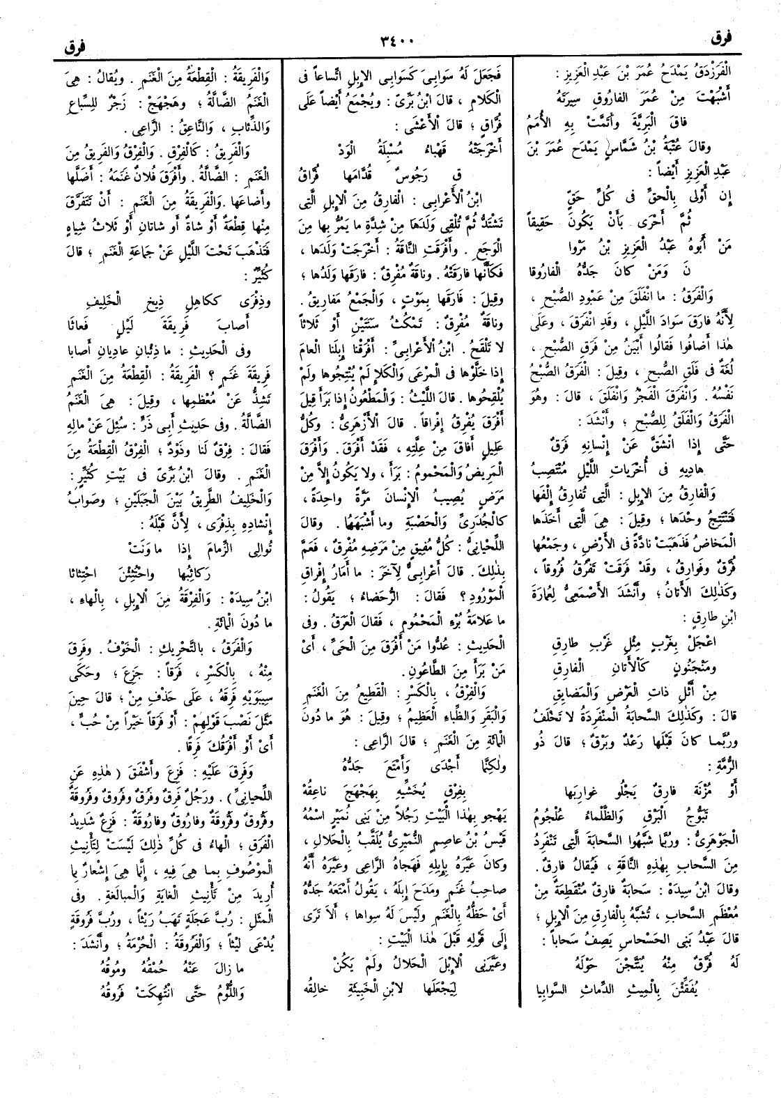 وقال الفرزدق يمدح عمر بن عبد العزيز أَشْبَهْتَ من عُمَرَ الفارُوقِ سِيرَتَهُ فاقَ البَرِيَّةَ وأْتَمَّتْ به الأُمَمُ وقال عتبة بن شماس يمدح عمر بن عبد العزيز أَيضاً إن أَوْلى بالحقّ في كلّ حَقٍّ ثم أَحْرَى بأَن يَكُونَ حَقِيقا مَنْ أَبوهُ عبدُ العَزِيزِ بنُ مَرْوا نَ ومَنْ كان جَدُّه الفارُوقا والفَرَقُ ما انفلق من عمود الصبح لأَنه فارَقَ سواد الليل وقد انْفَرَقَ وعلى هذا أَضافوا فقالوا أَبْين من فَرَق الصبح لغة في فَلَق الصبح وقيل الفَرَقُ الصبح نفسه وانْفَرَقَ الفجرُ وانْفَلَق قال وهو الفَرَق والفَلَقُ للصبح وأَنشد حتى إِذا انْشَقَّ عن إِنسانه فَرَقٌ هادِيهِ في أُخْرَياتِ الليلِ مُنْتَصِبُ والفارِقُ من الإِبل التي تُفارق إِلْفَها فَتَنْتَتِجُ وحدها وقيل هي التي أَخذها المَخاض فذهبت نادَّةً في الأَرض وجمعها فُرَّق وفَوارِق وقد فَرَقَتْ تَفْرُق فُروقاً وكذلك الأَتان وأَنشد الأَصمعي لعُمارة بن طارق اعْجَلْ بغَرْبٍ مثل غَرْبِ طارقِ ومَنْجَنُون كالأَتان الفارق من أَثْلِ ذاتِ العَرْض والمَضايقِ قال وكذلك السحابة المنفردة لا تخلف وربما كان قبلها رعد وبرق قال ذو الرمة أَو مُزْنَة فارِق يَجْلُو غوارِبَها تَبوُّجُ البرقِ والظلماءُ عُلْجُومُ الجوهري وربما شبهوا السحابة التي تنفرد من السحاب بهذه الناقة فيقال فارق وقال ابن سيده سحابة فارِقٌ منقطعة من معظم السحاب تشبه بالفارِقِ من الإِبل قال عبد بني الحَسْحاسِ يصف سحاباً له فُرَّقٌ منه يُنَتَّجْنَ حَوْلَهُ يفَقِّئْنَ بالمِيثِ الدِّماثِ السَّوابيا فجعل له سوابي كسوابي الإِبل اتساعاً في الكلام قال ابن بري ويجمع أَيضاً على فُرَّاق قال الأَعشى أَخرجَتْه قَهْباءُ مُسْبِلةُ الوَدْ قِ رَجُوسٌ قدَّامَها فُرّاقُ ابن الأَعرابي الفارقُ من الإِبل التي تشتد ثم تُلْقي ولدها من شدة ما يمرّ بها من الوجع وأَفْرَقَتِ الناقة أَخرجت ولدها فكأَنها فارَقَتْه وناقة مُفْرق فارقها ولدها وقيل فارقها بموت والجمع مَفارِيق وناقة مُفْرِق تمكث سنتين أَو ثلاثاً لا تَلْقَح ابن الأَعرابي أَفْرَقْنا إِبلَنا لعام إِذا خلَّوْها في المرعى والكلإِ لم يُنْتِجوها ولم يُلْقِحوها قال الليث والمطعون إِذا برأَ قيل أَفْرَق يُفْرِقُ إِفْراقاً قال الأَزهري وكل عَليلٍ أَفاق من علته فقد أَفْرَقَ وأَفْرَقَ المريضُ والمحْموم برأَ ولا يكون إِلا من مرض يصيب الإِنسان مرة واحدة كالجُدَرِيّ والحَصْبة وما أَشبههما وقال اللحياني كل مُفِيقٍ من مرضه مُفْرق فعَمّ بذلك قال أَعرابي لآخر ما أَمَارُ إِفْراقِ المَوْرود ؟ فقال الرُّحَضاءُ يقول ما علامة برء المحموم فقال العَرَق وفي الحديث عُدّوا مَنْ أَفْرقَ من الحيّ أَي من برأَ من الطاعون والفِرْقُ بالكسر القطيع من الغنم والبقر والظباء العظيمُ وقيل هو ما دون المائة من الغنم قال الراعي ولكنما أَجْدَى وأَمْتَعَ جَدُّهُ بفِرْق يُخَشِّيه بِهَجْهَجَ ناعِقُهْ يهجو بهذا البيت رجلاً من بني نُميرٍ اسمه قيس بن عاصم النُّميري يلقب بالحَلالِ وكان عَيَّره بإِبله فهجاه الراعي وعَيَّره أَنه صاحب غنم ومدح إِبله يقول أَمْتَعَهُ جدُّه أَي حظه بالغنم وليس له سواها أَلا ترى إِلى قوله قبل هذا البيت وعَيَّرَني الإِبْلَ الحَلالُ ولم يَكُنْ ليَجْعَلَها لابن الخَبِيثَةِ خالقُه والفَريقةُ القطعة من الغنم ويقال هي الغنم الضالة وهَجْهَجْ زجر للسباع والذِّئاب والناعق الراعي والفَريقُ كالفِرْقِ والفِرْقُ والفَريقُ من الغنم الضالة وأَفْرَقَ فلانٌ غنمه أَضلَّها وأَضاعها والفَريقةُ من الغنم أَن تتفرق منها قطعة أَو شاة أَو شاتان أَو ثلاث شياه فتذهب تحت الليل عن جماعة الغنم قال كثيِّر وذِفْرى ككاهِلِ ذِيخِ الخَلِيف أَصاب فَرِيقةَ ليلٍ فعاثَا وفي الحديث ما ذِئْبانِ عادِيانِ أَصابا فَريقة غنمٍ الفَرِيقةُ القطعة من الغنم تَشِذّ عن معظمها وقيل هي الغنم الضالة وفي حديث أَبي ذر سئل عن ماله فقال فِرْقٌ لنا وذَوْدٌ الفِ