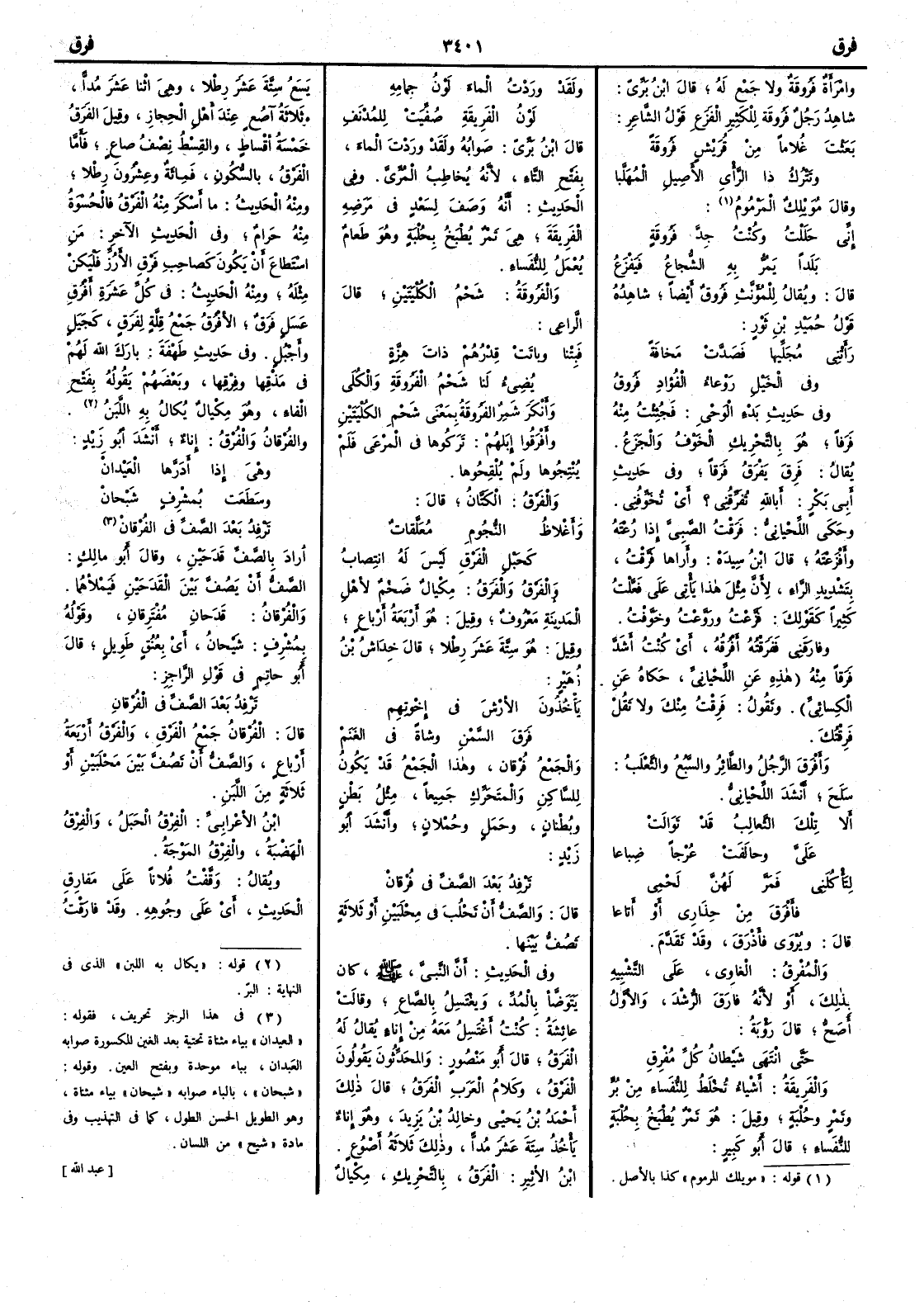 ( * قوله « يكال به اللبن » الذي في النهاية البرّ ) والفُرقان والفُرْقُ إِناء أَنشد أَبو زيد وهي إِذا أَدَرَّها العَيْدان وسطَعَت بمُشْرِفٍ شَبْحان تَرْفِدُ بعد الصَّفِّ في الفُرْقان أَراد بالصَّفّ قَدَحَيْن وقال أَبو مالك الصف أَن يصفَّ بين القدحين فيملأهما والفُرقان قدحان مفترقان وقوله بمشرف شبحان أَي بعنق طويل قال أَبو حاتم في قول الراجز ترفد بعد الصف في الفرقان قال الفُرْقان جمع الفَرْق والفَرْق أَربعة أَرباع والصف أَن تصفَّ بين محلبين أَو ثلاثة من اللبن ابن الأَعرابي الفِرْق الجبل والفِرْق الهَضْبة والفِرْق المَوْجة ويقال وَقَّفْتُ فلاناً على مَفارِقِ الحديث أَي على وجوهه وقد فارَقْتُ