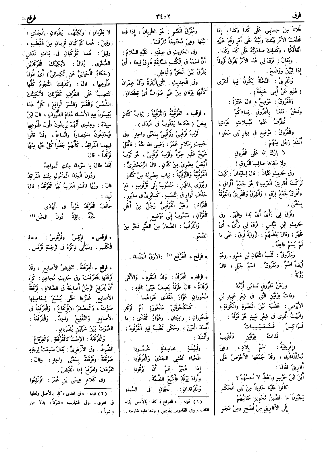 فلاناً من حسابي على كذا وكذا إِذا قطعتَ الأَمر بينك وبينه على أَمر وقع عليه اتفاقكما وكذلك صادَرْتُه على كذا وكذا ويقال فَرَقَ لي هذا الأَمرُ يَفْرُقُ فُرُوقاً إِذا تبين ووضح والفَرِيقُ النخلة يكون فيها أُخرى هذه عن أَبي حنيفة والفَرُوق موضع قال عنترة ونحن مَنَعْنا بالفَرُوقِ نساءَكُمْ نُطَرِّف عنها مُبْسِلاتٍ غَوَاشِيا والفُرُوق موضع في ديار بني سعد أَنشد رجل منهم لا بارَكَ اللهُ على الفُرُوقِ ولا سَقاها صائبَ البُرُوقِ وفي حديث عثمان قال لخَيْفان كيف تركتَ أَفارِيق العرب ؟ هو جمع أَفْراق وأَفْراقٌ جمع فِرْق والفِرْق والفَرِيقُ والفِرْقةُ بمعنى وفَرَقَ لي رأْيٌ أَي بدا وظهر وفي حديث ابن عباس فَرَقَ لي رأْيٌ أَي ظهر وقال بعضهم الرواية فُرِقَ على ما لم يسمَّ فاعله ومَفْروق لقب النعمان بن عمرو وهو أَيضاً اسم ومَفْرُوق اسم جبل قال رؤبة ورَعْنُ مَفْرُوقٍ تَسامى أُرَّمُهْ وذاتُ فِرقَيْن التي في شعر عَبيد بن الأَبرص هَضْبة بين البصرة والكوفة والبيت الذي في شعر عبيد هو قوله فَرَاكِسٌ فَثُعَيْلَباتٌ فذاتُ فِرْقَيْنِ فالقَليبُ وإفْريقيَةُ اسم بلاد وهي مخففة الياء وقد جمعها الأَحوص على أَفارِيق فقال أَين ابنُ حَرْبٍ ورَهْطٌ لا أَحُسُّهُمُ ؟ كانواعلينا حَديثاً من بني الحَكَمِ يَجْبُونَ ما الصِّينُ تَحْوِيهِ مَقانِبُهُمْ إلى الأَفارِيق من فخصْحٍ ومن عَجَمِ ومُفَرِّقُ الغنم هو الظِّرِبان إذا فَسا بينها وهي مجتمعة تفرقت وفي الحديث في صفته عليه السلام أَن اسمه في الكتب السالفة فَارِق لِيطا أَي يَفْرُقُ بين الحق والباطل وفي الحديث تأتي البقرة وآل عمران كأنهما فِرْقانِ من طير صَوافّ أَي قطعتان