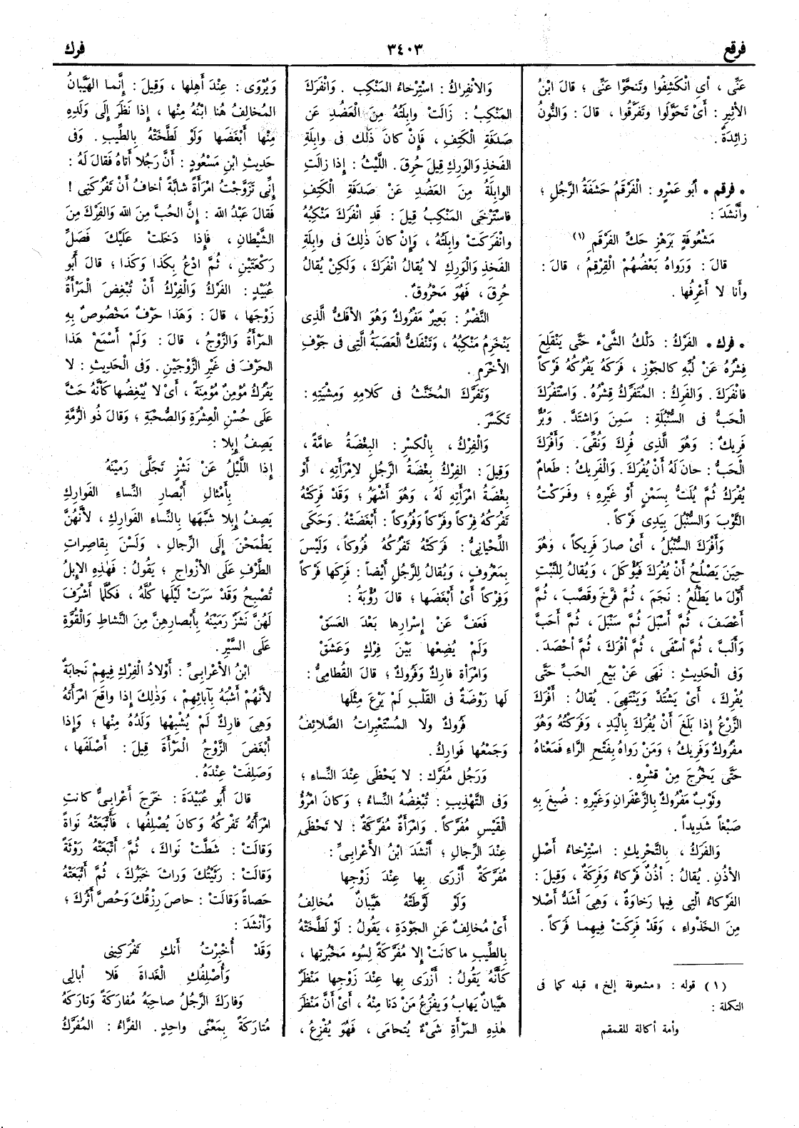 عني أَي انْكَشِفُوا وتَنَحَّوْا عني قال ابن الأَثير أَي تحوَّلوا وتَفَرَّقُوا قال والنون زائدة ( فرقم ) أبو عمرو الفَرْقَمُ حَشَفة الرجل وأَنشد مَشْعُوفةٍ بِرَهْزِ حَكِّ الفَرْقَم قال ورواه بعضهم القِرْقِم قال وأنا لا أعرفها( فرك ) الفَرْك دَلْكُ الشيء حتى ينقلع قِشْرُه عن لبِّه كالجَوْز فَرَكه يَفْرُكه فَرْكاً فانْفَرَك والفَرِكُ المُتَفَرِّك قشره واسْتَفْرَك الحبُّ في السُّنْبُلة سَمِنَ واشتدّ وبُرٌّ فرِيكٌ وهو الذي فُرِكَ ونُقِّي وأَفْرَك الحبُّ حان له أَن يُفْرك والفَرِيك طعام يُفْرك ثم يُلَتّ بسمن أَو غيره وفَرَكْتُ الثوب والسنبل بيدي فَرْكاً وأَفْرَكَ السنبلُ أَي صار فَرِيكاً وهو حين يَصْلُح أَن يُفْرَك فيؤكل ويقال للنبت أَوَّلَ ما يَطْلُع نجَمَ ثم فَرَّخَ وقَصَّبَ ثم أَعْصَفَ ثم أَسْبَلَ ثم سَنْبَل ثم أَحَبَّ وأَلَبَّ ثم أسْفى ثم أَفْرَكَ ثم أَحْصَدَ وفي الحديث نهى عن بيع الحَب حتى يُفْرِكَ أَي يَشْتَدَّ وينتهي يقال أَفْرَكَ الزرعُ إذا بلغ أَن يُفْرَك باليد وفَرَكْته وهو مفروك وفَرِيك ومن رواه بفتح الراء فمعناه حتى يخرج من قشره وثوب مَفْرُوك بالزعفران وغيره صبغ به صبغاً شديداً والفَرَكُ بالتحريك استرخاء أَصل الأُذن يقال أُذن فَرْكاء وفَرِكَةٌ وقيل الفَرْكاء التي فيها رَخاوة وهي أَشدّ أَصلاً من الخَذْواء وقد فَرِكَتْ فيهما فَرَكاً والإنْفِراكُ استرخاء المَنْكِب وانْفَرَك المَنْكِبُ زالت وابِلَتُه من العَضدُ عن صَدَفة الكتف فإن كان ذلك في وابلة الفخذ والورك قيل حُرق الليث إذا زالت الوابلة من العضد عن صدفة الكتف فاسترخى المنكب قيل قد انْفرك منكبه وانْفَركت وابلتُه وإن كان ذلك في وابلة الفخذ والورك لا يقال انْفرك ولكن يقال حُرِقَ فهو مَحْرُوق النضر بعير مَفْرُوك وهو الأَفَكُّ الذي ينخرم منكبه وتَنْفَكُّ العصبةُ التي في جوف الأخْرَم وتَفَرَّك المخنثُ في كلامه ومِشْيَته تَكَسَّرَ والفِرْكُ بالكسر البغْضَةُ عامّة وقيل الفِرْك بغْضَةُ الرجل لامرأَته أَو بغْضة امرأة له وهو أَشهر وقد فَرِكَتْه تَفْرَكُه فِرْكاً وفَرْكاً وفُروكاً أَبغضته وحكى اللحياني فَرَكَتْه تَفْرُكه فُروكاً وليس بمعروف ويقال للرجل أَيضاً فَرِكَها فَرْكاً وفِرْكاً أَي أَبغضها قال رؤبة فَعفَّ عن اسْرارِها بعد الغَسَقْ ولم يُضِعْها بين فِرْكٍ وعَشَقْ وامرأة فاركٌ وفَرُوكٌ قال القطامِيّ لها رَوْضَةٌ في القَلْبِ لم يَرْعَ مِثْلَها فَرُوكٌ ولا المُسْتَعْبِرات الصَّلائِفُ وجمعها فَوارِكُ ورجل مُفَرَّك لا يَحْظى عند النساء وفي التهذيب تُبْغِضهُ النساء وكان امرؤ القيس مُفَرَّكاً وامرأَة مُفَرَّكة لا تحظى عند الرجال أَنشد ابن الأَعرابي مُفَرَّكَة أَزْرى بها عند زَوْجِها ولو لَوَّطَتْه هَيَّبانٌ مُخالِفُ أَي مخالف عن الجَوْدة يقول لو لَطَّخته بالطيب ما كانت إلا مُفَرَّكة لسُوءِ مَخْبُرَتِها كأَنه يقول أَزرى بها عند زوجها مَنْظَرٌ هَيَّبانٌ يَهابُ ويَفْزَع من دنا منه أَي أَن مَنْظَر هذه المرأة شيءٌ يُتحامى فهو يُفْزِع ويروى عند أَهلها وقيل إنما الهَيَّبانُ المخالفُ هنا ابنُه منها إذا نظر إلى ولده منها أَبغضها ولو لطخته بالطيب وفي حديث ابن مسعود أَن رجلاً أَتاه فقاله له إني تزوَّجت امرأة شابة أَخاف أَن تَفْرُكَني فقال عبد الله إن الحُب من الله والفَرْك من الشيطان فإذا دخلت عليك فصلّ ركعتين ثم ادْعُ بكذا وكذا قال أَبو عبيد الفَرْك والفِرْك أَن تُبْغضَ المرأَة زوجها قال وهذا حرف مخصوص به المرأَة والزوجُ قال ولم أَسمع هذا الحرف في غير الزوجين وفي الحديث لا يَفْرُك مؤمنٌ مؤمنةً أَي لا يُبْغِضها كأَنه حث على حسن العشرة والصحبة وقال ذو الرمة يصف إبلاً إذا الليلُ عن نَشْزٍ تَجَلَّى رَمَيْنَهُ بأَمْثالِ أَبْصارِ النِّساء الفَوارِكِ يصف إبلاً شبهها بالنساء الفوارك لأَنهن يَطْمَحْن إلى الرجال ولسن بقاصرات الطرف على الأزواج يقول فهذه الإبل تُصْبِح وقد سَرَتْ 