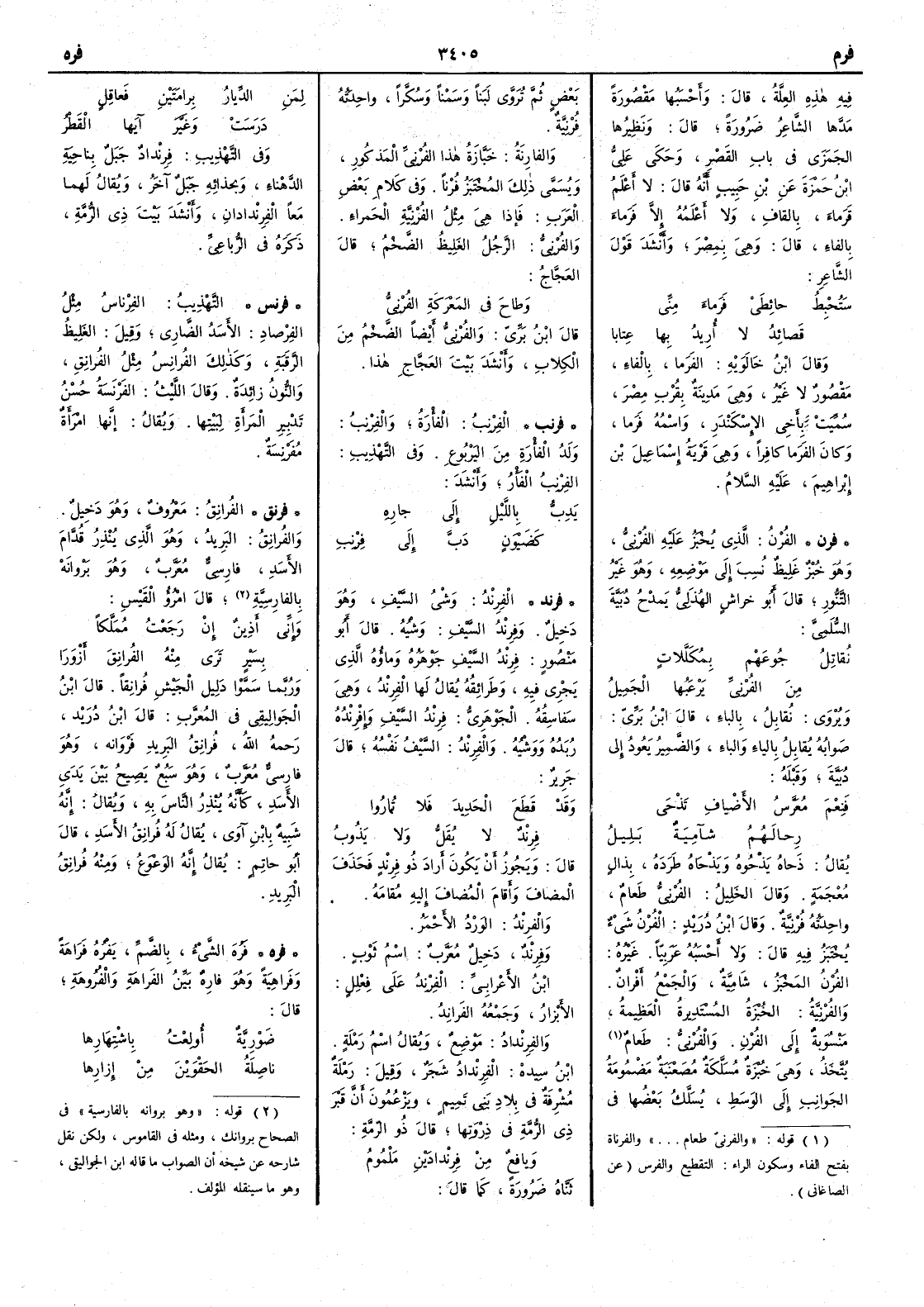 ( * قوله « وهو براونه بالفارسية » في الصحاح بروانك ومثله في القاموس ولكن نقل شارحه عن شيخه أن الصواب ما قاله ابن الجواليقي هو ما سينقله المؤلف ) قال امرؤ القيس وإني أَذِينٌ إن رَجَعْتُ مُمَلَّكاً بِسَيْرٍ تَرى منه الفُرانِقَ أَزْوَرَا وربما سموا دليل الجيش فُرانِقاً قال ابن الجواليقي في المعرب قال ابن دريد رحمه الله فُرانِقُ البَرِيدِ فَرْوَانه وهو فارسي معرب وهو سبع يصيح بين يدي الأَسد كأَنه يُنْذِرُ الناس به ويقال إنه شبيه بابن آوى يقال له فُرانِقُ الأَسد قال أَبو حاتم يقال إنه الوَعْوَعُ ومنه فُرانِقُ البَرِيدِ( فره ) فَرُهَ الشيءُ بالضم يَفُرُهُ فَرَاهَةً وفَراهِيَةً وهو فارِهٌ بيِّنُ الفَراهةِ والفُروهةِ قال ضَوْرِيَّةٌ أُولِعْتُ باشتِهارِها ناصِلَةُ الحَقْوَينِ من إزارِها