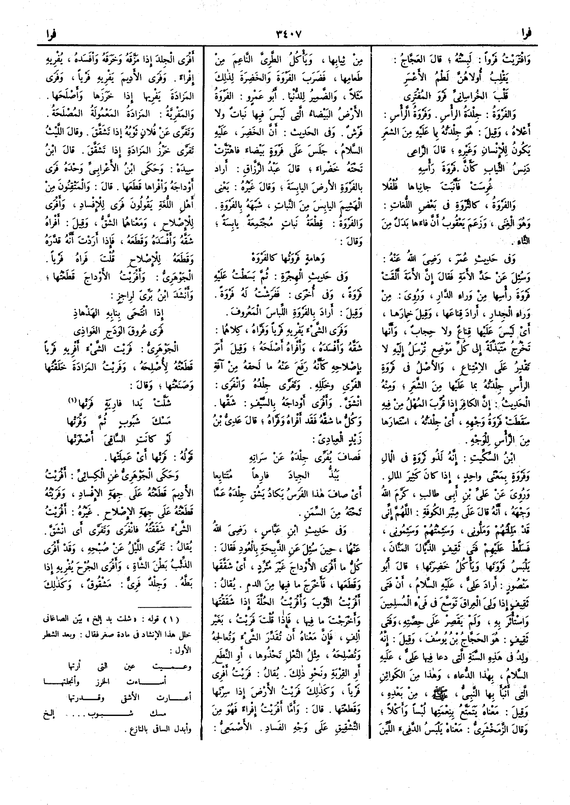 وافْتَرَيْت فَرْواً لَبِسته قال العجاج يَقْلِبُ أُولاهُنَّ لَطْم الأَعْسرِ قَلْبَ الخُراسانيِّ فَرْوَ المُفْترِي والفَرْوَة جِلدة الرأْس وفَرْوة الرأْس أَعْلاه وقيل هو جلدته بما عليه من الشعر يكون للإِنسان وغيره قال الراعي دَنِس الثِّياب كأَنَّ فَرْوَة رَأْسه غُرِسَتْ فأَنْبَت جانباها فُلْفُلا والفَروة كالثَّروة في بعض اللغات وهو الغنى وزعم يعقوب أَن فاءها بدل من الثاء وفي حديث عمر رضي الله عنه وسئل عن حدِّ الأَمة فقال إِن الأَمَة أَلقت فَرْوَة رأْسِها من وراء الدار وروي من وراء الجدار أَراد قِناعها وقيل خمارها أَي ليس عليها قناع ولا حِجاب وأَنها تخرج مُتَبَذِّلة إِلى كل موضع تُرْسَل إِليه لا تَقْدِر على الامتناع والأَصل في فروة الرأْس جلدته بما عليها من الشعر ومنه الحديث إِنَّ الكافر إِذا قُرِّبَ المُهْلُ مِن فيه سقطت فَرْوة وجهه أَي جلدته استعارها من الرأْس للوجه ابن السكيت إِنه لذو ثَرْوة في المال وفَروة بمعنى واحد إِذا كان كثير المال وروي عن علي بن أَبي طالب كرّم الله وجهه أَنه قال على منبر الكوفة اللهم إِني قد مَلِلْتُهم ومَلُّوني وسَئِمْتُهم وسَئِمُوني فسَلِّط عليهم فَتَى ثَقِيفٍ الذَّيَّالَ المَنَّانَ يَلْبَسُ فَرْوَتَها ويأْكل خَضِرَتَها قال أَبو منصور أَراد عليّ عليه السلام أَن فتى ثقيف إِذا ولي العراق توسَّع في فَيْء المسلمين واستأْثر به ولم يَقْتَصِر على حصته وفَتَى ثقيف هو الحَجَّاجُ بن يوسف وقيل إِنه ولد في هذه السنة التي دعا فيها عليّ عليه السلام بهذا الدعاء وهذا من الكَوائِن التي أَنبأَ بها النبي صلى الله عليه وسلم من بعده وقيل معناه يَتَمَتَّعُ بِنِعْمَتها لُبْساً وأَكلاً وقال الزمخشري معناه يلبس الدَّفيءَ اللَّيِّنَ من ثيابها ويأكل الطريَّ الناعم من طعامها فضرب الفَرْوة والخَضِرة لذلك مثلا والضمير للدنيا أَبو عمرو الفَرْوَة الأَرض البيضاء التي ليس فيها نبات ولا فَرْش وفي الحديث أَن الخَضِر عليه السلام جلس على فَرْوة بيضاء فاهتزت تحته خَضْراء قال عبد الرزاق أَراد بالفَرْوة الأَرضَ اليابسةَ وقال غيره يعني الهَشيم اليابس من النَّبات شبهه بالفَروة والفَروةُ قطعة نبات مجتمعة يابسة وقال وهامةٍ فَرْوَتُها كالفَرْوهْ وفي حديث الهجرة ثم بَسَطْتُ عليه فَرْوَةً وفي أُخرى فَفَرَشْتُ له فَرْوَةً وقيل أَراد بالفَرْوة اللِّباس المعروف وفَرَى الشيءَ يَفْرِيه فَرْياً وفَرَّاه كلاهما شقَّه وأَفسده وأَفراه أَصلحه وقيل أَمرَ بإِصلاحه كأَنه رَفَع عنه ما لحقه من آفة الفَرْي وخَلَلِه وتَفَرَّى جِلدُه وانْفَرَى انشقَّ وأَفْرَى أَوداجه بالسيف شقها وكل ما شقَّه فقد أَفْراه وفَرَّاه قال عَدِي بن زيد العبادي فصافَ يُفَرِّي جِلْدَه عن سَراتِه يَبُذُّ الجِياد فارِهاً مُتتايِعا أَي صافَ هذا الفَرسُ يكاد يشُق جلده عما تحته من السِّمَن وفي حديث ابن عباس رضي الله عنهما حين سئل عن الذَّبِيحة بالعُود فقال كلُّ ما أَفْرَى الأَوْداجَ غير مُثَرِّدٍ أَي شقَّقها وقطعها فأَخرج ما فيها من الدم يقال أَفْرَيت الثوبَ وأَفْريت الحُلَّة إِذا شقَقْتَها وأَخرجت ما فيها فإِذا قلت فَرَيت بغير أَلف فإِن معناه أَن تُقَدِّر الشيء وتُعالجه وتُصلحه مثل النَّعْل تَحْذُوها أَو النِّطَع أَو القِرْبة ونحو ذلك يقال فَرَيْت أَفْرِي فَرْياً وكذلك فَرَيْت الأَرض إِذا سرتها وقطعتها قال وأَما أَفْريْت إِفْراء فهو من التشقيق على وجه الفساد الأَصمعي أَفْرَى الجلد إِذا مَزَّقَه وخَرَقَه وأَفسده يُفْرِيه إِفْراء وفَرَى الأَدِيمَ يَفْرِيه فَرْياً وفَرَى المَزادة يَفْرِيها إِذا خَرَزَها وأَصلحها والمَفْرِيَّةُ المَزادة المَعْمُولة المُصْلَحة وتَفَرَّى عن فلان ثوبه إِذا تشقَّق وقال الليث تَفَرَّى خَرْز المزادة إِذا تشقق قال ابن سيده وحكى ابن الأَعرابي وحده فَرى أَوْداجَه وأَفْراها قطعها قال والمتقنون من أَهل اللغة يقولون فَرَى للإِفساد وأَفْرَى للإِصلاح 