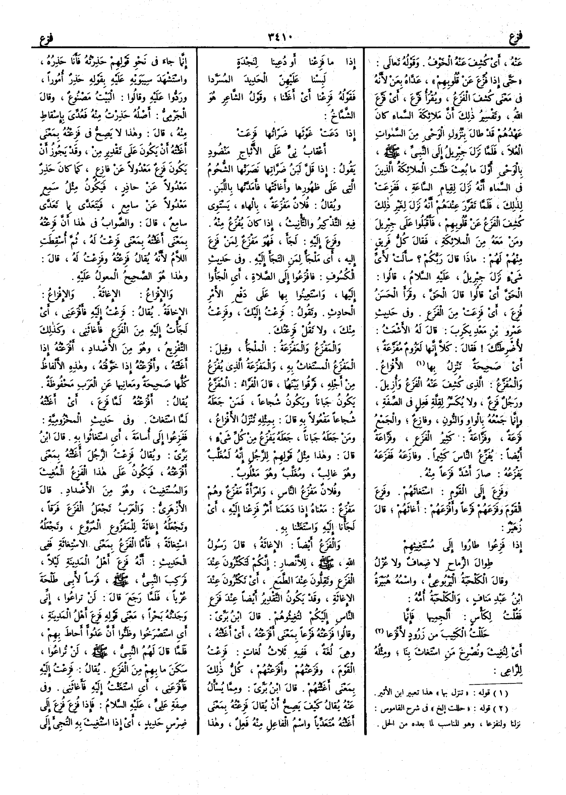 أَي لِنُغِيثَ ونُصْرِخَ مَنِ اسْتَغاثَ بنا مثله للراعي إِذا ما فَزِعْنا أَو دُعِينا لِنَجْدةٍ لَبِسْنا عليهنّ الحَدِيدَ المُسَرَّدا فقوله فَزِعْنا أَي أَغَثنا وقول الشاعر هو الشَّمّاخُ إِذا دَعَتْ غَوْثَها ضَرّاتُها فَزِعَتْ أَعْقابُ نَيٍّ على الأَثْباجِ مَنْضُودِ يقول إِذا قل لبن ضَرّاتها نَصَرَتْها الشُّحومُ التي على ظهورها وأَغاثَتْها فأَمدّتْها باللبن ويقال فلان مَفْزَعةٌ بالهاء يستوي فيه التذكير والتأْنيث إِذا كان يُفْزَعُ منه وفَزِعَ إِليه لَجَأَ فهو مَفْزَعٌ لمن فَزِعَ إِليه أَي مَلْجَأٌ لمن التَجَأَ إِليه وفي حديث الكسوف فافْزَعُوا إِلى الصلاة أي الجَؤُوا إِليها واستَعِينُوا بها على دَفْعِ الأَمرِ الحادِثِ وتقول فَزِعْتُ إِليك وفَزِعْتُ مِنْكَ ولا تقل فَزِعْتُكَ والمَفْزَعُ والمَفْزَعةُ الملجأ وقيل المفزع المستغاث به والمفزعة الذي يُفزع من أَجله فرقوا بينهما قال الفراء المُفَزَّعُ يكون جَباناً ويكون شُجاعاً فمن جعله شجاعاً مفعولاً به قال بمثله تُنْزَلُ الأَفزاع ومن جعله جباناً جعله يَفْزَعُ من كل شيء قال وهذا مثل قولهم للرجل إِنه لَمُغَلَّبٌ وهو غالبٌ ومُغَلَّبٌ وهو مغلوبٌ وفلان مَفْزَعُ الناسِ وامرأَة مَفْزَعٌ وهم مَفْزَعٌ معناه إِذا دَهَمَنا أَمر فَزِعْنا إِليه أَي لَجَأْنا إِليه واستغثنا به والفَزَعُ أََيضاً الإِغاثةُ قال رسول الله صلى الله عليه وسلم للأَنصار إِنكم لتكثرون عند الفَزَعِ وتَقِلُّونَ عند الطمَعِ أَي تكثرون عند الإِغاثة وقد يكون التقدير أيضاً عند فَزَعِ الناس إِليكم لتُغِيثُوهم قال ابن بري وقالوا فَزَعْتُه فَزْعاً بمعنى أَفْزَعْتُه أَي أَغَثْتُه وهي لغة ففيه ثلاث لغات فَزِعتُ القومَ وفَزَعْتُهم وأَفزَعْتُهم كل ذلك بمعنى أَغَثْتُهم قال ابن بري ومما يُسأَل عنه يقال كيف يصح أَن يقال فَزِعْتُه بمعنى أَغَثْتُه متعدياً واسم الفاعل منه فَعِلٌ وهذا إِنما جاء في نحو قولهم حَذِرْتُه فأَنا حَذِرُه واستشهد سيبويه عليه بقوله حَذِرٌ أُمُوراً وردوا عليه وقالوا البيت مصنوع وقال الجرمي أَصله حَذِرْتُ منه فعدّى بإِسقاط منه قال وهذا لا يصح في فَزِعْتُه بمعنى أَغثته أَن يكون على تقدير من وقد يجوز أَن يكون فَزِعٌ معدولاً عن فازِعٍ كما كانَ حَذِرٌ معدولاً عن حاذِر فيكون مثل سَمِعٍ عدولاً عن سامِعٍ فيتعدّى بما تعدى سامع قال والصواب في هذا أَن فَزِعْتُه بمعنى أَغثته بمعنى فزعت له ثم أُسقطت اللام لأَنه يقال فَزِعْتُه وفَزِعْتُ له قال وهذا هو الصحيح المعول عليه والإِفْزاعُ الإِغاثةُ والإِفْزاعُ الإِخافةُ يقال فَزِعْتُ إِليه فأَفْزَعَنِي أَي لَجَأْتُ إِليه من الفَزَعِ فأَغاثني وكذلك التفْزِيعُ وهو من الأَضداد أَفْزَعْتُه إِذا أَغَثْتَه وأَفْزَعْتُه إِذا خَوَّفْتَه وهذه الأَلفاظ كلها صحيحة ومعانيها عن العرب محفوظة يقال أَفْزَعْتُه لَمَّا فَزِعَ أَي أَغَثْتُه لَمَّا استغاثَ وفي حديث المخزومية فَفَزِعُوا إِلى أٌُسامةَ أَي استغاثوا به قال ابن بري ويقال فَزِعْتُ الرجلَ أغَثْتُهُ أَفْزَعْتُه فيكون على هذا الفَزِعُ المُغِيثَ والمُسْتَغِيثَ وهو من الأَضداد قال الأَزهري والعرب تجعل الفَزَعَ فَرَقاً وتجعله إِغاثة للمفزوعِ المُرَوَّعِ وتجعله استِغاثة فأَما الفزَعُ بمعنى الاستغاثة ففي الحديث أَنه فَزِعَ أَهلُ المدينة ليلاً فركب النبي صلى الله عليه وسلم فرساً لأَبي طلحة عُرْياً فلما رجع قال لن تراعُوا إِني وجدته بحراً معنى قوله فَزِعَ أَهل المدينة أَي اسْتَصْرَخوا وظنوا أَن عدوّاً أَحاط بهم فلما قال لهم النبي صلى الله عليه وسلم لن تراعوا سكن ما بهم من الفَزَع يقال فزِعْتُ إِليه فأَفْزَعَني أَي استغثت إِليه فأَغاثني وفي صفة عليّ عليه السلام فإِذا فُزِعَ فُزِعَ إلى ضِرْسٍ حديدٍ أَي إِذا استُغِيثَ به التُجِئَ إِلى