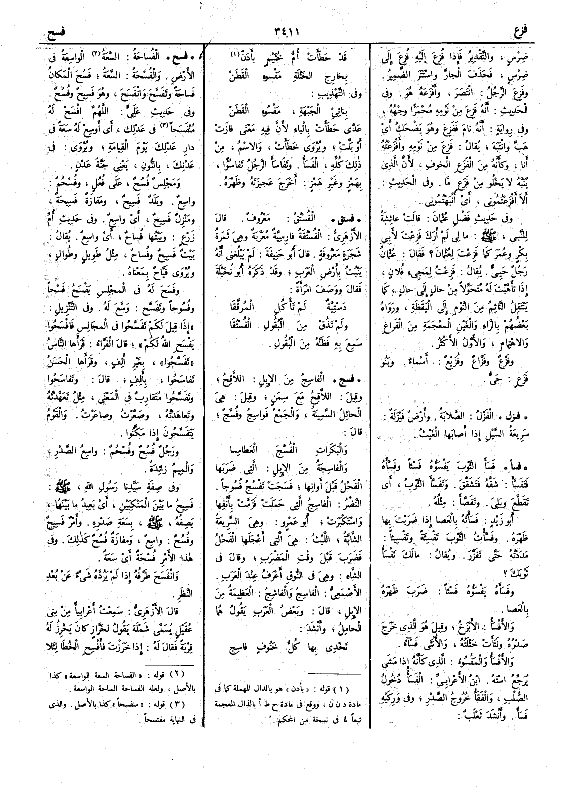 ( * قوله « منفسحاً » كذا بالأصل والذي في النهاية مفتسحاً ) في عَدْلِك أَي أَوسِع له سَعَةً في دار عَدْلك يوم القيامة ويروى في عَدْنِك بالنون يعني جنةَ عَدْنٍ ومَجَلِسٌ فُسُحٌ على فُعْل وفُسْحُمٌ واسع وبلد فَسِيحٌ ومَفازة فَسِيحة ومنزل فَسِيح أَي واسع وفي حديث أُم زَرْع وبيتُها فُساحٌ أَي واسع يقال بيت فَسيح وفُساح مثل طَويل وطُوال ويروى فَيَّاح بمعناه وفَسَحَ له المجلس يَفْسَحُ فَسْحاً وفُسُوحاً وتَفَسَّح وَسَّع له وفي التنزيل إِذا قيل لكم تَفَسَّحُوا في المجالس فافْسَحُوا يَفْسَح الله لكم قال الفراء قرأَها الناس تَفَسَّحُوا بغير أَلف وقرأَها الحسن تَفاسَحُوا بأَلف قال وتَفاسَحُوا وتَفَسَّحُوا متقاربٌ في المعنى مثل تَعَهَّدْتُه وتَعاهَدْتُه وصَعَّرْتُ وصاعَرْتُ والقومُ يَتَفَسَّحُون إِذا مَكَنُوا ورجل فُسُحٌ وفُسْحُمٌ واسع الصدر والميم زائدة وفي صفة سيدنا رسول الله صلى الله عليه وسلم فَسِيحُ ما بين المَنْكِبَينِ أَي بعيد ما بينهما يصفه صلى الله عليه وسلم بسعة صدره وأَمر فَسِيحٌ وفُسُحٌ واسع ومفازة فُسُحٌ كذلك وفي هذا الأَمر فُسْحةٌ أَي سَعة وانْفَسَح طَرْفُه إِذا لم يردّه شيء عن بُعْدِ النظر قال الأَزهري سمعت أَعرابيّاً من بني عُقَيْل يسمى شَمْلَة يقول لخَرَّازٍ كان يَخْرِزُ له قربةً فقال له إِذا خَرَزْت فأَفْسِحِ الخُطى لئلا