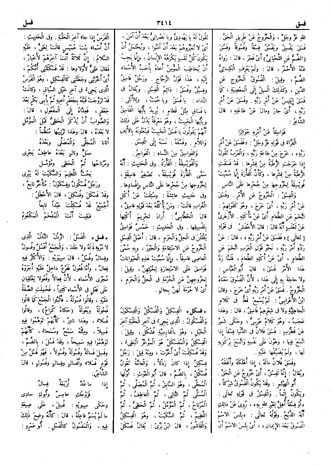 الله عز وجل والخروج عن طريق الحق فسَق يَفْسِقُ ويَفْسُقُ فِسْقاً وفُسوقاً وفَسُقَ الضم عن اللحياني أَي فَجَر قال رواه عنه الأَحمر قال ولم يعرف الكسائي الضم وقيل الفُسوق الخروج عن الدين وكذلك الميل إلى المعصية كما فَسَقَ إبليسُ عن أَمر ربه وفَسَق عن أمر ربه أَي جار ومال عن طاعته قال الشاعر فَواسِقاً عن أَمره جَوَائِرَا الفراء في قوله عز وجل فَفَسَقَ عن أَمر ربه خرج من طاعة ربه والعرب تقول إذا خرجت الرُّطَبةُ من قشرها قد فَسَقَت الرُّطَبةُ من قشرها وكأَن الفأرة إنما سميت فُويْسِقةً لخروجها من جُحْرها على الناس والفِسْقُ الخروج عن الأَمر وفَسَقَ عن أَمر ربه أَي خرج وهو كقولهم اتّخَمَ عن الطعام أي عن مَأْكله الأَزهري عن ثعلب أنه قال قال الأَخفش في قوله فَفَسَق عن أمر ربه قال عن ردّه أَمر ربه نحو قول العرب اتّخَمَ عن الطعام أي عن أَكله الطعام فلما رَدّ هذا الأَمر فَسَقَ قال أَبو العباس ولا حاجة به إلى هذا لأن الفُسُوقَ معناه الخروج فَسَقَ عن أَمر ربه أَي خرج وقال ابن الأَعرابي لم يُسْمع قَطُّ في كلام الجاهلية ولا في شعرهم فاسِقٌ قال وهذا عجب وهو كلام عربي وحكى شمر عن قطرب فَسَقَ فلان في الدنيا فِسْقاً إذا اتسع فيها وهَوَّنَ على نفسه واتسع بركوبه لها ولم يضيقها عليه وفَسَقَ فلان مالهُ إذا أَهلكه وأَنفقه ويقال إنه لفِسْقٌ أَي خروج عن الحق أَبو الهيثم والفِسْقُ في قوله أو فِسْقاً أهِلَّ لغير الله به روي عن مالك أَنه الذبح وقوله تعالى بئس الإسم الفُسُوقُ بعد الإيمان أَي بئس الإسم ن تقول له يا يهودي ويا نصراني بعد أَن آمن أَي لا تُعَيِّرهم بعد أَن آمنوا ويحتمل أَن يكون كلَّ لَقب يكرهه الإنسان وإنما يجب أَن يخاطب المؤمنُ أَخاه بأَحبّ الأَسماء إليه هذا قول الزجاج ورجل فَاسِقٌ وفِسِّيقٌ وفُسَقُ دائم الفِسْقِ ويقال في النداء يا فُسَق ويا خُبَث وللأُنثى يا فَسَاقِ مثل قَطامِ يريد يا أَيها الفَاسِقُ ويا أَيها الخبيث وهو معرفة يدل على ذلك أَنهم يقولون يا فُسَقُ الخبيثُ فينعتونه بالأَلف واللام وفَسَّقَه نسبه إلى الفِسْقِ والفوَاسِقُ من النساء الفواجرُ والفُوَيْسِقةُ الفأرة وفي الحديث أَنه سَمَّى الفأْرة فُوَيْسِقةً تصغير فاسِقَةٍ لخروجها من جُحْرها على الناس وإِفسادها وفي حديث عائشة وسئِلَتْ عن أَكل الغُراب قالت ومن يأْكله بعد قوله فاسِق قال الخطابي أراد تحريم أكلها بتَفْسِيقها وفي الحديث خَمْس فَوَاسِق يُقْتَلْنَ في الحِلّ والحرم قال أَصل الفِسْقِ الخروج عن الإستقامة والجور وبه سمي العاصي فاسقاً وإنما سميت هذه الحيوانات فَوَاسِقَ على الإستعارة لخبثهن وقيل لخروجهن عن الحرمة في الحل والحرم أَي لا حرمة لهن بحال