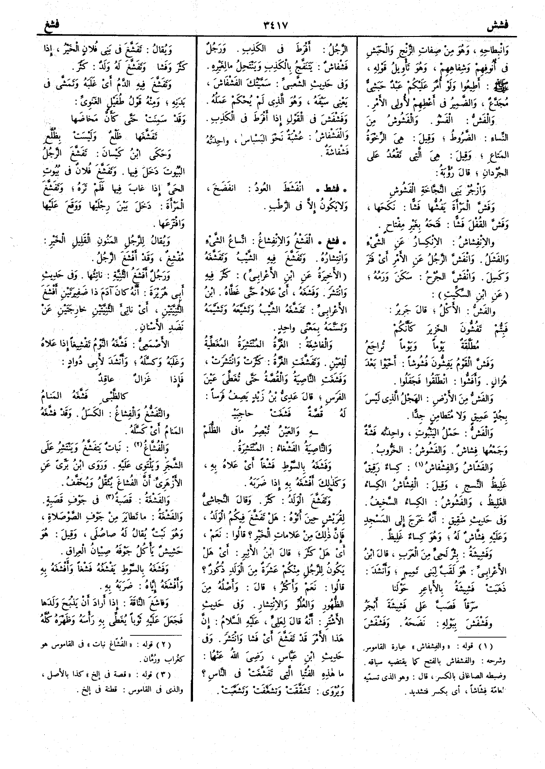وانْبِطاحه وهو من صفات الزَّنْجِ والخَبَشِ في أُنوفِهم وشِفاهِهم وهو تأْويل قوله صلى اللَّه عليه وسلم أَطيعوا ولو أُمِّر عليكم عبدٌ حبشِيٌّ مُجَدَّعٌ والضمير في أَعطهم لأُولي الأَمر والفَشُّ الفَسْوُ والفَشُوشُ من النساء الضَّرُوط وقيل هي الرَّخْوةُ المَتاعِ وقيل هي التي تقعد على الجُرْدان قال رؤبة وازْجُرْ بَني النجّاخةِ الغَشُوشِ وفَشَّ المرأَةَ يَفُشُّها فَشّاً نَكحَها وفَشَّ القُفْلَ فَشّاً فتَحه بغير مفتاح والانْفِشاش الانكسار عن الشيء والفَشَلُ وانْفَشَّ الرجل عن الأَمر أَي فَتَر وكَسِل وانْفَشَّ الجُرْح سكَن ورَمُه عن ابن السكيت والفَشُّ الأَكْل قال جرير فبِتُّم تَفُشُّون الخَزِيرَ كأَنَّكمْ مُطَلَّقةٌ يوماً ويوماً تُراجَعُ وفَشَّ القومُ يَفِشُّون فُشوشاً أَحْيَوْا بعد هُزال وأَفَشُّوا انطلقوا فجَفَلوا والفَشُّ من الأَرض الهَجْل الذي ليس بجُدٍّ عميق ولا مُتَطامِنِ جِدّاً والفَشّ حَمْل اليَنْبُوت واحدته فَشَّةٌ وجمعها فِشَاشٌ والفَشُوشُ الخَرُّوب والفِشّاش والفِشْفاش كساء رقيق غليظ النَّسج وقيل الفِشَّاشُ الكساء الغليظ والفَشُوش الكساء السَّخِيف وفي حديث شقيق أَنه خرَج إِلى المسجد وعليه فِشّاش له وهو كساء غليظ وفَشِيشةُ بئرٌ لحيّ من العرب قال ابن الأَعرابي هو لقب لبني تميم وأَنشد ذَهَبَتْ فَشِيشةُ بالأَباعِر حَوْلَنا سَرَقاً فصَبَّ على فَشِيشةَ أَبْجَرُ وفَشْفَشَ ببَوْله نضَحه وفَشْفَش الرجلُ أَفرط في الكذب ورجل فَشْفاش يَتَنَفّجُ بالكذب ويَنْتحِل ما لغيره وفي حديث الشعبي سَمَّيْتُك الفَشْفَاشَ يعني سَيْفَه وهو الذي لم يُحْكَم عملُه وفَشْفَشَ في القول إِذا أَفرط في الكذب والفَشْفاش عُشْبة نحو البَسْباسِ واحدته فَشْفاشة ( فشط ) انْفَشَطَ العُود انفَضَخَ ولا يكون إِلا في الرطْب
