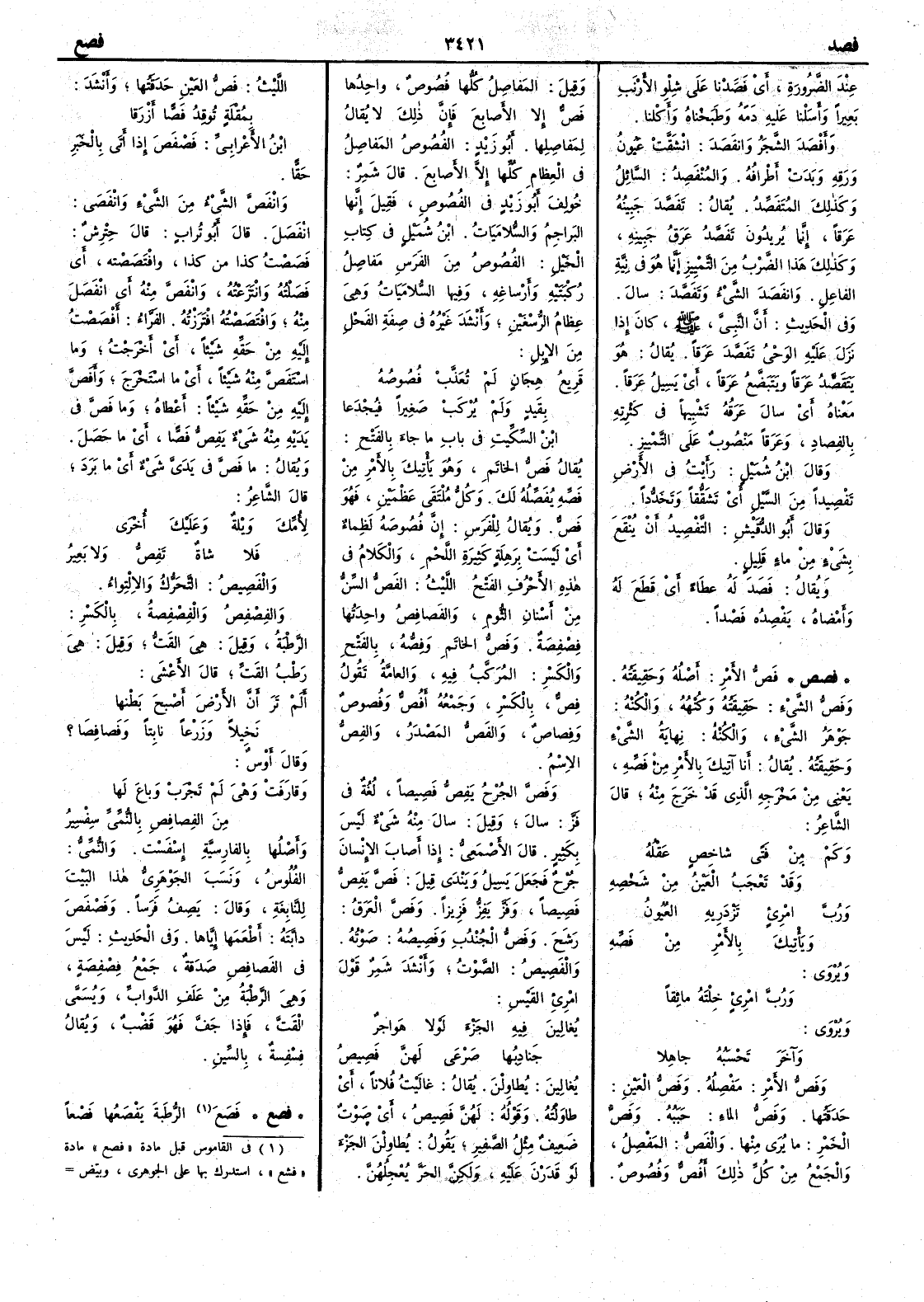 ( فصص ) فَصُّ الأَمرِ أَصلُه وحقيقتُه وفَصُّ الشيءِ حقيقتُه وكُنْهُه والكُنْهُ جوهرُ الشيء والكُنْهُ نهاية الشيء وحقيقتُه يقال أَنا آتيكَ بالأَمر من فَصِّه يعني من مخرجه الذي قد خرج منه قال الشاعر وكم من فتى شاخِص عَقْلُه وقد تَعْجَبُ العينُ من شَخْصِه ورُبّ امْرِئٍ تَزْدَرِيه العُيون ويَأْتِيكَ بالأَمر من فَصِّه ويروى ورُبّ امرئٍ خِلْتَهُ مائِقاً ويروى وآخَرَ تحسَبه جاهلا وفصُّ الأَمرِ مَفْصِلُه وفَصُّ العينِ حَدَقَتُها وفصُّ الماء حَبَبُه وفَصُّ الخمرِ ما يُرى منها والفَصُّ المَفْصِل والجمع من كل ذلك أَفُصٌّ وفُصوص وقيل المَفاصِلُ كلها فُصوص واحدها فَصّ إِلا الأَصابع فإِن ذلك لا يقال لمفاصلها أَبو زيد الفُصوصُ المفاصل في العظام كلها إِلا الأَصابع قال شمر خولف أَبو زيد في الفصوص فقيل إِنها البَراجِم والسُّلامَيات ابن شميل في كتاب الخيل الفصوص من الفَرس مفاصلُ ركبتيه وأَرساغه وفيها السلامَيات وهي عظامُ الرُّسْغَيْن وأَنشد غيره في صفة الفحل من الإِبل قَرِيعُ هِجَانٍ لم تُعَذَّبْ فُصوصُه بقيدٍ ولم يُرْكَبْ صغيراً فيُجْدَعا ابن السكيت في باب ما جاء بالفتح يقال فَصُّ الخاتَم وهو يأْتيك بالأَمر من فَصِّه يُفَصِّلُه لك وكل مُلْتَقَى عظمين فهو فَصٌّ ويقال للفرس إِن فُصُوصَه لَظِماء أَي ليست برَهِلة كثيرة اللحم والكلام في هذه الأَحرف الفتح الليث الفَصُّ السِّنُّ من أَسْنان الثُّوم والفَصافِصُ واحدتُها فِصْفِصَةٌ وفَصُّ الخاتم وفِصُّه بالفتح والكسر المُرَكَّبُ فيه والعامة تقول فِصّ بالكسر وجمعه أَفُصٌّ وفُصوصٌ وفِصاصٌ والفَصُّ المصدر والفِصُّ الاسم وفَصُّ الجُرْحُ يَفِصُّ فَصيصاً لغة في فزّ سال وقيل سالَ منه شيءٌ وليس بكثير قال الأَصمعي إِذا أَصابَ الإِنسانَ جرحٌ فجعل يَسِيل ويَنْدَى قيل فَصَّ يَفِصُّ فَصِيصاً وفَزَّ يَفِزُّ فَزِيزاً وفَصَّ العَرَقُ رشَح وفَصُّ الجندبِ وفَصِيصُه صوتُه والفَصِيص الصوت وأَنشد شمر قول امرئ القيس يُغالِينَ فيه الجَزْءَ لولا هَواجِرٌ جَنادِبُها صَرعَى لهنَّ فَصِيصُ يُغالِين يُطاوِلْنَ يقال غاليت فلاناً أَي طاوَلْته وقوله لهن فَصِيص أَي صوت ضعيف مثل الصفير يقول يُطاوِلْنَ الجزء لو قدرن عليه ولكن الحَرّ يُعْجِلُهن الليث فصُّ العين حدقتُها وأَنشد بمُقْلةٍ تُوقِدُ فَصّاً أَزْرقا ابن الأَعرابي فَصْفَصَ إِذا أَتَى بالخَبرِ حَقّاً وانفَصَّ الشيءُ من الشيءِ وانْفَصَى انفصل قال أَبو تراب قال حترش فَصَصْت كذا من كذا وافْتَصَصْته أَي فصلته وانتزعته وانْفَصَّ منه أَي انفصل منه وافْتَصَصْتُه افْتَرَزْته الفراء أَفْصَصْت إِليه من حَقِّه شيئاً أَي أَخْرَجْت وما اسْتَفَصَّ منه شيئاً أَي ما استخرج وأَفصَّ إِليه من حقه شيئاً أَعطاه وما فَصَّ في يديه منه شيء يَفِصُّ فَصّاً أَي ما حصل ويقال ما فَصَّ في يدي شيء أَي ما بَرَدَ قال الشاعر لأُمِّكَ وَيْلةٌ وعليكَ أُخرى فلا شاةٌ تَفِصُّ ولا بَعِيرُ والفَصِيصُ التحرُّكُ والالتواء والفِصْفِصُ والفِصْفِصةُ بالكسر الرَّطْبة وقيل هي القَتُّ وقيل هي رَطْبُ القَتِّ قال الأَعشى أَلم ترَ أَنَّ الأَرض أَصْبحَ بَطْنُها نَخِيلاً وزَرْعاً نابتاً وفَصافِصَا ؟ وقال أَوس وقارَفَتْ وهي لم تَجْرَبْ وباعَ لها من الفَصافِصِ بالنُّمِّيِّ سِفْسِيرُ وأَصلها بالفارسية إِسْفَسْت والنُّمِّيِّ الفُلوس ونسب الجوهري هذا البيت للنابغة وقال يصف فرساً وفَصْفَصَ دابتَه أَطْعَمَها إِيّاها وفي الحديث ليس في الفَصافِص صدَقةٌ جمع فِصْفِصة وهي الرَّطْبة من علَفِ الدوابّ ويُسمى القَتّ فاذا جفَّ فهو قَضْبٌ ويقال فِسْفِسة بالسين