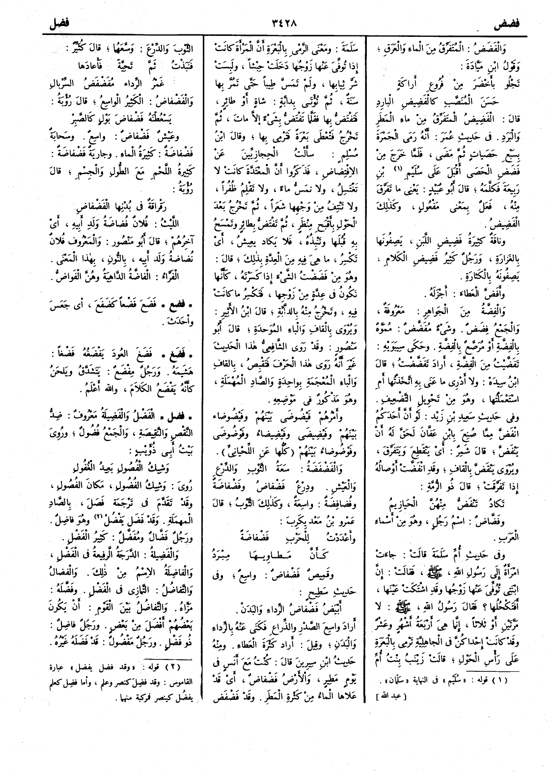 والفَضَضُ المتفرِّق من الماء والعَرَق وقول ابن مَيّادةَ تَجْلُو بأَخْضَرَ من فُروعِ أَراكةٍ حَسَن المُنَصَّبِ كالفَضِيضِ البارِدِ قال الفَضِيضُ المتفرِّقُ من ماءِ المطرِ والبَرَدِ وفي حديث عمر أَنه رَمى الجَمْرَةَ بسبع حَصَياتٍ ثم مضَى فلما خرج من فَضَضِ الحَصى أَقبل على سُلَيْم ابن رَبيعةَ فكلَّمه قال أَبو عبيد يعني ما تفرَّق منه فَعَلٌ بمعنى مَفْعُول وكذلك الفَضِيضُ وناقة كثيرةُ فَضِيضِ اللبن يَصِفُونها بالغَزارةِ ورجل كثير فَضِيض الكلام يصفونه بالكَثارة وأَفَضَّ العَطاءَ أَجْزَلَه والفِضَّةُ من الجواهر معروفة والجمع فِضَضٌ وشيءٌ مُفَضَّضٌ مُمَوَّه بالفضة أَو مُرَصَّعٌ بالفضة وحكى سيبويه تَفَضَّيْتُ من الفضة أَراد تَفَضَّضْت قال ابن سيده ولا أَدري ما عنَى به أَتخذْتُها أَم استعملتُها وهو من تحويل التضعيف وفي حديث سعيد بن زيد لو أَنَّ أَحدَكم انْفَضَّ مما صُنِعَ بابن عَفَّان لَحَقَ له أَن يَنْفَضّ قال شمر أَي يَنْقَطِعَ ويتفرّق ويروى يَنْقَضّ بالقاف وقد انْفَضَّتْ أَوصالُه إِذا تفرَّقت قال ذو الرمة تَكادُ تَنْفَضُّ منهنَّ الحَيازِيمُ وفَضّاضٌ اسم رجل وهو من أسماء العرب وفي حديث أم سلمة قالت جاءت امرأَة إِلى رسول اللّه صلّى اللّه عليه وسلّم فقالت إِن ابْنتي توُفِّيَ عنها زوجُها وقد اشْتَكَتْ عَيْنَها أَفَتَكْحُلُها ؟ فقال رسول اللّه صلّى اللّه عليه وسلّم لا مرتين أَو ثلاثاً إِنما هي أَربعةَ أَشهر وعَشْراً وقد كانت إِحْداكنَّ في الجاهلية تَرْمي بالبَعَرة على رأْس الحول قالت زينبُ بنتُ أُم سلَمَة ومعنى الرمي بالبعرة أَنَّ المرأَة كانت إِذا توُفِّيَ عنها زوجها حِفْشاً ولَبِسَتْ شَرَّ ثِيابِها ولم تَمَسَّ طِيباً حتى تَمُرَّ بها سنةٌ ثم تُؤْتَى بدابّةٍ حمارٍ أَو شاةٍ أَو طائر فَتَفْتَضُّ بها فقَلَّما تَفْتَضُّ بشيءٍ إِلا ماتَ ثم تخرج فتُعْطَى بعرةً فَتَرْمي بها وقال ابن مسلم سأَلت الحجازيين عن الافْتِضاضِ فذكروا أَن المعتدَّة كانت لا تَغْتَسِل ولا تَمَسُّ ماء ولا تَقْلِمُ ظُفْراً ولا تَنْتِفُ من وجهها شعراً ثم تخرج بعد الحوْلِ بأَقْبَحِ مَنْظَرٍ ثم تَفْتَضُّ بطائر وتَمْسَحُ به قُبُلَها وتَنْبِذُه فلا يكاد يَعِيشُ أَي تكسِرُ ما هي فيه من العِدَّة بذلك قال وهو من فَضَضْتُ الشيءَ إِذا كسَرْتَه كأَنها تكون في عِدَّةٍ من زوجها فتكسر ما كانت فيه وتخرج منه بالدابة قال ابن الأَثير ويروى بالقاف والباء الموحدة قال أَبو منصور وقد روى الشافعي هذا الحديث غير أَنه روى هذا الحرف فَتَقْبِضُ بالقاف والباء المعجمة بواحدة والصاد المهملة وهو مذكور في موضعه وأَمرهم فَيْضُوضَى بينهم وفَيْضُوضاء بينهم وفَيْضِيضَى وفَيْضيضاء وفَوْضُوضَى وفَوْضُوضاء بينهم كلها عن اللحياني والفَضْفَضَةُ سَعةُ الثوبِ والدِّرْعِ والعَيْشِ ودِرْعٌ فَضْفاضٌ وفَضْفاضةٌ وفُضافِضَةٌ واسِعةٌ وكذلك الثوبُ قال عمرو بن مَعْدِ يكَرِب وأَعْدَدْتُ للحَرْبِ فضْفاضةً كأَنَّ مَطاوِيَها مِبْرَدُ وقَمِيصٌ فَضْفاضٌ واسعٌ وفي حديث سطيح أَبْيَضُ فَضْفاضُ الرِّداءِ والبَدَنْ أَراد واسع الصدر والذراع فكنى عنه بالرداء والبدن وقيل أَراد كثرة العطاء ومنه حديث ابن سيرين قال كنت مع أَنَس في يوم مطر والأَرض فَضْفاضٌ أَي قد عَلاها الماء من كثرة المطر وقد فَضْفَضَ الثوبَ والدِّرْعَ وَسَّعَهما قال كثيِّر فنَبَذْتُ ثَمَّ تَحِيَّةً فأَعادَها غَمْرُ الرِّداءِ مُفَضْفَضُ السِّرْبالِ والفَضْفاضُ الكثيرُ الواسعُ قال رؤبة يَسْعُطْنَه فَضْفاضَ بَوْلٍ كالصَّبِرْ وعَيْشٌ فَضْفاضٌ واسعٌ وسَحابةٌ فَضْفاضةٌ كثيرة الماء وجارِيةٌ فَضْفاضة كثيرة اللحم مع الطُّولِ والجسم قال رؤبة رَقْراقةٌ في بُدْنِها الفَضْفاضِ الليث فلان فُضاضةُ ولد أَبيه أَي آخرهم قال أَبو منصور والمعروف فلان نُضاضةُ ولدِ أَبيه بالنون بهذا المعنى الفراء الفاضّةُ الدّاهِيةُ وهنّ الفواضُّ ( فضع ) فَضَعَ فَضْعاً كضَفَعَ 