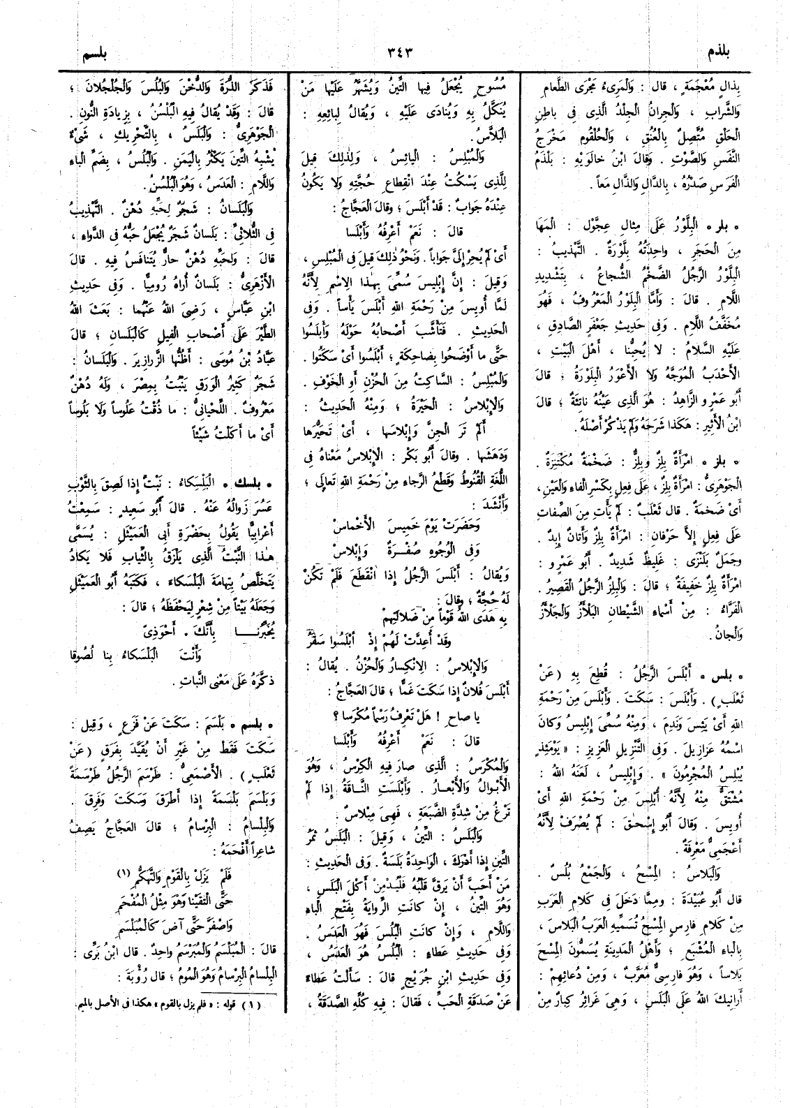 ( بلس ) أَبْلَسَ الرجلُ قُطِعَ به عن ثعلب وأَبْلَس سكت وأَبْلَسَ من رحمة اللَّه أَي يَئِسَ ونَدِمَ ومنه سمي إبليس وكان اسمه عزازيلَ وفي التنزيل العزيز يومئذ يُبْلِسُ المجرمون وإِبليس لعنة اللَّه مشتق منه لأَنه أُبْلِسَ من رحمة اللَّه أَي أُويِسَ وقال أَبو إِسحق لم يصرف لأَنه أَعجمي معرفة والبَلاسُ المِسْحُ والجمع بُلُسٌ قال أَبو عبيدَة ومما دخل في كلام العرب من كلام فارس المِسْحُ تسميه العرب البَلاسَ بالباء المشبع وأَهل المدينة يسمون المِسْحَ بَلاساً وهو فارسي معرب ومن دعائهم أَرانِيك اللَّهُ على البَلَسِ وهي غَرائِرُ كِبارٌ من مُسُوح يجعل فيها التَّين ويُشَهَّرُ عليها من يُنَكِّلُ به وينادى عليه ويقال لبائعه البَلاَّسُ والمُبْلِسُ اليائسُ ولذلك قيل للذي يسكت عند انقطاع حجته ولا يكون عنده جواب قد أَبْلَسَ وقال العجاج قال نَعَمْ أَعْرِفُه وأَبْلَسا أَي لم يُحِرْ إِليَّ جواباً ونحو ذلك قيل في المُبلِس وقيل إِن إِبليس سمي بهذا الاسم لأَنه لما أُويِسَ من رحمة اللَّه أَبْلَسَ يأَساً وفي الحديث فتأَشَّبَ أَصحابُه حوله وأَبْلَسُوا حتى ما أَوضحوا بضاحِكة أَبلسوا أَي سكتوا والمُبْلِسُ الساكت من الحزن أَو الخوف والإِبْلاسُ الحَيْرة ومنه الحديث أَلم تر الجِنَّ وإِبلاسَها أَي تَحَيُّرَها ودَهَشَها وقال أَبو بكر الإِبْلاسُ معناه في اللغة القُنُوط وقَطْعُ الرجاء من رحمة اللَّه تعالى وأَنشد وحَضَرَتْ يومَ خَمِيسٍ الأَخْماسْ وفي الوجوهِ صُفْرَةٌ وإِبْلاسْ ويقال أَبْلَسَ الرجلُ إِذا انقطع فلم تكن له حجة وقال به هَدَى اللَّهُ قوماً من ضلالَتِهِمْ وقد أُعِدَّتْ لهم إِذ أَبْلَسُوا سَقَرُ والإِبْلاسُ الانكسار والحزن يقال أَبْلَسَ فلان إِذا سكت غمّاً قال العجاج يا صاحِ هل تَعْرِفُ رَسْماً مُكْرَسا ؟ قال نعم أَعْرِفُه وأَُبْلَسا والمُكْرَسُ الذي صار فيه الكِرْسُ وهو الأَبوال والأَبعار وأَبْلَسَتِ الناقة إِذا لم تَرْغُ من شدة الضَّبْعَة فهي مِبْلاس والبَلَسُ التِّينُ وقيل البَلَسُ ثمر التين إذا أَدرك الواحدة بَلَسَةٌ وفي الحديث من أَحب أَن يَرِقَّ قلبه فلْيُدْمِنْ أَكل البَلَس وهو التين إِن كانت الرواية بفتح الباء واللام وإِن كانت البُلُسَ فهو العَدَسُ وفي حديث عطاء البُلُس هو العدس وفي حديث ابن جُرَيْج قال سأَلت عطاء عن صدقة الحَبِّ فقال فيه كُلِّه الصدقةُ فذكر الذُّرَةَ والدُّخْنَ والبُلُس والجُلْجُلانَ قال وقد يقال فيه البُلْسُنُ بزيادة النون الجوهري والبَلَس بالتحريك شيء يشبه التين يكثر باليمن والبُلُس بضم الباء واللام العدس وهو البُلْسُن والبَلَسانُ شجر لحبه دُهْن التهذيب في الثلاثي بَلَسانٌ شجر يجعل حبه في الدواء قال ولحبه دهن حار يتنافس فيه قال الأَزهري بَلَسان أُراه روميّاً وفي حديث ابن عباس رضي اللَّه عنهما بعث اللَّه الطير على أَصحاب الفيل كالبَلَسان قال عَبَّاد بن موسى أَظنها الزَّرازيرَ والبَلَسانُ شجر كثير الورق ينبت بمصر وله دهن معروف اللحياني ما ذُقْتُ عَلوساً ولا بَلُوساً أَي ما أَكلت شيئاً