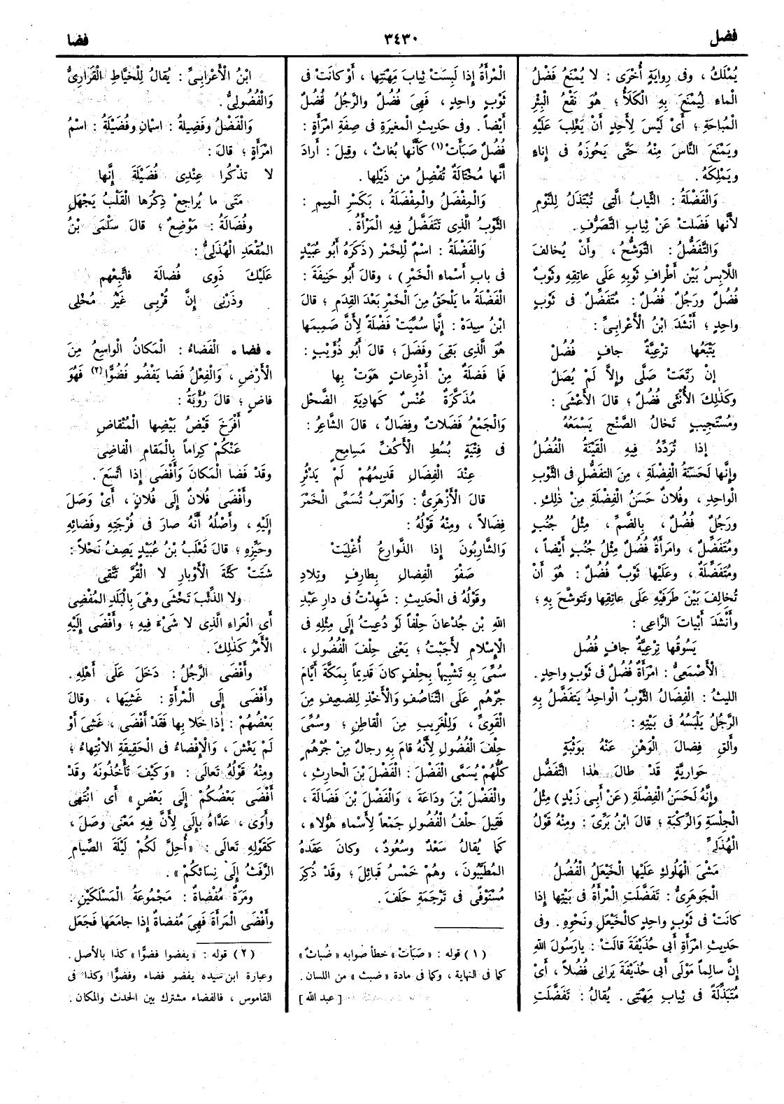 يملَك وفي رواية أُخرى لا يمنع فَضْل الماء ليمنع به الكَلأ هو نَفْع البئر المُباحة أَي ليس لأَحد أَن يغلب عليه ويمنع الناس منه حتى يحوزه في إِناء ويملكه والفَضْلة الثياب التي تبتذل للنوم لأَنها فَضلت عن ثياب التصرُّف والتفضُّل التوشُّح وأَن يخالف اللابس بين أَطراف ثوبه على عاتِقِه وثوب فُضُل ورجل فُضُل متفضِّل في ثوب واحد أَنشد ابن الأَعرابي يَتْبَعها تِرْعِيَّة جافٍ فُضُل إِنْ رَتَعَتْ صَلَّى وإِلاَّ لم يُصَل وكذلك الأُنثى فُضُل قال الأَعشى ومُسْتَجِيبٍ تَخال الصَّنْجَ يَسْمَعُه إِذا تُرَدّدُ فيه القَيْنَةُ الفُضُلُ وإِنها لحسَنة الفِضْلة من التفضُّل في الثوب الواحد وفلان حسَن الفِضْلة من ذلك ورجل فُضُل بالضم مثل جنُب ومُتَفَضِّل وامرأَة فُضُل مثل جُنُب أَيضاً ومُتَفَضِّلة وعليها ثوب فُضُل وهو أَن تخالف بين طرفيه على عاتقها وتتوشَّح به وأَنشد أَبيات الراعي يَسُوقها تِرْعِيَّة جافٍ فُضُل الأَصمعي امرأَة فُضُل في ثوب واحد الليث الفِضَال الثوب الواحد يتفضَّل به لرجل يلبسه في بيته وأَلقِ فِضالَ الوَهْن عنه بوَثْبَةٍ حَواريَّةٍ قد طال هذا التَّفَضُّل وإِنه لحسَن الفِضْلة عن أَبي زيد مثل الجِلْسة والرِّكْبة قال ابن بري ومنه قول الهذلي مَشْيَ الهَلُوكِ عليه الخَيْعَل الفُضُل الجوهري تَفَضَّلَت المرأَة في بيتها إِذا كانت في ثوب واحد كالخَيْعَل ونحوه وفي حديث امرأَة أَبي حذيفة قالت يا رسول الله إِن سالماً مولى أَبي حذيفة يراني فُضُلاً أَي متبذلة في ثياب مَهْنَتي يقال تفضَّلت المرأَة إِذا لبست ثياب مَِهْنَتِها أَو كانت في ثوب واحد فهي فُضُل والرجُلُ فُضُل أَيضاً وفي حديث المغيرة في صِفة امرأَة فُضُل صَبَأَتْ كأَنها بُغاثٌ وقيل أَراد أَنها مُختالة تُفْضِل من ذيلها والمِفْضَل والمِفْضَلة بكسر الميم الثوب الذي تتفضَّل فيه المرأَة والفَضْلة اسم للخمر ذكره أَبو عبيد في باب أَسماء الخمر وقال أَبو حنيفة الفَضْلة ما يلحق من الخَمْر بعد القِدَم قال ابن سيده وإِنما سميت فَضْلة لأَن صَمِيمها هو الذي بقي وفَضَل قال أَبو ذؤيب فما فَضْلة من أَذْرِعات هَوَتْ بها مُذكَّرَة عُنْسٌ كَهادِية الضَّحْل والجمع فَضَلات وفِضَال قال الشاعر في فِتْيَةٍ بُسُطِ الأَكُفِّ مَسامِحٍ عند الفِضَال قديمُهم لم يَدْثُرِ قال الأَزهري والعرب تسمي الخمر فِضَالاً ومنه قوله والشَّارِبُون إِذا الذَّوارِعُ أُغْلِيَتْ صَفْوَ الفِضالِ بِطارِفٍ وتِلادِ وقوله في الحديث شهدت في دار عبد الله بن جُدْعان حِلْفاً لو دُعِيت إِلى مثله في الإِسلام لأَجَبْت يعني حِلْف الفُضُول سمي به تشبيهاً بحلْف كان قديماً بمكة أَيّام جُرْهُم على التناصف والأَخذ للضعيف من القويِّ والغريب من القاطِن وسمي حِلْف الفُضُول لأَنه قام به رجال من جُرْهُم كلهم يسمى الفَضْل الفضل بن الحرث والفضل بن وَدَاعة والفضل بن فَضَالة فقيل حِلْف الفُضُول جمعاً لأَسماء هؤلاء كما يقال سَعْد وسُعود وكان عقَده المُطَيَّبون وهم خَمْس قبائل وقد ذكر مستوفى في ترجمة حلف ابن الأَعرابي يقال للخيَّاط القَرارِيُّ والفُضُولِيُّ والفَضْل وفَضِيلة اسمان وفُضَيْلة اسم امرأَة قال لا تذْكُرا عندي فُضَيْلة إِنها متى ما يراجعْ ذِكْرها القَلْب يَجْهَلِ وفُضَالة موضع قال سلمى بن المقعد الهذلي عليكَ ذَوِي فضالة فاتَّبِعْهم وذَرْني إِن قُرْبي غير مُخْلي