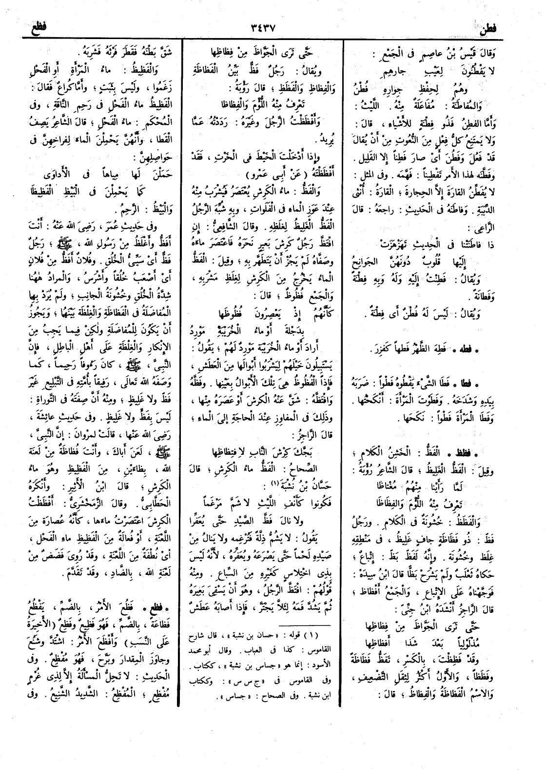 وقال قَيْسُ بنُ عاصمٍ في الجمع لا يَفْطُنُونَ لعَيْبِ جارِهِمِ وهُمُ لِحِفْظِ جِوارِه فُطْنُ والمُفاطَنَةُ مُفَاعلة منه الليث وأَما الفَطِنُ فذو فِطْنَةٍ للأَشياء قال ولا يمتنع كل فعل من النعوت من أَن يقال قد فَعُلَ وفَطُنَ أَي صار فَطِناً إلا القليل وفَطَّنه لهذا الأَمر تَفْطِيناً فَهَّمَه وفي المثل لا يُفطِّنُ القارَةَ إِلا الحِجارة القارةُ أُنثى الذِّئَبةِ وفاطَنَةُ في الحديث راجَعَه قال الراعي إِذا فاطَنَتْنا في الحديثِ تَهَزْهَزَتْ إِليها قلوبٌ دونهن الجَوانِحُ ويقال فَطِنْتُ إِليه وله وبه فِطْنَةً وفَطانة ويقال ليس له فُطْنٌ أَي فِطْنةٌ ( فطه ) فَطِهَ الظهرُ فَطَهاً كفَزِرَ ( فطا ) فَطَا الشيءَ يَفْطُوه فَطْواً ضربه بيده وشَدَخَه وفَطَوْتُ المرأَةَ أَنْكَحْتها وفَطَا المرأَة فَطْواً نكَحها ( فظظ ) الفظُّ الخَشِنُ الكلام وقيل الفظ الغليظ قال الشاعر رؤبة لما رأَينا منهمُ مُغتاظا تَعْرِف منه اللُّؤْمَ والفِظاظا والفَظَظُ خشونة في الكلام ورجل فَظٌّ ذو فَظاظةٍ جافٍ غليظٌ في مَنطقِه غِلَظٌ وخشونةٌ وإِنه لَفَظٌّ بَظٌّ إِتباع حكاه ثعلب ولم يشرح بَظّاً قال ابن سيده فوجهناه على الإِتباع والجمع أَفظاظ قال الراجز أَنشده ابن جني حتى تَرى الجَوَّاظَ من فِظاظِها مُذْلَوْلِياً بعد شَذا أَفظاظِها وقد فَظِظْتَ بالكسر تَفَظُّ فَظاظةً وفَظَظاً والأَول أَكثر لثقل التضعيف والاسم الفَظاظةُ والفِظاظ قال حتى ترى الجَوّاظ من فِظاظِها ويقال رجل فَظٌّ بَيِّنُ الفَظاظةِ والفِظاظِ والفَظَظِ قال رؤبة تَعْرِفُ منه اللُّؤْمَ والفِظاظا وأَفْظَظْت الرجلَ وغيرَه ردَدته عما يريد وإِذا أَدْخَلْتَ الخيطَ في الخَرْتِ فقد أَفْظَظْتَه عن أَبي عمرو والفَظُّ ماء الكرش يُعتصر فيُشرب منه عند عَوَزِ الماء في الفلوات وبه شبه الرجل الفظ الغليظ لغِلَظِه وقال الشافعي إِن افتظَّ رجل كرش بعير نحره فاعتصر ماءه وصَفَّاه لم يجز أَن يتطهر به وقيل الفَظُّ الماءُ يخرج من الكرش لغلظ مَشْرَبِه والجمع فُظوظ قال كأَنهُمُ إِذْ يَعْصِرون فُظوظَها بدَجْلةَ أَو ماءُ الخُرَيبةِ مَوْرِدُ أَراد أَو ماء الخُرَيْبةِ مَوْرِدٌ لهم يقول يستبيلون خيلَهم ليشربوا أَبوالها من العطش فإِذاً الفُظوظُ هي تلك الأَبوال بعينها وفظَّه وافْتَظَّه شقَّ عنه الكرش أَو عصره منها وذلك في المفاوز عند الحاجة إِلى الماء قال الراجز بَجَّك كِرْشَ النابِ لافتظاظها الصحاح الفَظُّ ماء الكرش قال حسان بن نُشْبة فكونوا كأَنْفِ اللَّيثِ لا شَمَّ مَرْغَماً ولا نال فَظَّ الصيدِ حتى يُعَفِّرا يقول لا يَشُمُّ ذِلَّةً فتُرْغِمَه ولا يَنال من صيده لحماً حتى يصرعه ويُعَفِّره لأَنه ليس بذي اختلاس كغيره من السباع ومنه قولهم افتظَّ الرجلُ وهو أَن يسقي بَعيرَه ثم يَشُدَّ فمه لئلا يجتَرَّ فإِذا أَصابه عطش شق بطنه فقطر فَرْثَه فشربه والفَظِيظُ ماء المرأَة أَو الفحل زعموا وليس بثَبَتٍ وأَما كراع فقال الفظيظ ماء الفحل في رحم الناقة وفي المحكم ماء الفحل قال الشاعر يصف القطا وأَنهن يحملن الماء لفراخهن في حواصلهن حَمَلْنَ لها مِياهاً في الأَداوَى كما يَحْمِلْنَ في البَيْظ الفَظِيظا والبَيْظُ الرحم وفي حديث عمر رضي اللّه عنه أَنتَ أَفَظُّ وأَغلظ من رسول اللّه صلّى اللّه عليه وسلّم رجل فظٌّ أَي سيِّء الخُلق وفلان أَفظٌّ من فلان أَي أَصعب خلُقاً وأَشرس والمراد ههنا شدة الخُلُقِ وخشونةُ الجانب ولم يُرَدْ بهما المفاضلةُ في الفَظاظةِ والغِلْظةِ بينهما ويجوز أَن يكون للمفاضلة ولكن فيما يجب من الإِنكار والغلظة على أَهل الباطل فإِن النبي صلّى اللّه عليه وسلّم كان رؤوفاً رحيماً كما وصفه اللّه تعالى رَفيقاً بأُمته في التبليغ غيرَ فَظٍّ ولا غليظٍ ومنه أَن صفته في التوراة ليس بفظ ولا غليظ وفي حديث عائشة رضي اللّه عنها قالت لمروان إِن النبي صلّى اللّه عليه وسلّم لعن أَباك وأَنت فُظاظةٌ من لعنةِ اللّه بظاءين من الفَظِيظ وهو ماء الكرش قال ا