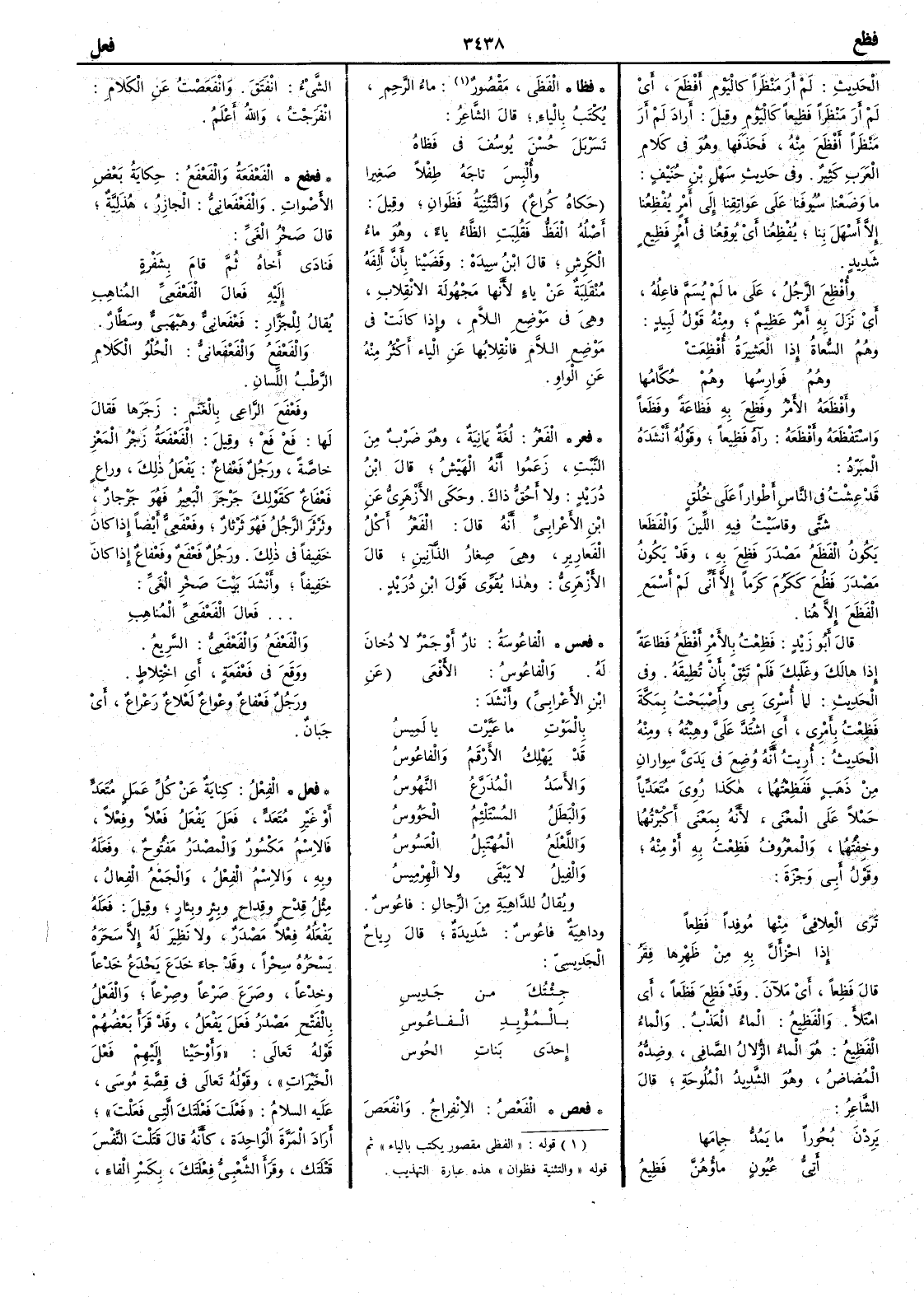 ( فعس ) الفاعُوسة نار أَو جمر لا دُخان له والفاعُوس الأَفْعَى عن ابن الأَعرابي وأَنشد بالمَوْتِ ما عَيَّرْت يا لَمِيسُ قد يُهْلَك الأَرْقَمُ والفاعُوسُ والأَسَدُ المُذَرَّعُ النَّهُوسُ والبَطَلُ المُسْتَلْئِمُ الحَووسُ واللَّعْلَعُ المُهْتَبِلُ العَسُوسُ والفِيلُ لا يَبقَى ولا الهِرْمِيسُ ويقال للداهية من الرجال فاعُوس وداهية فاعُوس شديدة قال رِياح الجَدِيسِي جِئْتُكَ من جَدِيسِ بالمُؤْيِدِ الفاعُوسِ إِحْدَى بَناتِ الحُوسِ ( فعص ) الفَعْصُ الانفراجُ وانْفَعَص الشيء انْفَتَق وانفَعَصْت عن الكلام انفرجت واللّه أَعلم ( فعفع ) الفَعْفَعةُ والفَعْفَعُ حكاية بعض الأَصوات والفَعْفَعانيُّ الجازِرُ هُذَلِيَّة قال صخر الغيّ فَنادَى أَخاه ثم قَامَ بِشَفْرةٍ إِليه فَعَالَ الفَعْفَعِيِّ المُناهِبِ يقال للجَزَّارِ فَعْفَعانيٌّ وهَبْهَبيٌّ وسَطَّارٌ والفَعْفَعُ والفَعْفَعانيُّ الحُلْو الكلامِ الرطْبُ اللسان وفَعْفَعَ الرَّاعي بالغنم زجَرَها فقال لها فَعْ فَعْ وقيل الفَعْفَعةُ زجر المعز خاصَّة ورجل فَعْفاعٌ يفعل ذلك وراعٍ فَعفَاعٌ كقولك جَرجَرَ البعيرُ فهو جَرْجارٌ وثَرْثَرَ الرجلُ فهو ثَرْثَارٌ وفَعْفَعِيٌّ أَيضاً إِذا كان خفيفاً في ذلك ورجل فَعْفَعٌ وفَعْفاعٌ إِذا كان خفيفاً وأَنشد بيت صخر الغي فَعالَ الفَعْفَعِيُّ المُناهِبِ والفَعْفَعُ والفَعْفَعِيُّ السريع ووقع في فَعْفَعةٍ أَي اختلاطٍ ورجل فَعْفاعٌ وعْواعٌ لَعْلاعٌ رَعْراعٌ أَي جبان ( فعل ) الفِعل كناية عن كل عمل متعدٍّ أَو غير متعدٍّ فَعَل يَفْعَل فَعْلاً وفِعْلاً فالاسم مكسور والمصدر مفتوح وفَعَله وبه والاسم الفِعْل والجمع الفِعال مثل قِدْح وقِداح وبِئر وبِئار وقيل فَعَله يَفْعَله فِعْلاً مصدر ولا نظير له إِلا سَحَره يَسْحَره سِحْراً وقد جاء خَدَع يَخْدَع خَدْعاً وخِدْعاً وصَرَع صَرْعاً وصِرْعاً والفَعْل بالفتح مصدر فَعَل يَفْعَل وقد قرأَ بعضهم وأَوحينا إِليهم فَعْلَ الخيرات وقوله تعالى في قصة موسى عليه السلام وفَعَلْتَ فَعْلَتَك التي فَعَلْت أَراد المرة الواحدة كأَنه قال قَتَلْت النفس قَتْلَتَك وقرأَ الشعبي فِعْلَتَك بكسر الفاء