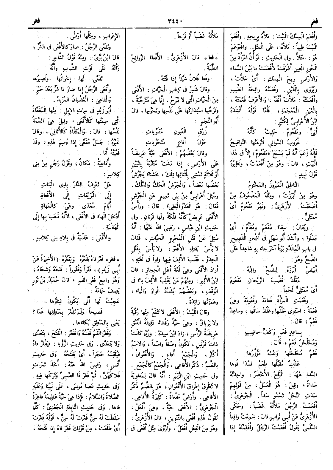و أَفعم المِسْكُ البيتَ : ملأَه بريحه . و أَفعم البيت طِيباً : مَلأَه على المثل . و افْعَوْعَم هو : امتلأَ . وفي الحديث : لو أَنَّ امرأَة من الحُور العِين أَشْرَفَتْ لأَفْعَمَت ما بين السماء والأَرض رِيحَ المِسكِ أَي ملأَت ويروى بالغين . و فَعَمَتْه رائحتهُ الطيب و أَفْعَمَتْه : ملأَت أَنفَه والأَعرف فَغَمتْه بالغين المعجمة فأَما قوله أَنشده ابن الأَعرابي لكثير : أَتِيٌّ ومَفْعُومٌ حَثِيثٌ كأَنه غُرُوبُ السَّواني أَتْرَعَتها النَّواضِحُ فإِنه زعم أَنه لم يسمع مَفْعُوم إِلا في هذا البيت قال : وهو من أَفْعَمت ونظيره قول لبيد : الناطِق المَبرُوز والمَخْتُوم وهو من أَبرزت ومثله المَضْعُوف من أَضْعَفْت . الأَزهري : ونَهَر مَفْعُوم أَي ممتلىء . ويقال : سِقاء مُفْعَم ومُفْأَم أَي مملوء وأَنشد أَبو سهل في أَشعار الفصيح في باب المشدّد بيتاً آخر جاء به شاهداً على الضِّحِّ وهو : أَبْيَض أَبرَزَه للضِّحِّ راقبهُ مُقَلَّد قُضُبَ الرَّيْحانِ مَفْعومُ أَي ممتلىء لَحْماً . و فَعُمَت المرأَة فَعامة و فُعُومة وهي فَعْمة اسْتَوى خَلْقها وغَلُظَ ساقها وساعدٌ فَعْمٌ قال : بساعدٍ فَعْمٍ وكَفَ خاضِب ومُخَلْخَل فَعْمٌ قال : فَعْمٌ مُخَلْخَلُها وَعْثٌ مُؤزَّرُها عَذْبٌ مُقَبَّلُها طَعْمُ السَّدَا فُوها السَّدا ههنا : البلح الأَخضر واحدته سَداة وقيل : هو العَسَل من قولهم سَدَتِ النحل تَسْدُو سَداً . الجوهري : أَفْعَمْت الرجلَ مَلأْته غضباً وحكى الأَزهري عن أَبي تراب قال : سمعت واقعاً السَّلمِيَّ يقول أَفْعَمْت الرجل وأَفْغَمْته إِذا ملأْته غضباً أَو فَرحاً ( فعا ) قال الأَزهري الأَفْعاء الرَّوائحُ الطيِّبةُ وفَعا فلان شيئاً إِذا فَتَّتَه وقال شمر في كتاب الحيّات الأَفْعَى من الحَيّاتِ التي لا تَبْرَحُ إِنما هي مُتَرَحِّية وتَرَحِّيها اسْتِدارَتُها على نفسها وتحَوِّيها قال أَبو النجم زُرْقِ العُيونِ مُتَلَوِّياتِ حَوْلَ أَفاعٍ مُتَحَوِّياتِ وقال بعضهم الأَفْعَى حيّة عَرِيضة على الأَرض إِذا مشَت مُتَثَنِّيَةً بثِنيين أَو ثلاثة تمشي بأَثْنائها تلك خَشْناء يَجْرُشُ بعضُها بعضاً والجَرْشُ الحَكُّ والدَّلْك وسئل أَعرابي من بني تميم عن الجَرْش فقال هو العدْو البَطِيء قال ورَأْسُ الأَفْعَى عريض كأَنه فَلْكة ولها قَرْنانِ وفي حديث ابن عباس رضي الله عنهما أَنه سئل عن قَتْل المُحْرِم الحيّاتِ فقال لا بأْس بقتله الأَفْعَوْ ولا بأْس بقتل الحِدَوْ فقلت الأَلف فيهما واواً في لغته أَراد الأَفعَى وهي لغة أَهل الحجاز قال ابن الأَثير ومنهم من يَقلب الأَلف ياء في الوقف وبعضهم يشدِّد الواو والياء وهمزتها زائدة وقال الليث الأَفعى لا تنفع منها رُقْية ولا تِرْياقٌ وهي حَيَّة رَقْشاء دقيقة العُنق عريضةُ الرأْس زاد ابن سيده وربما كانت ذات قَرْنَين تكون وصفاً واسماً والاسم أَكثر والجمع أَفاعٍ والأُفْعُوانُ بالضم ذكر الأَفاعي والجمع كالجمع وفي حديث ابن الزبير أَنه قال لمعاوية لا تُطْرِقْ إِطراقَ الأُفْعوان هو بالضم ذكر الأَفاعِي وأَرض مَفْعاةٌ كثيرة الأَفاعي الجوهري الأَفْعى حية وهي أَفْعَلُ تقول هذه أَفْعًى بالتنوين قال الأَزهري وهو من الفِعْل أَفعَل وأَرْوًى مثل أَفْعًى في الإِعراب ومثلها أَرْطًى مثل أَرطاة