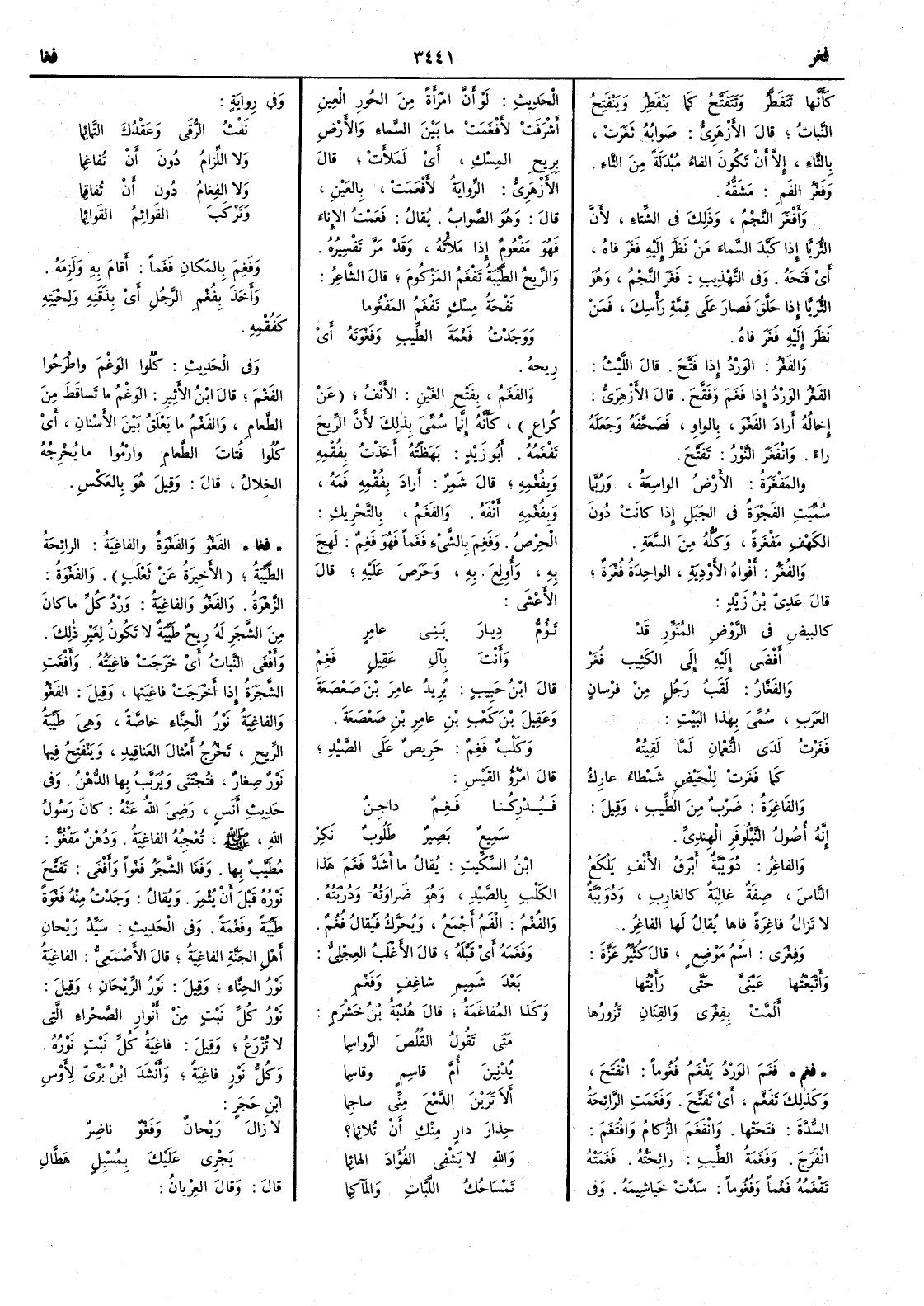 ( فغا ) الفَغْو والفَغْوَة والفاغِيةُ الرائحة الطيبة الأَخيرة عن ثعلب والفَغْوة الزهرة والفَغْو والفاغِيَةُ وَرْدُ كل ما كان من الشجر له ريح طيبة لا تكون لغير ذلك وأَفغى النبات أَي خرجت فاغيته وأَفْغَتِ الشجرة إِذا أَخرجت فاغِيَتها وقيل الفَغْو والفاغِيةُ نور الحِناء خاصة وهي طيبة الريح تَخْرج أَمثال العناقيد وينفح فيها نَوْر صِغار فتُجْتَنَى ويُرَبَّب بها الدُّهن وفي حديث أَنس رضي الله عنه كان رسول الله صلى الله عليه وسلم تُعْجبه الفاغيةُ ودُهْنٌ مَفْغُوٌ مُطَيِّب بها وفَغَا الشَجَرُ فَغْوًا وأَفْغى تفَتَّح نَوْرُه قبل أَن يُثْمِر ويقال وجدت منه فَغْوةً طيبة وفَغْمة وفي الحديث سَيِّدُ رَيْحانِ أهلِ الجنةِ الفاغِيةُ قال الأَصمعي الفاغِيةُ نَوْرُ الحِنَّاء وقيل نور الريحان وقيل نَوْر كل نبت من أَنوار الصحراء التي لا تزرع وقيل فاغية كل نبت نوره وكلُّ نَوْرٍ فاغِيةٌ وأَنشد ابن بري لأَوْس ابن حَجر لا زالَ رَيْحانٌ وفَغْوٌ ناضِرٌ يَجْري عَلَيْكَ بِمُسْبِلٍ هَطَّالِ قال وقال العريان