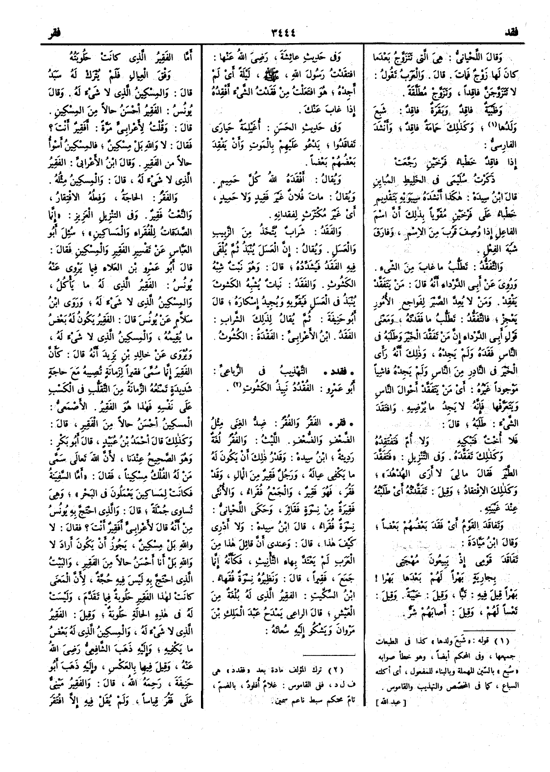 وقال اللحياني هي التي تتزوج بعدما كان لها زوج فمات قال والعرب تقول لا تَتَزَوَّجَنَّ فاقِداً وتزوج مطلقة وظَبْيَةٌ فاقِدٌ وبقرةٌ فاقِدٌ شبع ولدها وكذلك حَمامَة فاقِدٌ وأَنشد الفارسي إِذا فاقِدٌ خَطْباءُ فَرْخَينِ رَجَّعَتْ ذَكَرْتُ سُلَيْمَى في الخَلِيطِ المُبايِن قال ابن سيده هكذا أَنشده سيبويه بتقديم خَطْباءُ على فَرْخَينِ مُقَوِّياً بذلك أَن اسم الفاعل إِذا وُصِفَ قَرُب من الاسم وفارق شبَهَ الفعل والتفقُّدُ تَطَلُّبُ ما غاب من الشيء وروي عن أَبي الدرداء أَنه قال من يَتَفَقَّدْ يَفْقِدْ ومن لا يُعِدَّ الصَّبْرَ لفواجِعِ الأُمور يَعْجِزْ فالتَّفقُّدُ تَطَلُّب ما فَقَدْتَه ومعنى قول أَبي الدرداء أَن من تَفَقَّدَ الخيرَ وطلبه في الناس فَقَدَه ولم يَجِدْه وذلك أَنه رأَى الخير في النادر من الناس ولم يجده فاشياً موجوداً غيره أَي من يَتَفَقَّدْ أَحوالَ الناس ويَتَعَرَّفْها فإِنه لا يجد ما يُرضِيه وافتَقَدَ الشيءَ طَلبه قال فلا أُخْتٌ فَتَبْكِيهِ ولا أُمٌّ فَتَفْتَقِده وكذلك تَفَقَّدَه وفي التنزيل فتَفَقَّدَ الطيرَ فقال ما ليَ لا أَرى الهُدْهُدَ وكذلك الافتقادُ وقيل تَفَقَّدْتُه أَي طَلَبْتُه عند غيبته وتفاقَدَ القومُ أَي فَقَدَ بعضُهم بعضاً وقال ابن ميادة تَفَاقَدَ قَوْمي إِذ يَبيعونَ مُهْجَتي بِجارِيةٍ بَهْراً لَهُمْ بعدَها بَهْرا بَهْراً قيل فيه تَبّاً وقيل خيبة وقيل تَعْساً لهم وقيل أَصابهم شَرٌّ وفي حديث عائشة رضي الله عنها افتقَدْتُ رسولَ الله صلى الله عليه وسلم ليلة أَي لم أَجِدْه هو افتَعَلْتُ من فَقَدْتُ الشيءَ أَفقِدُه إِذا غاب عنك وفي حديث الحسن أُغَيْلِمَةٌ حَيارَى تفاقَدُوا يَدْعُو عليهم بالموت وأَن يَفْقِدَ بعضُهم بعضاً ويقال أَفقدَه الله كلَّ حميمٍ ويقال مات فلانٌ غيرَ فَقِيدٍ ولا حَمِيدٍ أَي غيرَ مُكْتَرَثٍ لِفِقدانِه والفَقَد شرابٌ يُتَّخَذُ من الزبيب والعسل ويقال إِن العسل ينبذ ثم يلقى فيه الفَقَد فيُشَدِّدُه قال وهو نبت شبه الكَشُوث والفَقَدُ نباتٌ يشبه الكَشوث ينبذ في العسل فيقويه ويجيد إِسكاره قال أَبو حنيفة ثم يقال لذلك الشراب الفَقَدُ ابن الأَعرابي الفَقْدَةُ الكُشُوث ( فقدد ) التهذيب في الرباعي أَبو عمرو الفقْدُدُ نبيذُ الكشوث ( فقر ) الفَقْر والفُقْر ضد الغِنى مثل الضَّعْفِ والضُّعْف الليث والفُقْر لغة رديئة ابن سيده وقَدْرُ ذلك أَن يكون له ما يَكْفي عيالَه ورجل فَقِيرٌ من المال وقد فَقُرَ فهو فَقير والجمع فُقَراءُ والأُنثى فَقِيرةٌ من نسوة فَقَائِر وحكى اللحياني نسوة فُقَراءُ قال ابن سيده ولا أَدري كيف هذا قال وعندي أَن قائل هذا من العرب لم يَعْتدّ بهاء التأْنيث فكأَنه إِنما جمع فقيراً قال ونظيره نسوة فُقَهاءُ ابن السكيت الفَقِيرُ الذي له بُلْغَةٌ من العيش قال الراعي يمدح عبد الملك بن مَرْوان ويشكو إِليه سُعاته أَما الفَقِيرُ الذي كانت حَلُوبَتُهُ وَفْقَ العِيال فلم يُتْرَكْ له سَبَدُ قال والمسكين الذي لا شيء له وقال يونس الفَقِيرُ أَحسن حالاً من المسكين قال وقلت لأَعرابي مرةً أَفَقِيرٌ أَنت ؟ فقال لا والله بل مسكين فالمسكين أَسوأُ حالاً من الفقير وقال ابن الأَعرابي الفَقِيرُ الذي لا شيء له قال والمسكين مثله والفَقْر الحاجة وفعله الافْتِقارُ والنعت فَقِيرٌ وفي التنزيل العزيز إِنما الصدقات للفُقَراءِ والمساكين سئل أَبو العباس عن تفسير الفَقِير والمسكين فقال قال أَبو عمرو بن العلاء فيما يَروي عنه يونُس الفَقِيرُ الذي له ما يَأْكل والمسكين الذي لا شيء له وروى ابن سلام عن يونس قال الفَقِيرُ يكون له بعض ما يُقيمه والمسكين الذي لا شيء له ويُرْوى عن خالد بن يزيد أَنه قال كأَن الفَقِيرَ إِنما سُمِّي فَقِيراً لِزَمانةٍ تصيبه مع حاجة شديدة تمنعه الزَّمانةُ من التَّقَلُّب في الكسب على نفسه فهذا هو الفَقِيرُ الأَصمعي المسكين أَحسن حالاً من الفَقِيرِ قال وكذلك قال أَحمد بن عبيد قال أَبو بكر وهو الصحيح عن