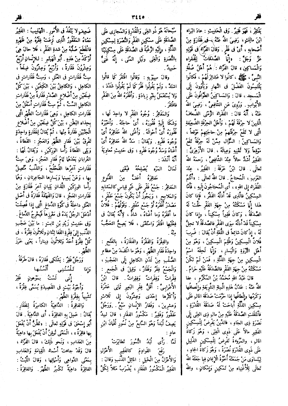 يَفْتَقِرُ فهو فَقِيرٌ وفي الحديث عاد البراءَ بنَ مالكٍ رضي الله عنه في فَقَارة من أَصحابه أَي في فَقْرٍ وقال الفراء في قوله عز وجل إِنما الصدقات للفُقراءِ والمساكين قال الفراء هم أَهل صُفَّةِ النبي صلى الله عليه وسلم كانوا لا عشائر لهم فكانوا يلتمسون الفضل في النهار ويأْوون إِلى المسجد قال والمساكين الطَوَّافون على الأَبواب وروي عن الشافعي رضي الله عنه أَنه قال الفُقَراءُ الزَّمْنَى الضعاف الذين لا حرفة لهم وأَهل الحِرْفةِ الضعيفة التي لا تقع حرْفتُهم من حاجتهم موقعاً والمساكين السُّؤَّالُ ممن له حرفةٌ تقع مَوْقِعاً ولا تغنيه وعيالَهُ قال الأَزهري الفَقِيرُ أَشد حالاً عند الشافعي رحمه الله تعالى قال ابن عرفة الفَقِيرُ عند العرب المحتاج قال الله تعالى أَنتم الفُقَراء إِلى الله أَي المحتاجون إِليه فأَما المسكين فالذي قد أَذلَّه الفَقْرُ فإِذا كان هذا إِنما مَسْكَنَتُه من جهة الفَقْر حلَّتْ له الصدقة وكان فَقيراً مسكيناً وإِذا كان مسكيناً قد أَذلَّهُ سوى الفَقْرِ فالصدقة لا تحل له إِذ كان شائعاً في اللغة أَن يقال ضُرِبَ فلانٌ المسكينُ وظُلِمَ المسكينُ وهو من أَهل الثَّرْوَةِ واليَسار وإِنما لحقه اسم المسكين من جهة الذِّلَّةِ فمن لم تكن مسكنتُه من جهة الفَقْر فالصدقةُ عليه حرام قال عبد الله محمد بن المكرم عفا الله عنه عَدْلُ هذه الملةِ الشريفة وإِنْصافُها وكَرَمُها وإِلطافها إِذا حَرَّمَت صدقةَ المال على مسكين الذِّلَّةِ أَباحَتْ له صدقةَ القُدْرةِ فانتقلت الصدقةُ عليه من مال ذي الغِنَى إِلى نُصْرة ذي الجَاهِ فالدِّينُ يَفْرِضُ للمسكين الفَقِيرِ مالاً على ذوي الغِنَى وهو زكاة المال والمُرُوءةُ تَفْرِضُ للمسكين الذليلِ على ذوي القدرة نُصْرَةً وهو زكاة الجاه ليتساوى مَنْ جَمَعَتْهُ أُخُوَّةُ الإِيمانِ فيما جعله الله تعالى للأَغنياء من تَمْكينٍ وإِمكان والله سبحانه هو ذو الغِنَى والقدرةِ والمُجازِي على الصدقة على مسكين الفَقْرِ والنُّصْرَةِ لمسكين الذِّلَّةِ وإِليه الرغبة في الصدقة على مِسْكِينَيْنَا بالنُّصرةِ والغِنَى ونَيْلِ المُنَى إِنه غنيٌّ حميد وقال سيبويه وقالوا افْتَقَر كما قالوا اشتَدَّ ولم يقولوا فَقُر كما لم يقولوا شَدُدَ ولا يستعمل بغير زيادة وأَفْقَرَهُ الله من الفَقْرِ فافْتَقَرَ والمَفَاقِرُ وجوه الفَقْرِ لا واحد لها وشَكَا إِليه فُقُورَه أَي حاجتَه وأَخبره فُقُورَه أَي أَحْوالَه وأَغنى الله مَفَاقِرَه أَي وُجُوه فَقْره ويقال سَدّ الله مَفاقِره أَي أَغناه وسَدَّ وُجوه فَقْره وفي حديث معاوية أَنه أَنشد لَمَالُ المَرْءِ يُصْلِحه فيُغْني مَفاقِرَه أَعفّ من القُنُوعِ المَفاقِر جمع فَقْر على غير قياس كالمَشابه والمَلامحِ ويجوز أَن يكون جمع مَفْقَر مصدر أَفْقَره أَو جمع مُفْقِرٍ وقولهم فلان ما أَفْقَره وما أَغْناه شاذ لأَنه يقال في فِعْلَيْهما افتقر واستغنى فلا يصح التعَجُّب منه والفِقْرة والفَقْرة والفَقَارة بالفتح واحدة فَقَار الظهر وهو ما انتضد من عِظام الصلب من لَدُن الكاهِل إِلى العَجْب والجمع فِقَر وفَقَارٌ وقيل في الجمع فِقْرات وفِقَرات وفِقِرات قال ابن الأَعرابي أَقَلُّ فِقَر البَعِير ثماني عشرة وأَكثرها إِحدى وعشرون إِلى ثلاث وعشرين وفَقَار الإِنسان سبع ورجل مَفقُور وفَقِير مكسور الفَقَار قال لبيد يصف لُبَداً وهو السابع من نُسُور لُقْمان ابن عاد لَمَّا رأَى لُبَدُ النُّسورَ تطايَرَتْ رَفَعَ القَوادِم كالفَقِيرِ الأَعْزَلِ والأَعْزَلُ من الخيل المائل الذَّنَب وقال الفَقِير المكسور الفَقَار يضرب مثلاً لكل ضعيفٍ لا ينفُذ في الأُمور التهذيب الفقير معناه المَفْقُور الذي نُزِعت فِقَره من ظهره فانقطع صُلْبه من شدة الفَقْر فلا حال هي أَوكد من هذه أَبو الهثيم للإِنسان أَربع وعشرون فَقَارةً وأَربع وعشرون ضِلَعاً ست فَقَاراتٍ في العنق وست فَقَاراتٍ في الكاهل والكاهل بين الكتفين بين كل ضِلَعَينِ م