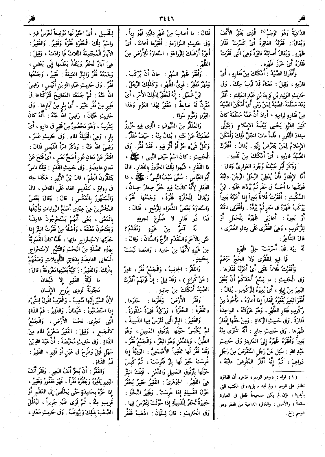 ( * قوله « وهو الوسم » ظاهره أن الفاقرة تطلق على الوسم ولم نجد ما يؤيده في الكتب التي بأيدينا فان لم يكن صحيحاً فلعل في العبارة سقطاً والأَصل والفاقرة الداهية من الفقر وهو الوسم إلخ ) الذي يَفْقِرُ الأَنف ويقال فَقَرَتْه الفاقِرةُ أَي كسرت فَقَارَ ظهره ويقال أَصابته فاقِرةٌ وهي التي فَقَرَتْ فَقَارَه أَي خَرَز ظهره وأَفْقَرَك الصيدُ أَمْكَنَك من فَقارِه أَي فارْمِه وقيل معناه قد قَرُبَ منك وفي حديث الوليد بن يزيد بن عبد الملك أَفْقَر بعد مَسْلَمَةَ الصيدُ لمن رَمى أَي أَمكن الصيدُ من فَقارِه لراميه أَراد أَن عمه مسلمة كان كثير الغزو يَحْمي بيضةَ الإِسلام ويتولى سِدادَ الثغور فلما مات اختل ذلك وأَمكن الإِسلامُ لمن يتعرّض إِليه يقال أَفقرك الصيدُ فارْمِه أَي أَمكنك من نفسه وذكر أَبو عبيدة وجوهَ العَوارِيّ وقال أَما الإِفقارُ فأَن يعطي الرجلُ الرجلَ دابته فيركبها ما أَحب في سفر ثم يردّها عليه ابن السكيت أَفْقَرْتُ فلاناً بعيراً إِذا أَعرته بعيراً يركب ظهره في سفر ثم يرده وأَفْقَرَني ناقتَه أَو بعيره أَعارني ظهره للحمل أَو للركوب وهي الفُقْرَى على مثال العُمْرَى قال الشاعر له رَبَّةٌ قد أَحْرَمَتْ حِلَّ ظَهْرِه فما فيه لِلفُقْرَى ولا الحَجِّ مَزْعَمُ وأَفقرتُ فلاناً ناقتي أَي أَعرته فَقَارَها وفي الحديث ما يَمْنَعُ أَحدَكم أَن يُفْقِرَ البعيرَ من إِبله أَي يُعيره للركوب يقال أَفقر البعيرَ يُفْقِرُه إِفقاراً إِذا أَعاره مأْخوذ من ركوب فَقارِ الظهر وهو خَرَزَاتُه الواحدة فَقارَة وفي حديث الزكاة ومن حَقِّها إِفْقارُ ظهرِها وفي حديث جابر أَنه اشترى منه بعيراً وأَفْقَره ظهرَه إِلى المدينة وفي حديث عبد الله سئل عن رجل استقرض من رجل دراهم ثم إِنه أَفْقَر المُقْرِضَ دابتَه فقال ما أَصاب من ظهر دابته فهو رباً وفي حديث المزارعة أَفْقِرْها أَخاك أَي أَعِرْه أَرضك للزراعة استعاره للأَرض من الظهر وأَفْقَرَ ظهرُ المُهْرِ حان أَن يُرْكَبَ ومُهْر مُفْقِر قويّ الظهر وكذلك الرجل ابن شميل إِنه لَمُفْقِرٌ لذلك الأَمر أَي مُقْرنٌ له ضابط مُفْقِرٌ لهذا العَزْم وهذا القِرْنِ ومُؤْدٍ سواء والمُفَقَّر من السيوف الذي فيه حُزُوز مطمئنة عن متنه يقال منه سيف مُفَقَّر وكلُّ شيء حُزَّ أَو أُثِّرَ فيه فقد فُقِّرَ وفي الحديث كان اسم سيف النبي صلى الله عليه وسلم ذا الفَقَارِ شبهوا تلك الحزوز بالفَقارِ قال أَبو العباس سمي سيف النبي صلى الله عليه وسلم ذا الفَقار لأَنه كانت فيه حُفَرٌ صِغار حِسانٌ ويقال للحُفْرة فُقْرة وجمعها فُقَر واستعاره بعض الشعراء للرُّمْح فقال فما ذُو فَقارٍ لا ضُلُوعَ لجوفِه له آخِرٌ من غيره ومُقَدَّمُ ؟ عنى بالآخر والمُقَدَّم الزُّجَّ والسِّنانَ وقال من غيره لأَنهما من حديد والعصا ليست بحديد والفُقْر الجانب والجمع فُقَر نادر عن كراع وقد قيل إِن قولهم أَفْقَرَكَ الصيدُ أَمكنكَ من جانبه وفَقَرَ الأَرضَ وفَقَّرَها حفرها والفُقْرةُ الحُفرة ورَكِيَّة فَقِيرةٌ مَفْقُورةٌ والفَقِيرُ البئر التي تغرس فيها الفَسِيلةُ ثم يكبس حولَها بتُرْنُوقِ المَسِيل وهو الطين وبالدِّمْنِ وهو البعر والجمع فُقُر وقد فَقَّرَ لها تَفْقِيراً الأَصمعي الوَدِيَّة إِذا غرست حفر لها بئر فغرست ثم كبس حولها بتُرْنُوق المَسِيلِ والدِّمْنِ فتلك البئر هي الفَقِيرُ الجوهري الفَقِيرُ حفير يحفر حول الفَسِيلة إِذا غرست وفَقِيرُ النخلة حفيرة تحفر للفسيلة إِذا حوّلت لتغرس فيها وفي الحديث قال لسلمان اذهب ففَقّر الفسيل أَي احْفِرْ لها موضعاً تُغْرَسُ فيه واسم تلك الحفرة فُقْرَةٌ وفَقِيرٌ والفَقِير الآبار المجتمعة الثلاث فما زادت وقيل هي آبار تُحْفَرُ وينفذ بعضها إِلى بعض وجمعه فُقُرٌ والبئر العتيقة فَقِير وجمعها فُقُر وفي حديث عبد الله بن أنيس رضي الله عنه ثم جمعنا المفاتيح فتركناها في فَقِيرٍ من فُقُر خيبر أَي بئر من آبارها وفي حديث عثمان رضي الله عنه أَنه كان يشرب وهو محصور م
