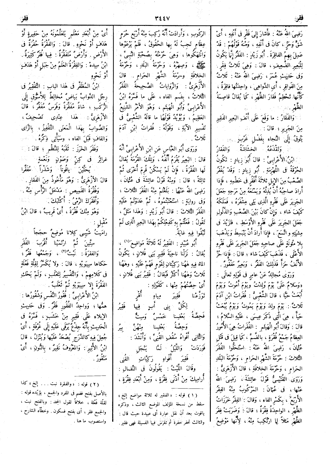 ( * قوله « الفقير له ثلاثة مواضع إلخ » سقط من نسخة المؤلف الموضع الثالث وذكره ياقوت بعد أن نقل عبارة أبي عبيدة حيث قال والثالث تحفر حفرة ثم تغرس بها الفسيلة فهي فقير ) يقال نزلنا ناحيةَ فَقِير بني فلان يكون الماء فيه ههنا رَكِيَّتان لقوم فهم عليه وههنا ثلاث وههنا أَكثر فيقال فَقِيرُ بني فلان أَي حصتهم منها كقوله تَوَزَّعْنا فَقِيرَ مِياهِ أُقْرٍ لكلِّ بني أَبٍ فيها فَقِيرُ فَحِصَّةُ بعضِنا خَمْسٌ وسِتٌّ وحِصَّةُ بعضِنا منهنّ بِيرُ والثاني أَفواه سَقْفِ القُنِيّ وأَنشد فَوَرَدَتْ والليلُ لما يَنْجَلِ فَقِيرَ أَفْواهِ رَكِيَّاتِ القُني وقال الليث يقولون في النِّضال أُراميك من أَدنى فِقْرةٍ ومن أَبعد فِقْرة أَي من أَبعد مَعْلَمٍ يتعلمونه من حفِيرة أَو هَدَف أَو نحوه قال والفُقْرة حُفْرة في الأَرض وأَرض مُتَفَقِّرة فيها فُقَرٌ كثيرة ابن سيده والفِقْرَةُ العَلم من جبل أَو هَدَفٍ أَو نحوه ابن المُظَفَّر في هذا الباب التَّفْقِير في رِجْل الدواب بياضٌ مخالط للأَسْواقِ إِلى الرُّكَبِ شاة مُفَقَّرة وفرس مُفَقَّر قال الأَزهري هذا عندي تصحيف والصواب بهذا المعنى التفقيز بالزاي والقاف قبل الفاء وسيأْتي ذكره وفَقَرَ الخَرَزَ ثَقَبه للنَّظْم قال غَرائِرُ في كِنٍّ وصَوْنٍ ونَعْمةٍ يُحَلَّيْنَ ياقُوتاً وشَذْراً مُفَقَّرا قال الأَزهري وهو مأْخوذ من الفَقارِ وفُقْرَةُ القميص مَدْخَلُ الرأْس منه وأَفْقَرَكَ الرَّمْيُ أَكْثَبَك وهو منك فُقْرَةً أَي قريبٌ قال ابن مقبل راميتُ شَيْبي كِلانا مُوضِعٌ حِجَجاً سِتِّينَ ثم ارْتَمَيْنا أَقربَ الفُقَرِ والفَقُرَة نبت وجمعها فَقُرٌ حكاها سيبويه قال ولا يكسر لقلة فَعُلَةٍ في كلامهم والتفسير لثعلب ولم يحكِ الفَقُرَة إِلا سيبويه ثم ثعلب ابن الأَعرابي فُقُورُ النَّفْس وشُقُورُها هَمُّها وواحد الفُقُورِ فَقْر وفي حديث الإِيلاء على فَقِيرٍ من خَشَب فسره في الحديث بأَنه جِذْعٌ يُرْقى عليه إِلى غُرْفة أَي جعل فيه كالدَّرَج يُصْعَدُ عليها وينزل قال ابن الأَثير والمعروف نَفِير بالنون أَي منقور
