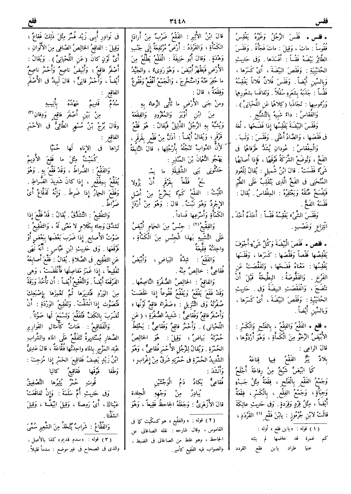 ( فقس ) فَقَس الرجلُ وغيرُه يَفْقِس فُقُوساً مات وقيل مات فَجْأَة وفَقَسَ الطائر بيضَه فَقْساً أَفسَدَها وفي حديث الحديبية وفَقَص البيضة أَي كسرها وبالسين أَيضاً وفَقَسَ فلانٌ فلاناً يَفْقِسه فَقْساً جَذَبه بشعَره سُفْلاً وتَفاقَسا بشعُورهما ورؤوسهما تجاذبا « كلاهما عن اللحياني والفُقاس داء شَبيه بالتَّشَنُّج وفَقَسَ البيضة يَفْقِسها إَذا فضَخَها لغة في فَقَصَها والصاد أَعلى وفَقَس وثب والمِفْقاسُ عُودان يُشَدُّ طَرَفاهما في الفَخّ وتوضع الشَّرَكة فوقهما فإِذا أَصابهما شيء فقَسَت قال ابن شميل يقال للعُود المُنْحَنِي في الفَخّ الذي ينقلِب على الطير فَيَفْسخ عُنُقَه ويَعْتَفِرُه المِفْقاس يقال فَقَسَه الفَخّ وفَقَس الشيءَ يَفْقِسُه فَقْساً أَخذه أَخذ انتزاعٍ وغَصْب ( فقص ) فَقَصَ البيضةَ وكلَّ شيءٍ أَجوفَ يَفْقِصُها فَقْصاً وفَقَّصَها كسرها وفَقَشَها يَفْقِسُها معناه فضَخَها وتَفَقَّصَت عن الفَرْخ والفقُّوصةُ البِطِّيخةُ قبل أَن تَنْضَج وانْفَقَصَت البيضةُ وفي حديث الحُدَيبية وفَقَصَ البيضةَ أَي كسرها وبالين أَيضاً( فقع ) الفَقْعُ والفِقْعُ بالفتح والكسر الأَبيض الرَّخْو من الكَمْأََ ة وهو أَرْدَؤُها قال الراعي بِلادٌ يَبُزُّ الفَقْعُ فيها قِناعَه كما ابْيَضَّ شَيْخٌ من رِفاعةَ أَجْلَحُ وجمع الفَقْعِ بالفتحِ فِقَعةٌ مثل جَبْءٍ وجِبَأَةٍ وجمع الفِقْعِ بالكسر فِقَعَةٌ أَيضاً مثل قِرْدٍ وقِرَدةٍ وفي حديث عاتكة قالت لابن جُرْموزٍ يا ابن فَقْعِ القَرْدَدِ قال ابن الأَثير الفَقْعُ ضرْب من أَردَإِ الكَمْأَةِ والقَرْدَدُ أَرض مرتفعة إلى جنب وَهْدةٍ وقال أَبو حنيفة الفَقْعُ يَطْلُعُ من الأَرض فيظهر أَبيض وهو رديء والجيِّد ما حُفِرَ عنه واستخرج والجمع أَفْقُعٌ وفُقُوعٌ وفِقَعةٌ قال ومِنْ جَنى الأَرضِ ما تأْتي الرِّعاءُ به مِنَ ابنِ أَوْبَرَ والمُغْرُود والفِقَعهْ ويُشَبَّه به الرجل الذليل فيقال هو فَقْعُ قَرْقَرٍ ويقال أَيضاً أَذَلُّ من فَقْعٍ بِقَرقَرٍ لأَنَّ الدَّواب تَنْجُلُه بأَرجلها قال النابغة يهجو النعمان بن المنذر حَدِّثوني بَني الشَّقِيقةِ ما يَمْ نَعُ فَقْعاً بِقَرْقَرٍ أَن يَزُولا الليث الفقْع كَمْءٌ يخرج من أَصل الإِجْردِّ وهو نَبْتٌ قال وهو من أَرادإِ الكَمْأَةِ وأَسْرَعِها فَساداً والفِقِّيعُ