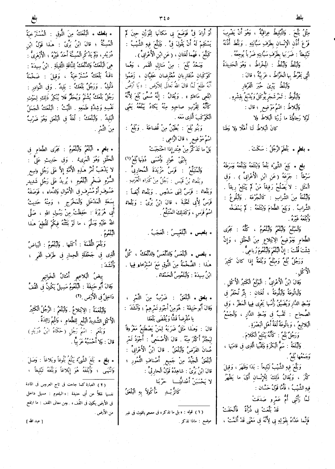( بلعم ) البُلْعُم والبُلْعومُ مَجْرى الطعام في الحَلْق وهو المَريءُ وفي حديث عليّ لا يَذهَب أَمرُ هذه الأُمَّة إلا على رجل واسِع السُّرْمِ ضَخْم البُلْعُوم يُريدُ على رجل شديد عَسُوف أَو مُسْرِف في الأمْوال والدِّماء فوصفه بسَعة المَدْخَل والمَخْرَج ومنه حديث أَبي هريرة حَفِظْت من رسول الله صلى الله عليه وسلم ما لو بَثَثْتُه فيكم لقُطِع هذا البُلْعُوم وبَلْعَم اللُّقْمة أَكلها والبُلْعومُ البياض الذي في جَحْفَلة الحِمار في طرَف الفم وأَنشد بِيض البَلاعِيم أَمثال الخَواتِيم وقال أَبو حنيفة البُلْعوم مَسِيل يكون في القُفِّ داخل في الأَرض والبَلْعَمة الإبْتِلاعُ والبَلْعَمُ الرجل الكثير الأَكل الشديد البَلْع للطعام والميم زائدة وبَلْعَم اسمُ رجلٍ حكاه ابن دُريد قال ولا أَحسبه عربيّاً
