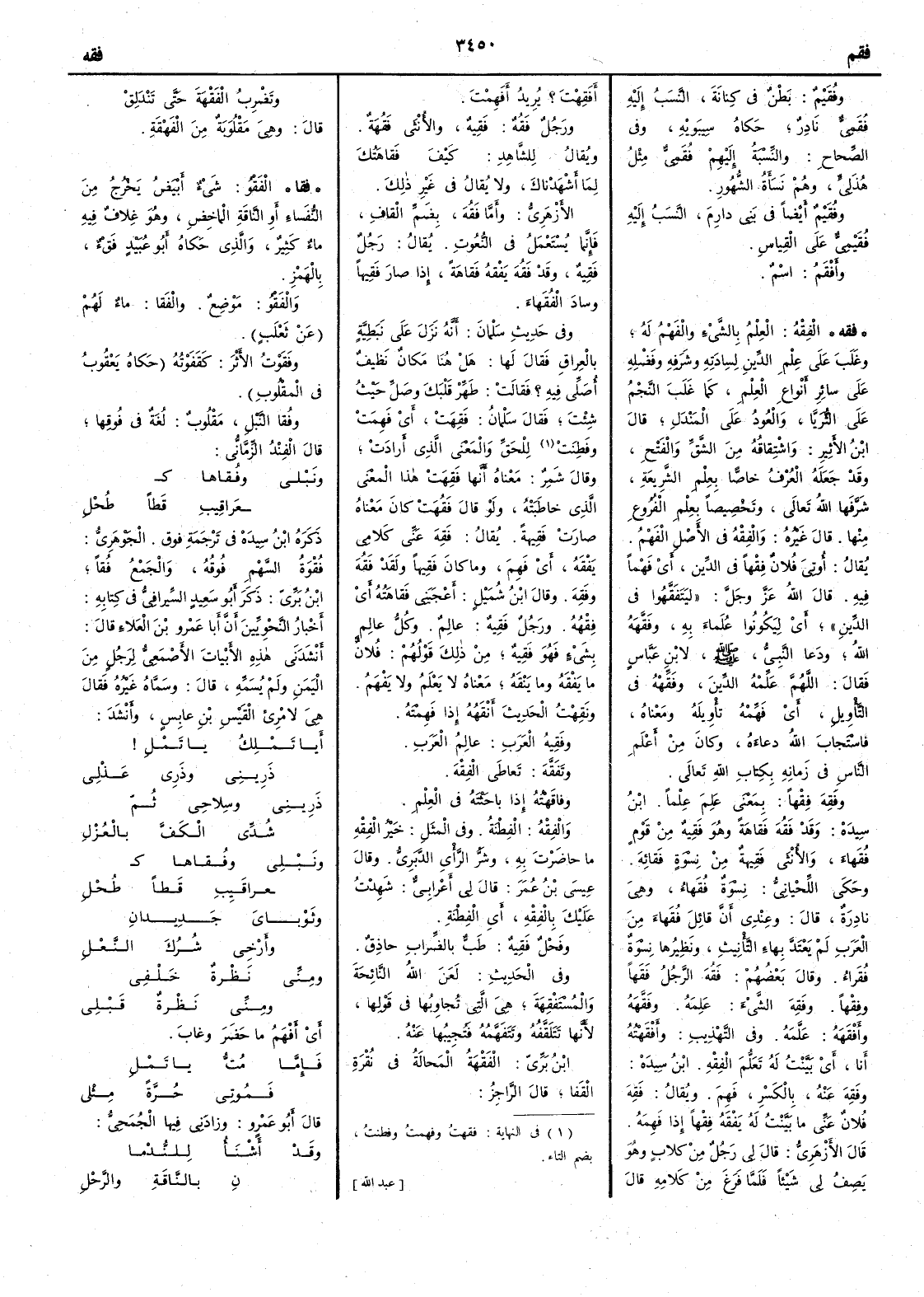 ( فقه ) الفِقْهُ العلم بالشيء والفهمُ له وغلبَ على عِلْم الدين لسِيادَتِه وشرفه وفَضْلِه على سائر أَنواع العلم كما غلب النجمُ على الثُّرَيَّا والعُودُ على المَنْدَل قال ابن الأَثير واشْتِقاقهُ من الشَّقِّ والفَتْح وقد جَعَله العُرْفُ خاصّاً بعلم الشريعة شَرَّفَها الله تعالى وتَخْصيصاً بعلم الفروع منها قال غيره والفِقْهُ في الأَصل الفَهْم يقال أُوتِيَ فلانٌ فِقْهاً في الدين أَي فَهْماً فيه قال الله عز وجل ليَتفَقَّهوا في الدين أَي ليَكونوا عُلَماء به وفَقَّهَه اللهُ ودعا النبي صلى الله عليه وسلم لابن عباس فقال اللهم عَلِّمْه الدِّينَ وفَقِّهْه في التأْويل أَي فَهِّمْه تأْويلَه ومعناه فاستجاب الله دُعاءه وكان من أَعلم الناس في زمانه بكتاب الله تعالى وفَقِه فِقْهاً بمعنى عَلِم عِلْماً ابن سيده وقد فَقُه فَقاهَةً وهو فَقِيهٌ من قوم فُقَهاءَ والأُنثى فَقِيهة مِنْ نِسْوةٍ فقائِهَ وحكى اللحياني نسوة فُقَهاء وهي نادرة قال وعندي أَن قائل فُقَهاء من العرب لم يَعْتَدَّ بهاء التأْنيث ونظيرها نسوة فُقَراء وقال بعضهم فَقُه الرجل فَقَهاً وفِقْهاً وفَقِه