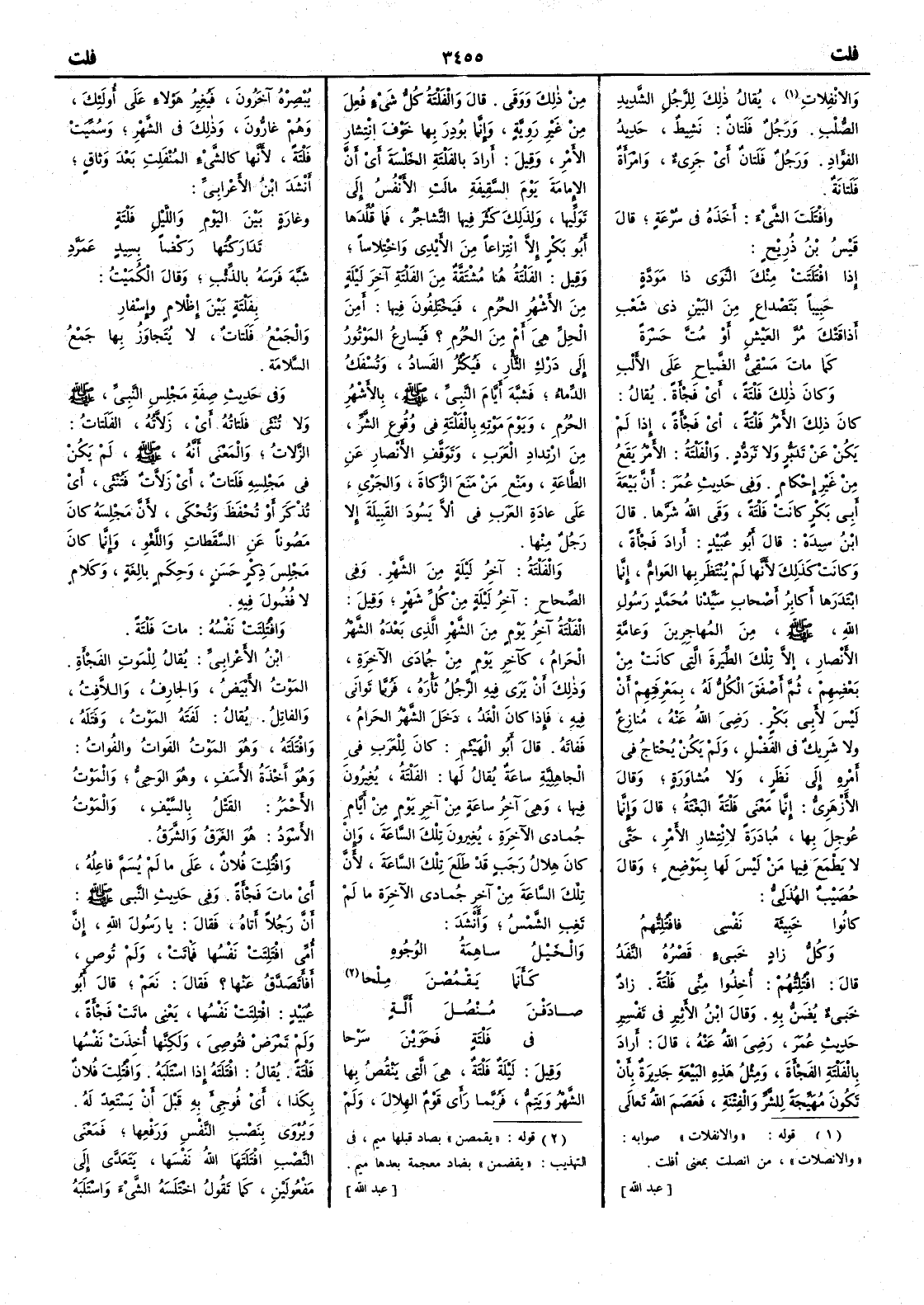 والانْفِلاتِ يقال ذلك للرجل الشديد الصُّلْبِ ورجل فَلَتانٌ نَشِيطٌ حديد الفؤَاد ورجل فَلَتانٌ أَي جريءٌ وامرأَة فَلَتانَةٌ وافْتَلَتَ الشيءَ أَخَذَه في سُرْعة قال قيس ابن ذُرَيْح إِذا افْتَلَتَتْ منك النَّوى ذا مَوَدَّةٍ حَبيباً بتَصْداعٍ من البَيْنِ ذي شَعْبِ أَذاقَتْكَ مُرَّ العَيْشِ أَو مُتَّ حَسْرَةً كما ماتَ مَسْقِيُّ الضَّياحِ على الأَلْب وكان ذلك فَلْتةً أَي فَجْأَة يقال كان ذلك الأَمرُ فَلْتةً أَي فَجأَة إِذا لم يكن عن تَدَبُّر ولا تَرَدُّدٍ والفَلْتة الأَمر يقع من غير إِحكام وفي حديث عمر أَنَّ بيعة أَبي بكر كانت فَلْتةً وَقى اللهُ شَرَّها قال ابن سيده قال أَبو عبيد أَراد فجأَة وكانت كذلك لأَنها لم يُنْتَظَرْ بها العوامُّ إِنما ابْتَدَرَها أَكابرُ أَصحاب سيدنا محمد رسول الله صلى الله عليه وسلم من المهاجرين وعامّة الأَنصار إِلا تلك الطِّيرةَ التي كانت من بعضهم ثم أَصْفَقَ الكلُّ له بمعرفتهم أَن ليس لأَبي بكر رضي الله عنه مُنازع ولا شريك في الفضل ولم يكن يحتاج في أَمره إِلى نظر ولا مُشاورة وقال الأَزهري إِنما معنى فَلْتةً البَغْتَة قال وإِنما عُوجل بها مُبادَرةً لانْتشارِ الأَمر حتى لا يَطْمَعَ فيها من ليس لها بموضع وقال حُصَيبٌ الهُذَليُّ كانوا خَبيئةَ نَفْسي فافْتُلِتُّهمُ وكلُّ زادٍ خَبيءٍ قَصْرُه النَّفَدُ قال افْتُلِتُّهم أُخِذوا مني فَلْتة زادٌ خبيءٌ يُضَنُّ به وقال ابن الأَثير في تفسير حديث عمر رضي الله عنه قال أَراد بالفَلْتةِ الفَجْأَة ومثلُ هذه البَيْعةِ جَديرةٌ بأَن تكونَ مُهَيِّجةً للشرِّ والفِتنة فعَصَم اللهُ تعالى من ذلك ووَقى قال والفَلْتةُ كل شيءٍ فُعِلَ من غير رَوِيَّةٍ وإِنما بوُدِرَ بها خَوْفَ انتشار الأَمر وقيل أَراد بالفَلْتة الخَلْسةَ أَي أَن الإِمامة يوم السَّقيفةِ مالَت الأَنْفُسُ إِلى تَوَلِّيها ولذلك كَثُرَ فيها التشاجُر فما قُلِّدَها أَبو بكر إِلا انْتِزاعاً من الأَيْدي واختِلاساً وقيل الفَلْتَةُ هنا مشتقة من الفَلْتة آخر ليلةٍ من الأَشْهُر الحُرُم فيَخْتَلِفون فيها أَمِنَ الحِلِّ هي أَم من الحَرَم ؟ فيُسارِعُ المَوْتُور إِلى دَرْكِ الثأْر فيكثر الفساد وتُسْفَكُ الدماءُ فشبَّه أَيام النبي صلى الله عليه وسلم بالأَشهر الحرم ويوم موته بالفَلْتة في وُقوع الشَّرّ من ارتداد العرب وتوقف الأَنصار عن الطاعة ومَنْع من منع الزكاة والجَرْي على عادة العرب في أَن لا يَسُودَ القبيلةَ إِلا رجلٌ منها والفَلْتة آخرُ ليلةٍ من الشهر وفي الصحاح آخر ليلة من كل شهر وقيل الفَلْتة آخر يوم من الشهر الذي بعده الشهرُ الحرام كآخر يوم من جُمادى الآخرة وذلك أَن يَرى فيه الرجل ثأْرَه فربما تَوانَى فيه فإِذا كان الغَدُ دَخَلَ الشهرُ الحرامُ ففاتَه قال أَبو الهيثم كان للعرب في الجاهلية ساعة يقال لها الفَلْتة يُغِيرون فيها وهي آخر ساعة من آخر يوم من أَيام جُمادى الآخرة يُغيرون تلك الساعة وإِن كان هلالُ رَجَب قد طَلَع تلك الساعةَ لأَن تلك الساعة من آخر جُمادى الآخرة ما لم تَغِبِ الشَّمسُ وأَنشد والخيلُ ساهِمةُ الوُجُوهِ كأَنما يَقْمُصْنَ مِلْحا صادَفْنَ مُنْصُلَ أَلَّةٍ في فَلْتَةٍ فَحَوَيْنَ سَرْحا وقيل ليلةٌ فَلْتة هي التي يَنْقُصُ بها الشهرُ ويَتم فرما رأَى قومٌ الهلالَ ولم يُبْصِرْه آخرون فيُغِير هؤُلاءِ على أُولئك وهم غارُّونَ وذلك في الشهر وسميت فَلْتةً لأَنها كالشيءِ المُنْفَلِتِ بعد وَثاق أَنشد ابن الأَعرابي وغارة بينَ اليَوْم والليلِ فَلْتَة تَدارَكْتُها رَكْضاً بسِيدٍ عَمَرَّدِ شبه فرسه بالذِّئب وقال الكميت بفَلْتةٍ بين إِظلامٍ وإِسْفار والجمع فَلَتاتٌ لا يُتَجاوَزُ بها جمع السلامة وفي حديث صفةِ مَجْلِس النبي صلى الله عليه وسلم ولا تُنْثى فلَتاتُه أَي زَلاَّتُه الفَلَتاتُ الزَّلاَّتُ والمعنى أَنه صلى اللهُ عليه وسلم لم يكن في مجلسه فَلَتاتٌ أَي زَلاَّتٌ فَتُنْثى أَي تُذْكَرَ أَو تُحْفَظَ وتُحْكى ل