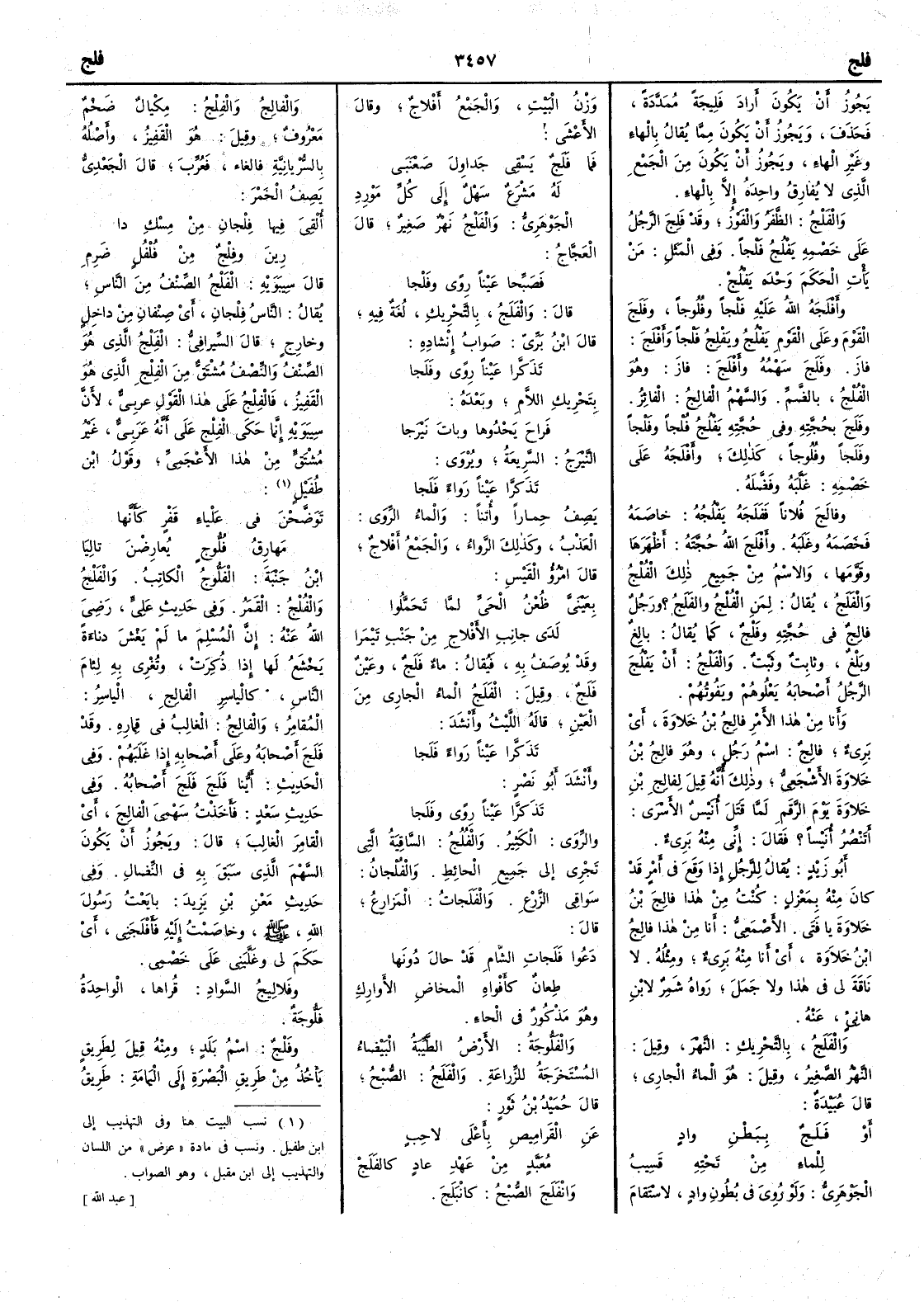 يجوز أَن يكون أَراد فَلِيجَةً مُمَدَّدَةً فحذف ويجوز أَن يكون مما يقال بالهاء وغير الهاء ويجوز أَن يكون من الجمع الذي لا يفارق واحده إِلا بالهاء والفَلْجُ الظَّفَرُ والفَوْزُ وقد فَلَجَ الرجلُ على خَصْمِه يَفْلُجُ فَلْجاً وفي المثل مَنْ يَأْتِ الحَكَمَ وَحْدَه يَفْلُجْ وأَفْلَجَه الله عليه فَلْجاً وفُلُوجاً وفَلَجَ القومَ وعلى القومِ يَفْلُجُ ويَفْلِجُ فَلْجاً وأَفْلَجَ فازَ وفَلَجَ سَهْمُه وأَفْلَجَ فاز وهو الفُلْجُ بالضم والسهْمُ الفالِجُ الفائِزٌ وفَلَجَ بحُجَّتِه وفي حجته يَفْلُجُ فُلْجاً وفَلْجاً وفَلَجاً وفُلُوجاً كذلك وأَفْلَجَه على خَصْمِه غَلَّبَه وفَضَّلَه وفالَجَ فلاناً فَفَلَجَه يَفْلُجُه خاصَمه فخصَمَه وغَلَبَه وأَفْلَجَ اللهُ حجته أَظْهَرها وقَوَّمَها والاسم من جميع ذلك الفُلْجُ والفَلَجُ يقال لمن الفُلْجُ والفَلَجُ ؟ ورجل فالِجٌ في حُجَّته وفَلْجٌ كما يقال بالِغٌ وبَلْغٌ وثابتٌ وثَبْتٌ والفَلْجُ أَن يَفْلُجَ الرجلُ أَصحابَه يَعْلُوهم ويَفُوتُهُمْ وأَنا من هذا الأَمر فالِجُ بنُ خَلاوةَ أَي بِريءٌ فالِجٌ اسم رجل وهو فالج بن خَلاوةَ الأَشجعي وذلك أَنه قيل لفالج بن خَلاوةَ يوم الرَّقَمِ لما قَتَلَ أُنَيْسٌ الأَسْرى أَتَنْصُرُ أُنَيْساً ؟ فقال إِنِّي منه بريء أَبو زيد يقال للرجل إِذا وقع في أَمر قد كان منه بمعزل كنتَ من هذا فالِجَ بنَ خَلاوةَ يا فتى الأَصمعي أَنا من هذا فالج بن خلاوة أَي أَنا منه بريء ومثله لا ناقةَ لي في هذا ولا جَمَلَ رواه شمر لابن هانئ عنه والفَلَجُ بالتحريك النهر وقيل النهر الصغير وقيل هو الماء الجاري قال عبيد أَو فَلَجٌ بِبَطْنِ وادٍ للماءِ من تَحْتِه قَسِيبُ الجوهري ولو روي في بُطونِ وادٍ لاستقامَ وزن البيت والجمع أَفْلاجٌ وقال الأَعشى فما فَلَجٌ يَسْقِي جَداوِلَ صَعْنَبَى له مَشْرَعٌ سَهْلٌ إِلى كلِّ مَوْرِدِ الجوهري والفَلْج نهر صغير قال العجاج فَصَبِّحا عَيْناً رِوًى وفَلْجا قال والفَلَجُ بالتحريك لغة فيه قال ابن بري صواب إِنشاده تَذَكَّرا عَيْناً رِوًى وفَلَجا بتحريك اللام وبعده فَراحَ يَحْدُوها وباتَ نَيْرَجا النَّيْرَجُ السريعة ويروى تَذَكَّرا عَيْناً رَواءً فَلَجا يصف حماراً وأُتُناً والماءٌ الرِّوي العَذْبُ وكذلك الرَّواءُ والجمع أَفْلاجٌ قال امرؤ القيس بِعَيْنَيَّ ظُعْنُ الحَيِّ لمَّا تَحَمَّلُوا لَدى جانِبِ الإَفْلاجِ منْ جَنْبِ تَيْمَرا وقد يوصف به فيقال ماء فَلَجٌ وعين فَلَج وقيل الفَلَجُ الماء الجاري من العين قاله الليث وأَنشد تذكَْرا عيناً رَواءً فَلَجا وأَنشد أَبو نصر تذكَّرا عيناً رِوًى وفَلَجا والرِّوى الكثير والفُلُجُ الساقِيةُ التي تَجْري إِلى جميع الحائطِ والفُلْجانُ سواقي الزَّرْع والفَلَجاتُ المَزارِعُ قال دَعُوا فَلَجاتِ الشامِ قدْ حال دُونَها طِعانٌ كأَفْواهِ المخاضِ الأَوارِكِ وهو مذكور في الحاء والفَلُّوجةُ الأَرض الطيِّبَةُ البَيْضاءُ المُسْتَخْرَجةُ للزراعةِ والفَلَجُ الصبح قال حميد بن ثور عن القَرامِيصِ بأَعْلى لاحِبٍ مُعَبَّدٍ من عَهْدِ عادٍ كالفَلَجْ وانْفَلَجَ الصبْحُ كانْبَلَجَ والفالِجُ والفِلْجُ مِكيالٌ ضخم معروف وقيل هو القَفِيز وأَصله بالسُّرْيانية فالغاء فعُرِّب قال الجعدي يصف الخمر أُلْقِيَ فيها فِلْجانِ مِنْ مِسْكِ دا رِينَ وفِلْجٌ مِنْ فُلْفُلٍ ضَرِمِ قال سيبويه الفَِلْج الصِّنْفُ من الناس يقال الناسُ فِلْجانِ أَي صِنْفانِ من داخلٍ وخارج قال السيرافي الفَِلْجُ هو الصِّنْفُ والنِّصْفُ مشتق من الفِلْجِ الذي هو القَفِيزُ فالفِلج على هذا القول عربي لأَن سيبويه إِنما حكى الفلج على أَنه عربي غير مشتقّ من هذا الأَعجمي وقول ابن طفيل تَوَضَّحْنَ في عَلْياء قَفْرٍ كأَنَّها مَهارِقُ فَلُّوجٍ يُعارِضْنَ تاليَا ابن جنبة الفَلُّوجُ الكاتِبُ والفَلْجُ والفُلْجُ القَمْرُ وفي حديث علي رضي الله عنه إِن المُسْلِم ما لم يَغْشَ دناءةً 
