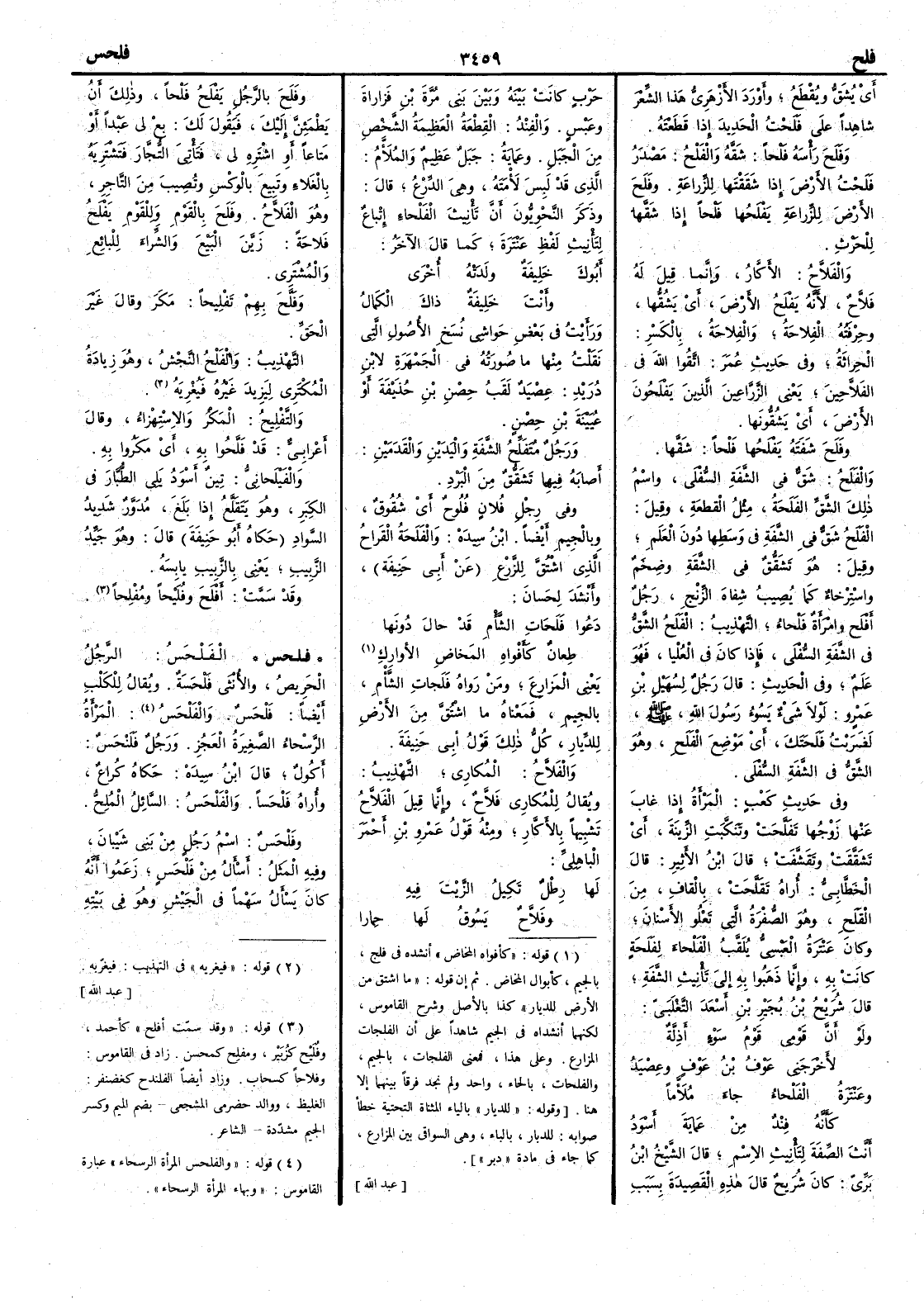 أَي يُشَقُّ ويُقطع وأَورد الأَزهري هذا الشعر شاهداً على فَلَحْتُ الحديث إِذا قطعته وفَلَحَ رأَسه فَلْحاً شَقَّه والفَلْحُ مصدر فَلَحْتُ الأَرض إِذا شققتها للزراعة وفَلَح الأَرضَ للزراعة يَفْلَحُها فَلْحاً إِذا شقها للحرث والفَلاَّح الأَكَّارُ وإِنما قيل له فَلاَّحٌ لأَنه يَفْلَحُ الأَرضَ أَي يَشقها وحِرْفَتُه الفِلاحة والفِلاحةُ بالكسر الحِراثة وفي حديث عمر اتقوا الله في الفَلاَّحينَ يعني الزَّرَّاعين الذين يَفْلَحونَ الأَرض أَي يشقُّونها وفَلَح شَفَته يَفْلَحها فَلْحاً شقها والفَلَحُ شَقٌّ في الشفة السفلى واسم ذلك الشَّقِّ الفَلَحةُ مثل القَطَعةِ وقيل الفَلَحُ شق في الشفة في وسطها دون العَلَمِ وقيل هو تَشَقُّق في الشفة وضِخَمٌ واسترخاء كما يُصِيبُ شِفاهَ الزِّنْجِ رجل أَفْلَحُ وامرأَة فَلْحاء التهذيب الفَلَحُ الشق في الشفة السفلى فإِذا كان في العُلْيا فهو عَلَم وفي الحديث قال رجل لسُهَيلِ بن عمرو لولا شيء يَسُوءُ رسولَ الله صلى الله عليه وسلم لضَرَبْتُ فَلَحَتك أَي موضع الفَلَح وهو الشَّق في الشفة السفلى وفي حديث كعب المرأَة إِذا غاب عنها زوجها تَفَلَّحَتْ وتَنَكَّبَتِ الزينةَ أَي تشَقَّقَت وتَقَشَّفَت قال ابن الأَثير قال الخطابي أُراه تَقَلَّحَتْ بالقاف من القَلَحِ وهو الصُّفْرَة التي تعلو الأَسنان وكان عَنْتَرَةُ العَبْسِيُّ يُلَقَّبُ الفَلْحاءَ لفَلَحةٍ كانت به وإِنما ذهبوا به إِلى تأْنيث الشَّفَة قال شُرَيْحُ بن بُجَيْرِ بن أَسْعَدَ التَّغْلَبيّ ولو أَن قَوْمي قومُ سَوْءٍ أَذِلَّةٌ لأَخْرَجَني عَوْفُ بنُ عَوْفٍ وعِصْيَدُ وعَنْتَرَةُ الفَلْحاءُ جاءَ مُلأَّماً كأَنه فِنْدٌ من عَمايَةَ أَسْوَدُ أَنث الصفة لتأْنيث الاسم قال الشيخ ابن بري كان شريح قال هذه القصيدة بسبب حرب كانت بينه وبين بني مُرَّة بن فَزارةَ وعَبْسٍ والفِنْدُ القطعة العظيمة الشَّخْصِ من الجبل وعَماية جبل عظيم والمُلأَّمُ الذي قد لَبِسَ لأْمَتَه وهي الدرع قال وذكر النحويون أَن تأْنيث الفلحاء إِتباع لتأْنيث لفظ عنترة كما قال الآخر أَبوكَ خَلِيفةٌ ولَدَتْه أُخْرى وأَنتَ خلِيفَةٌ ذاك الكَمالُ ورأَيت في بعض حواشي نسخ الأُصول التي نقلت منها ما صورته في الجمهرة لابن دريد عِصْيدٌ لقب حِصْنِ ابن حذيفة أَو عُيَيْنَة بن حِصْنٍ ورجل مُتَفَلِّح الشَّفَة واليدين والقدمين أَصابه فيهما تَشَقُّقٌ من البَرْد وفي رِجْل فلان فُلُوحٌ أَي شُقُوق وبالجيم أَيضاً ابن سيده والفَلَحَة القَراح الذي اشْتُقَّ للزرع عن أَبي حنيفة وأَنشد لِحَسَّانَ دَعُوا فَلَحَاتِ الشَّأْمِ قد حال دونها طِعانٌ كأَفْواهِ المَخاضِ الأَوارِكِ