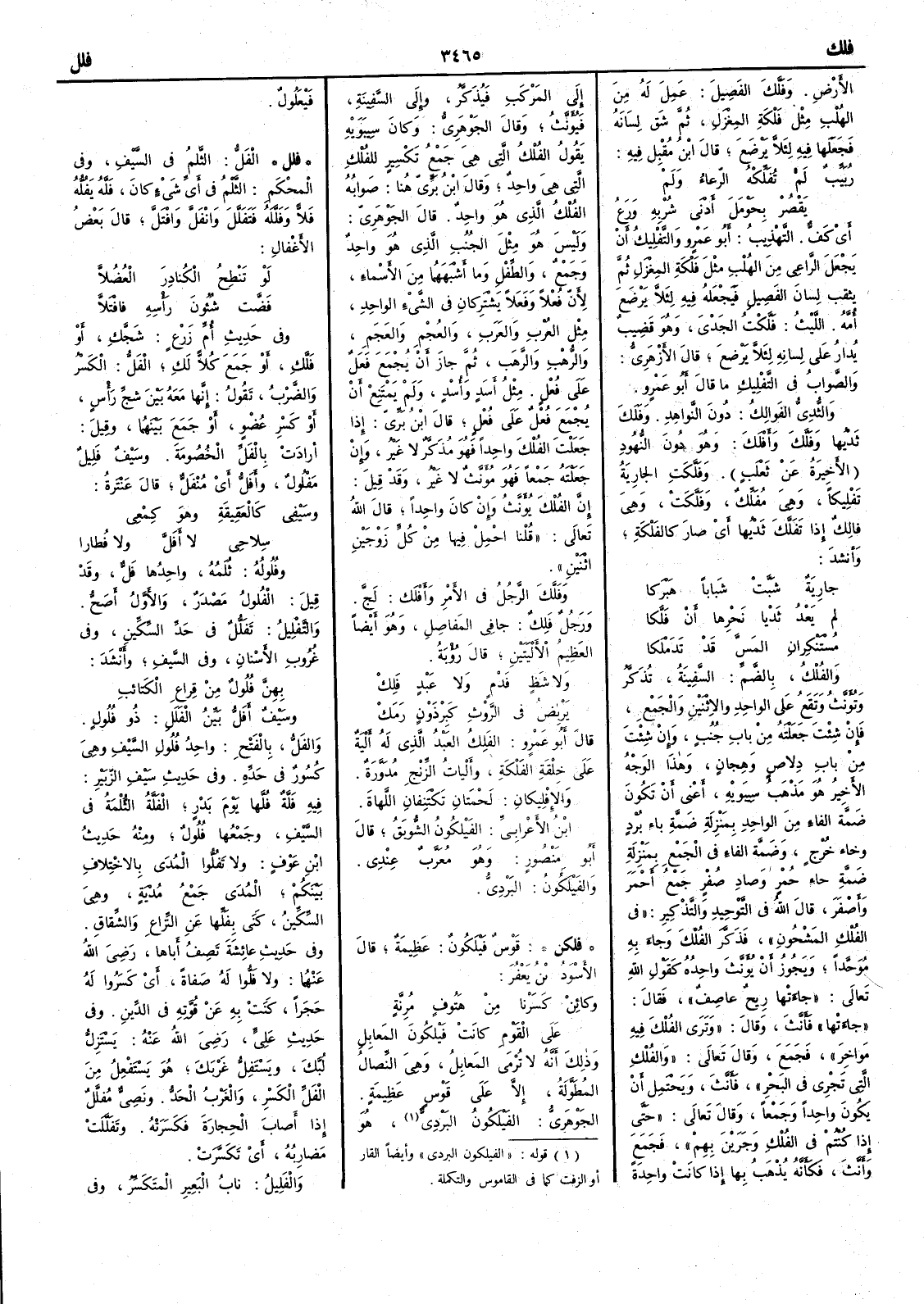 الأَرض وفَلَّك الفصيلَ عمل له من الهُلْبِ مثل فَلْكَة المغزل ثم شق لسانه فجعلها فيه لئلا يَرْضَع قال ابن مُقبل فيه رُبَيِّبٌ لم تُفَلِّكْهُ الرّعاءُ ولم يَقْصُرْ بحَومَلَ أَدْنى شُرْبه ورَعُ أَي كَفٌّ التهذيب أَبو عمرو والتَّفْلِيك أَن يجعل الراعي من الهُلْب مثلَ فَلْكة المِغْزل ثم يثقب لسان الفصيل فيجعله فيه لئلا يرضع أُمه الليث فَلَّكْتُ الجَدْيَ وهو قَضِيب يُدارعلى لسانه لئلا يرضع قال الأَزهري والصواب في التَّفْليك ما قال أَبوعمرو والثُّدِيُّ الفَوالك دون النَّواهِد وفَلَكَ ثديُها وفَلَّكَ وأَفْلَكَ وهو دون النهود الأَخيرة عن ثعلب وفَلَّكَتِ الجارية تَفْلِيكاً وهي مُفَلِّكٌ وفَلَّكَتْ وهي فالك إذا تَفَلَّكَ ثديُها أَي صار كالفَلْكة وأَنشد جاريةٌ شَبَّتْ شباباً هَبْرَكا لم يَعْدُ ثَدْيا نَحْرِها أَن فَلَّكا مُسْتَفْكِرانِ المَسَّ قَدْ تَدَمْلَكا والفُلْكُ بالضم السفينة تذكر وتؤنث وتقع على الواحد والاثنين والجمع فإن شئت جعلته من باب جُنُبٍ وإن شئت من بابِ دلاصٍ وهِجانٍ وهذا الوجه الأَخير هو مذهب سيبويه أَعني أَن تكون ضمة الفاء من الواحد بمنزلة ضمة باء بُرْد وخاء خُرْج وضمة الفاء في الجمع بمنزل ضمة حاءُ حُمْر وصاد صُفْر جمع أَحمر وأَصفر قال الله في التوحيد والتذكير في الفُلْك المشحون فذكَّر الفُلْك وجاء به مُوَحّداً ويجوز أَن يؤنث واحده كقول الله تعالى جاءتها ريح عاصف فقال جاءتها فأنث وقال وترى الفُلْك فيه مواخر فجمع وقال تعالى والفُلْكِ التي تجري في البحر فأَنث ويحتمل أَن يكون واحداً وجمعاً وقال تعالى حتى إذا كنتم في الفُلْكِ وجَرَيْنَ بهم فجع وأَنث فكأَنه يُذْهب بها إذا كانت واحدة إلى المَرْكَب فيذكر وإلى السفينة فيؤنث وقال الجوهري وكان سيبويه يقول الفُلْكُ التي هي جمع تكسير للفُلْك التي هي واحد وقال ابن بري هنا صوابه الفُلْكُ الذي هو واحد قال الجوهري وليس هو مثل الجُِنُبِ الذي هو واحد وجمع والطِّفْلِ وما أَشبههما من الأَسماء لأَن فُعْلاً وفَعَلاً يشتركان في الشيء الواحد مثل العُرْب والعَرَب والعُجْم والعَجَم والرُّهْب والرَّهَب ثم جاز أَن يجمع فَعَل على فُعْل مثل أَسَدٍ وأُسْدٍ ولم يمتنع أَن يجمع فُعْل على فُعْلٍ قال ابن بري إذا جعلت الفلك واحداً فهو مذكر لا غير وإن جعلته جمعاً فهو مؤنث لا غير وقد قيل إن الفلك يؤنث وإن كان واحداً قال الله تعالى قلنا احمل فيها من كل زوجين اثنين وفَلَّكَ الرجلُ في الأَمر وأَفْلَك لَجَّ ورجل فَلِكٌ جافي المَفاصِل وهو أَيضاً العظيم الأَلْيتين قال رؤبة ولا شَظٍ فَدْمٍ ولا عَبْدٍ فَلِكْ يَرْبِضُ في الرَّوْثِ كبِرْذَوْنٍ رَمَكْ قال أَبو عمرو الفَلِكُ العبد الذي له أَلية على خلقة الفَلْكَة وأَلْياتُ الزِّنْج مُدوَّرة والإفْلِيكانِ لَحْمتانِ تكتنفان اللَّهاةَ ابن الأَعرابي الفَيْلَكُون الشُّوْبَقُ قال أَبو منصور وهو مُعَرَّب عندي والفَيْلَكُونُ البَرْدِيّ ( فلكن ) قَوْسٌ فَيْلَكُونٌ عظيمة قال الأَسوَدُ ابنُ يَعفُرَ وكائِنْ كَسَرْنا من هَتُوفٍ مُرِنَّةٍ على القومِ كانتْ فَيْلكُونَ المَعابِلِ وذلك أَنه لا تُرْمى المعابلُ وهي النِّصال المُطَوَّلة إِلا على قَوْسٍ عظيمة الجوهري الفَيْلَكُونُ البَرْدِيُّ هو فَيعَلُول ( فلل ) الفَلُّ الثَّلْم في السيف وفي المحكم الثَّلْم في أَيّ شيء كان فَلَّه يفُلُّه فَلاًّ وَفَلَّلَه فتفَلَّل وانفَلَّ وافْتَلَّ قال بعض الأَغْفال لو تنطِح الكُنادِرَ العُضْلاَّ فَضَّت شُؤونَ رأْسِه فافْتَلاَّ وفي حديث أُمّ زَرْع شَجَّكِ أَو فَلَّكِ أَو جَمَع كُلاًّ لَكِ الفلُّ الكسر والضرب تقول إِنها معه بين شجّ رأْس أَو كسر عُضو أَو جمع بينهما وقيل أَرادت بالفَلِّ الخصومة وسيف فَلِيل مَفْلول وأَفَلُّ أَي مُنْفَلٌّ قال عنترة وسَيْفي كالعَقِيقة وهو كِمْعي سِلاحي لا أَفَلَّ ولا فُطارا وفُلولُه ثُلَمُه واحدها فَلٌّ وقد قيل الفُلول مصدر والأَول أَصح والتَّفْلِيل تَفَلُّل ف