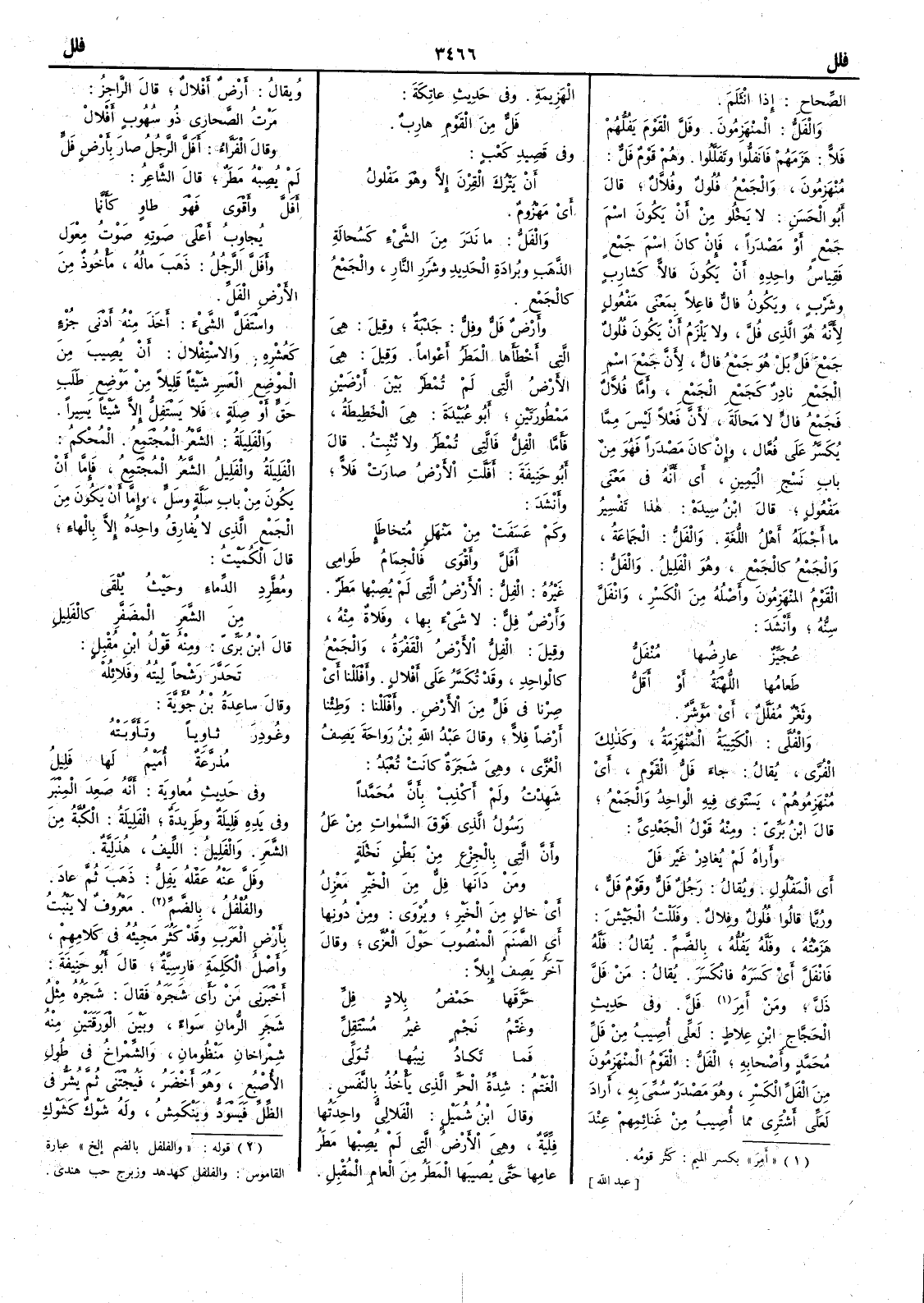 الصحاح إِذا انثلَم والفَلُّ المنهزِمون وفَلَّ القومَ يفُلُّهم فلاًّ هزمهم فانفَلُّوا وتَفَلَّلوا وهم قوم فَلٌّ منهزمون والجمع فُلول وفُلاَّل قال أَبو الحسن لا يخلو من أَن يكون اسم جمع أَو مصدراً فإِن كان اسم جمع فقياس واحده أَن يكون فالاًّ كشارِب وشَرْب ويكون فالٌّ فاعلاً بمعنى مفعول لأَنه هو الذي فُلَّ ولا يلزم أَن يكون فُلولٌ جمعَ فَلٍّ بل هو جمع فالٍّ لأَن جمع اسم الجمع نادِر كجمع الجمع وأَمَّا فُلاَّل فجمع فالٍّ لا محالة لأَن فَعْلاً ليس مما يكسر على فُعَّال وإِن كان مصدراً فهو من باب نَسْج اليمين أَي أَنه في معنى مفعول قال ابن سيده هذا تفسير ما أَجمله أَهل اللغة والفَلُّ الجماعة والجمع كالجمع وهو الفَلِيل والفَلُّ القوم المنهزمون وأَصله من الكسر وانْفَلّ سِنُّه وأَنشد عُجَيِّز عارِضُها مُنْفَلُّ طَعامُها اللُّهْنةُ أَو أَقَلُّ وثَغْر مُفَلَّل أَي مؤشَّر والفُلَّى الكتيبة المُنْهزمة وكذلك الفُرَّى يقال جاء فَلُّ القوم أَي منهزموهم يستوي فيه الواحد والجمع قال ابن بري ومنه قول الجعدي وأَراه لم يُغادِر غير فَل أَي المَفْلول ويقال رجل فَلٌّ وقوم فَلٌّ وربما قالوا فَلُول وفِلال وفَلَلْت الجيش هزمته وفَلَّه يفُلُّه بالضم يقال فَلَّه فانفَلَّ أَي كسره فانكسر يقال مَن فَلَّ ذلّ ومن أُمِرَ فَلّ وفي حديث الحجاج بن عِلاط لعلّي أُصِيبُ من فَلِّ محمد وأَصحابه الفَلُّ القوم المنهزمون من الفَلِّ الكسر وهو مصدر سمي به أَراد لعلّي أَشتري مما أُصيب من غنائمهم عند الهزيمة وفي حديث عاتكة فَلّ من القوم هارب وفي قصيد كعب ان يترك القِرْن إِلاَّ وهو مَفْلولُ أَي مهزوم والفَلُّ ما نَدَر من الشيء كسُحالة الذهب وبُرادة الحديد وشَرَر النار والجمع كالجمع وأَرض فَلٌّ وفِلٌّ جَدْبة وقيل هي التي أَخطأَها المطر أَعواماً وقيل هي الأَرض التي لم تمطرَ بين أَرْضَين ممطورتين أَبو عبيدة هي الخَطِيطة فأَما الفِلُّ فالتي تمطَر ولا تُنبِت قال أَبو حنيفة أَفَلَّت الأَرض صارت فَلاًّ وأَنشد وكم عسَفت من مَنْهَل مُتخاطَإٍ أَفَلَّ وأَقْوى فالجِمَام طَوامِي غيره الفِلُّ الأَرض التي لم يصبها مطر وأَرض فلٌّ لا شيء بها وفَلاةٌ منه وقيل الفِلُّ الأَرض القفرة والجمع كالواحد وقد تكسَّر على أَفْلال وأَفْلَلْنا أَي صرنا في فَلٍّ من الأَرض وأَفْلَلْنا وطئنا أَرضاً فِلاًّ وقال عبد الله بن رواحة يصف العُزَّى وهي شجرة كانت تُعبد شَهِدْت ولم أَكذِب بأَنَّ محمداً رسولُ الذي فوق السموات من عَلُ وأَنَّ التي بالجِزْع من بَطْن نخلةٍ ومَنْ دانَها فِلٌّ من الخير مَعزِلُ أَي خالٍ من الخير ويروى ومن دونها أَي الصَّنَم المنصوب حوْل العُزَّى وقال آخر يصف إِبلاً حَرَّقَها حَمْضُ بلادٍ فِلِّ وغَتْمُ نَجْم غير مُسْتَقِلِّ فما تكادُ نِيبُها تُوَلِّي الغتْم شدة الحر الذي يأْخذ بالنفَس وقال ابن شميل الفَلالِيُّ واحدته فِلِّيَّة وهي الأَرض التي لم يصبها مطر عامِها حتى يصيبها المطرُ من العام المقبل ويقال أَرض أَفْلال قال الراجز مَرْتُ الصَّحارِي ذُو سُهُوبٍ أَفْلالْ وقال الفراء أَفَلَّ الرجلُ صار بأَرض فَلٍّ لم يصبه مطر قال الشاعر أَفَلَّ وأَقْوَى فهو طاوٍ كأَنما يُجاوِبُ أَعْلى صَوتِه صوتُ مِعْوَل وأَفَلَّ الرجل ذهب ماله مأْخوذ من الأَرض الفَلِّ واسْتَفَلَّ الشيءَ أَخذ منه أَدنى جزء لعُسْره والاسْتِفْلال أَن يُصيب من الموضع العَسِر شيئاً قليلاً من موضع طلَب حقٍّ أَو صِلَة فلا يَسْتَفِلّ إِلا شيئاً يسيراً والفَلِيلة الشعر المجتمع المحكم الفَلِيلة والفَلِيل الشعر المجتمع فإِما أَن يكون من باب سَلَّة وسَلٍّ وإِما أَن يكون من الجمع الذي لا يفارق واحده إِلا بالهاء قال الكميت ومُطَّرِدِ الدِّماء وحيث يُلْقى من الشَّعَر المضَفَّر كالفَلِيل قال ابن بري ومنه قول ابن مقبل تَحَدَّرَ رَشْحاً لِيتُه وفَلائِلُه وقال ساعدة بن جؤية وغُودِرَ ثاوِياً وتَأَوَّبَتْه مُذرَّعةٌ أُمَيْمُ لها فَلِيلُ وفي حدي