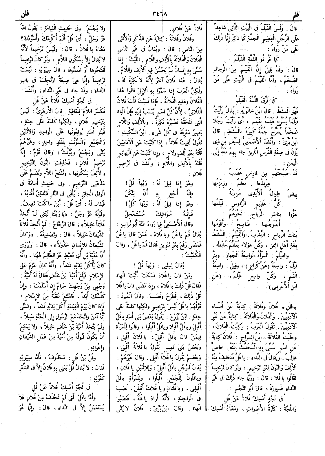 ( فلن ) فُلانٌ وفُلانَةُ كناية عن أَسماء الآدميين والفُلانُ والفُلانَةُ كناية عن غير الآدميين تقول العرب رَكِبْتُ الفُلانَ وحَلَبْتُ الفُلانة ابن السَّرَّاج فُلانٌ كناية عن اسم سمي به المُحَدَّثُ عنه خاص غالب ويقال في النداء يا فُلُ فتحذف منه الأَلف والنون لغير ترخيم ولو كان ترخيماً لقالوا يا فُلا قال وربما جاء ذلك في غير النداء ضرورة قال أَبو النجم في لَجَّةٍ أَمْسِكْ فلاناً عن فُلِ واللجة كثرة الأَصوات ومعناه أَمسك فلاناً عن فلان وفلانٌ وفلانةُ كناية عن الذكر والأُنثى من الناس قال ويقال في غير الناس الفُلانُ والفُلانَةُ بالأَلف واللام الليث إِذا سمي به إِنسان لم يحسن فيه الأَلف واللام يقال هذا فلانٌ آخَرُ لأَنه لا نكرة له ولكن العرب إِذا سَمَّوْابه الإِبلَ قالوا هذا الفُلانُ وهذه الفُلانة فإِذا نسبت قلت فلانٌ الفُلانِيُّ لأَن كل اسم ينسب إِليه فإِن الياء التي تلحقه تصيره نكرة وبالأَلف واللام يصير معرفة في كل شيء ابن السكيت تقول لقيت فلاناً إِذا كَنَيْت عن الآدميين قلته بغير أَلف ولام وإِذا كَنَيْتَ عن البهائم قلته بالأَلف واللام وأَنشد في ترخيم فلان وهْوَ إِذا قيل له وَيْهاً فُلُ فإِنه أَحْجِ بِه أَن يَنْكَلُ وهْو إِذا قيل له وَيْهاً كُلُ فإِنه مُوَاشِكٌ مُسْتَعْجِلُ وقال الأَصمعي فيما رواه عنه أَبو تراب يقال قم يا فُلُ ويا فُلاه فمن قال يا فُلُ فمضى فرفع بغير تنوين فقال قم يا فُلُ وقال الكميت يقالُ لمِثْلِي وَيْهاً فُلُ ومن قال يا فُلاه فسكن أَثبت الهاء فقال قُلْ ذلك يا فُلاه وإِذا مضى قال يا فُلا قل ذلك فطرح ونصب وقال المبرد قولهم يا فُلُ ليس بترخيم ولكنها كلمة على حِدَةٍ ابن بُزُرْج يقول بعض بني أَسدٍ يا فُلُ أَقبل ويا فُلُ أَقبلا ويا فُلُ أَقبلوا وقالوا للمرأَة فيمن قال يا فُلُ أَقْبِلْ يا فُلانَ أَقبلي وبعض بني تميم يقول يا فُلانَةُ أَقبلي وبعضهم يقول يا فُلاةً أَقبلي وقال غيرهم يقال للرجل يا فُلُ أَقبل وللاثنين يا فُلانِ ويا فُلُونَ للجمع أَقبلوا وللمرأَة يا فُلَ أَقْبِلي ويا فُلَتانِ ويا فُلاتُ أَقْبِلْنَ نصب في الواحدة لأَنه أَراد يا فُلَة فنصبوا الهاء وقال ابن بري فلانٌ لا يثنى ولا يجمع وفي حديث القيامة يقول الله عز وجل أَي فُلْ أَلم أُكْرِمْكَ وأُسَوِّدْكَ ؟ معناه يا فلانُ قال وليس ترخيماً لأَنه لا يقال إِلا بسكون اللام ولو كان ترخيماً لفتحوها أَو ضموها قال سيبويه ليست ترخيماً وإِنما هي صيغة ارْتُجِلَتْ في باب النداء وقد جاء في غير النداء وأَنشد في لَجَّةٍ أَمْسِكْ فلاناً عن فُلِ فكسر اللام للقافية قال الأَزهري ليس بترخيم فُلانٍ ولكنها كلمة على حدة فبنو أَسد يُوقِعُونَها على الواحد والاثنين والجمع والمؤنث بلفظ واحد وغيرهم يثني ويجمع ويؤنث وقال قوم إِنه ترخيم فلان فحذفت النون للترخيم والأََلف لسكونها وتفتح اللام وتضم على مذهبي الترخيم وفي حديث أُسامة في الوالي الجائر يُلْقى في النار فَتَنْدَلِقُ أَقْتابُه فيقال له أَي فُلْ أَين ما كنت تَصِفُ وقوله عز وجل يا ويلَتا ليتني لم أَتَّخِذْ فلاناً خليلاً قال الزجاج لم أَتخذ فلاناً الشيطانَ خليلاً قال وتصديقُه وكان الشيطان للإِنسان خَذُولاً قال ويروى أَن عُقْبة بن أَبي مُعَيْطٍ هو الظالم ههنا وأَنه كان يأْكل يديه نَدَماً وأَنه كان عزم على الإِسلام قبلغ أُمَيَّةَ ابن خَلَفٍ فقال له أُميةُ وَجْهِي من وَجْهِك حرامٌ إِن أَسلمت وإِن كَلَّمْتُكَ أَبداً فامتنع عقبة من الإِسلام فإِذا كان يوم القيامة أَكل يديه ندماً وتمنى أَنه آمن واتخذ مع الرسول إِلى الجنة سبيلاً ولم يتخذ أُمية بن خلف خليلاً ولا يمتنع أَن يكون قبوله من أُمية من عمل الشيطان وإِغوائه وفُلُ بن فُلٍ محذوف فأَما سيبويه فقال لا يقال فُل يعني به فلان إِلا في الشعر كقوله في لجة أَمسك فلاناً عن فُلِ وأَما يا فُلْ التي لم تحذف من فلان فلا يستعمل إِلا في النداء قال وإِنما هو