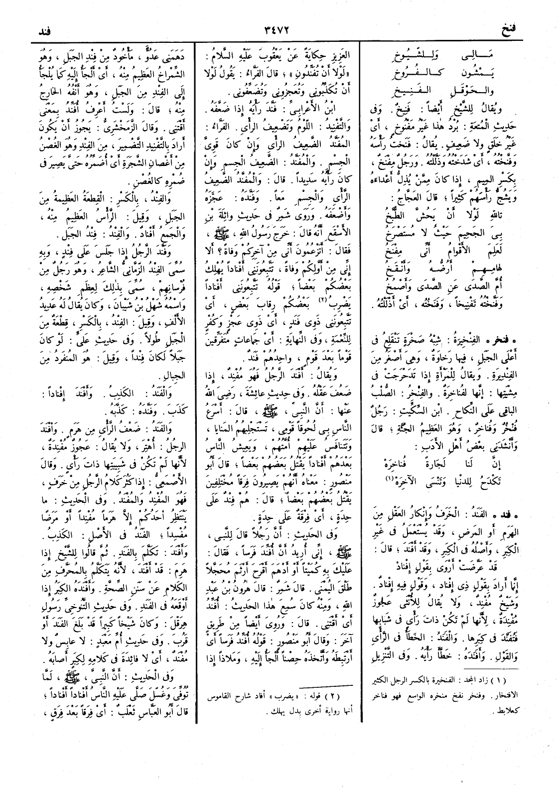 ( فنخر ) الفِنْخِيرة شبه صخرة تنقلع في أَعلى الجبل فيها رَخاوة وهي أَصغر من الفِنْدِيرة ويقال للمرأَة إِذا تَدَحْرَجت في مِشْيَتِها إِنها لفُناخِرة والفِنْخِرُ الصُّلْبُ الباقي على النكاح ابن السكيت رجل فُنْخُر وفُناخِرٌ وهو العظيم الجُثَّة قال وأَنشدني بعض أَهل الأَدب إِنَّ لنا لَجارةً فُناخِره تَكْدَحُ للدنيا وتَنْسى الآخره( فند ) الفَنَدُ الخَرَفُ وإِنكار العقل من الهَرَم أَو المَرضِ وقد يستعمل في غير الكِبَر وأَصله في الكبر وقد أَفند قال قد عَرَّضَتْ أَرْوَى بِقَوْلٍ إِفْناد إِنما أَراد بقَوْلٍ ذي إِفناد وقَوْلٍ فيه إِفناد وشيخ مُفْنِدٌ ولا يقال للأُنثى عجوز مُفْنِدَة لأَنها لم تكن ذات رأْي في شبابها فَتُفَنَّدَ في كِبَرها والفَنَدُ الخطأُ في الرأْي والقول وأَفْنَدَه خطَّأَ رَأْيَه وفي التنزيل العزيز حكاية عن يعقوب عليه السلام لولا أَن تُفَنِّدُونِ قال الفراء يقول لولا أَن تُكَذِّبوني وتُعَجِّزُوني وتُضَعِّفُوني ابن الأَعرابي فَنَّدَ رأْيه إِذا ضَعَّفَه والتَّفْنيدُ اللَّوْمُ وتضعيفُ الرأْي الفراء المُفَنَّدُ الضعيفُ الرأْي وإِن كان قويَّ الجسم والمُفَنَّدُ الضعيفُ الجسم وإِن كان رأْيه سديداً قال والمفند الضعيف الرأْي والجسم معاً وفَنَّدَه عَجَّزَه وأَضْعَفَه وروى شمر في حديث واثلة بن الأَسقع أَنه قال خرج رسول الله صلى الله عليه وسلم فقال أَتزعمون أَنِّي من آخِرِكم وفاةً ؟ أَلا إِني من أَوَّلِكم وفاةً تتبعونني أَفْناداً يُهْلِكُ بعضُكم بعضاً قوله تتبعونني أَفناداً يضرِبُ