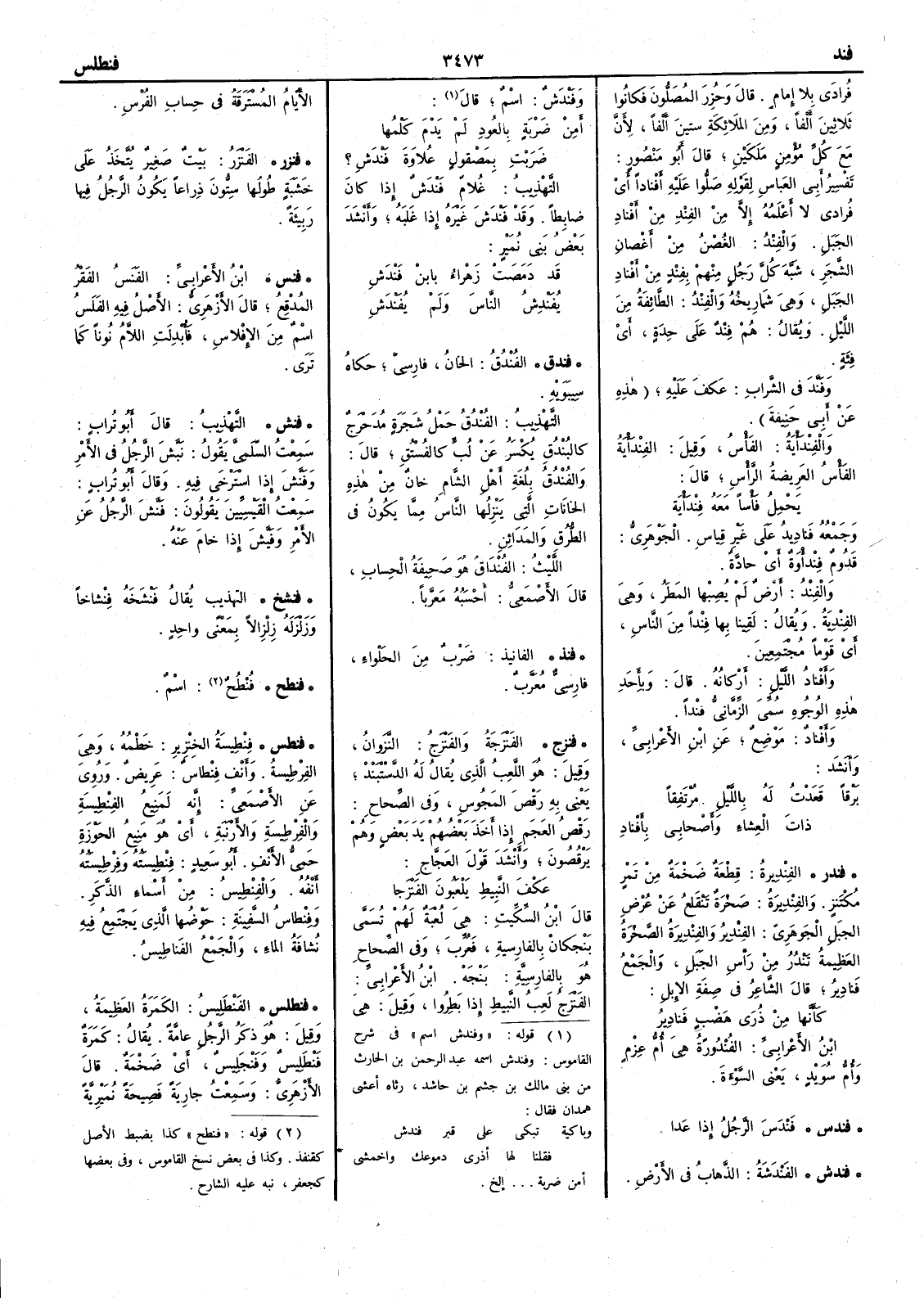 ( فنس ) ابن الأَعرابي الفَنَس الفَقْر المُدْقِع قال الأَزهري الأَصل فيه الفَلَس اسم من الإِفْلاس فأُبدلت اللام نُوناًِ كما ترى ( فنش ) التهذيب قال أَبو تراب سمعت السلمي يقول نَبَّشَ الرجلُ في الأَمر وفَنَّشَ إِذا اسْترْخى فيه وقال أَبو تراب سمعت القَيْسيِّين يقولون فَنَّشَ الرجل عن الأَمر وفَيَّش إِذا خامَ عنه ( فنشخ ) التهذيب يقال فَنْشَخَه فِنْشاخاً وزلزله زلزالاً بمعنى واحد ( فنطح ) فُنْطُحٌ اسم ( فنطس ) فِنْطِيسَة الخِنزير خَطْمُه وهي الفِرْطِيسة وأَنف فِنْطاس عَريض ورُوي عن الأَصمعي إِنه لَمَنِيعُ الفِنْطِيسَة والفِرْطِيسة والأَرْنَبة أَي هو منيع الحَوْزَة حَمِيُّ الأَنف أَبو سعيد فِنْطِيسته وفِرْطِيسته أَنفه والفِنْطِيس من أَسماء الذِّكَر وفِنْطاس السَّفِينة حَوْضُها الذي يجتمع فيه نُشافة الماء والجمع الفَناطِيس ( فنطلس ) الفَنْطَلِيس الكَمَرة العظيمة وقيل هو ذكَر الرجل عامة يقال كَمَرة فَنْطَلِيس وفَنْجَلِيس أَي ضخمة قال الأَزهري وسمعتُ جارية فصيحة نُمَيْريَّة