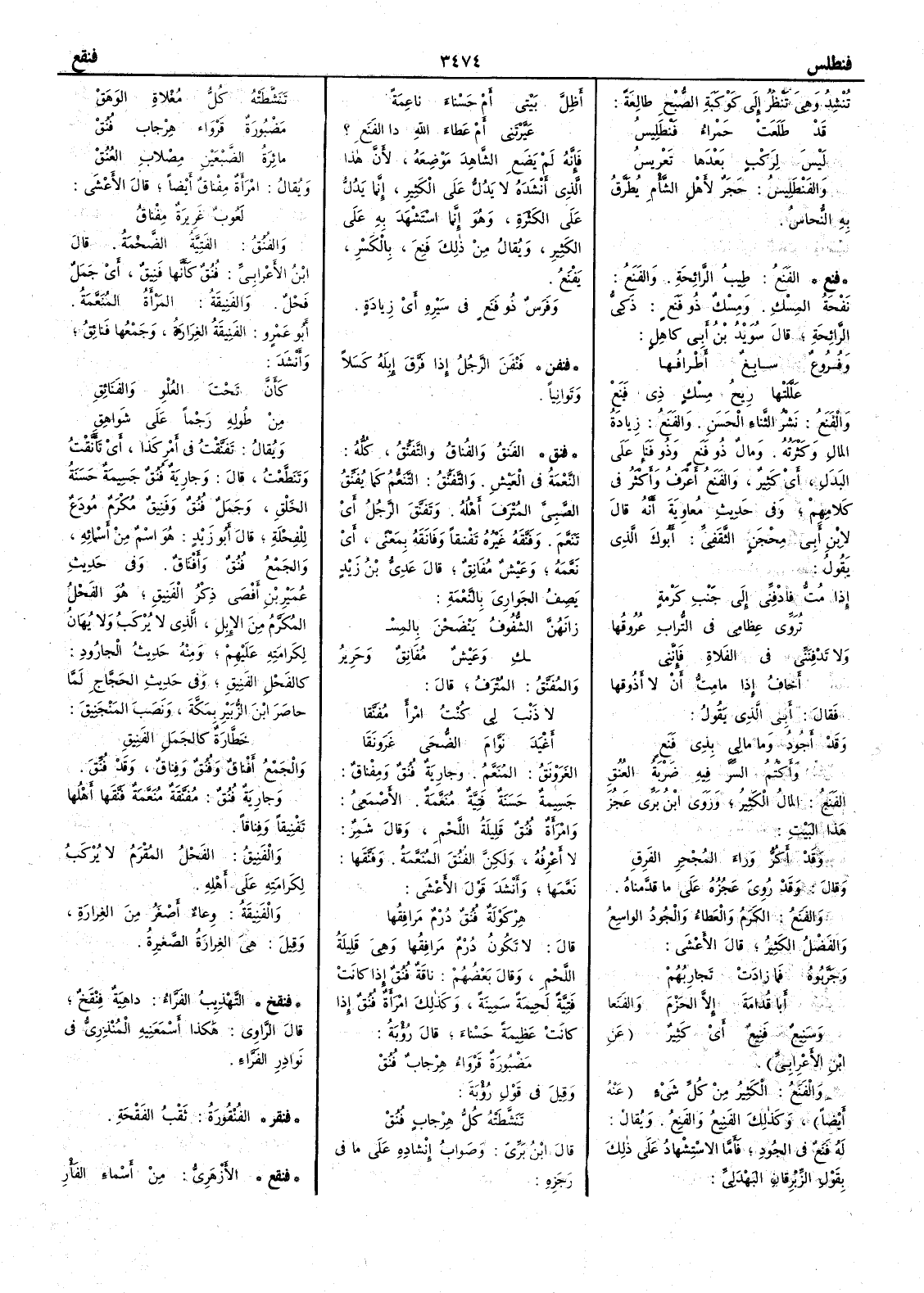 تُنْشِدُ وهي تنظر إِلى كَوكبة الصبح طالعة قد طَلَعَتْ حمراءُ فَنْطَلِيسُ لَيْسَ لِرَكْبٍ بعدها تَعْريسُ والفَنْطَلِيس حَجَر لأَهل الشأْم يُطَرِّق به النُّحاس ( فنع ) الفَنَعُ طِيبُ الرائحةِ والفَنَعُ نَفْحةُ المِسْكِ ومِسْكٌ ذو فَنَعٍ ذَكِيُّ الرائحة قال سويد بن أَبي كاهل وفُرُوع سابِغ أَطرافُها عَلَّلَتْها رِيحُ مِسْكٍ ذِي فَنَعْ والفَنَعُ نَشْرُ الثناءِ الحسَن والفَنَع زيادةُ المالِ وكَثْرَتُه ومالٌ ذو فَنَع وذو فَنَاءٍ على البدل أَي كثير والفَنَعُ أَعْرَفُ وأَكثر في كلامهم وفي حديث معاوية أَنه قال لابن أَبي مِحْجَنٍ الثَّقَفِيِّ أبوك الذي يقول إِذا مُتُّ فادْفِنِّي إِلى جَنْبِ كَرْمةٍ تُرَوِّي عِظامي في التُّرابِ عُرُوقُها ولا تَدْفِنَنِّي في الفَلاةِ فإِنَّني أَخافُ إِذا ما متُّ أَن لا أَذوقها فقال أَبي الذي يقول وقد أَجُودُ وما مالي بِِي فَنَعٍ وأَكْتُمُ السِّرَّ فيه ضَرْبةُ العُنُقِ الفنَعُ المالُ الكثير وروى ابن برّي عجز هذا البيت وقد أَكُرُّ وراءَ المُجْحِرِ الفَرِقِ وقال وقد روي عجزه على ما قدَّمناه والفَنَعُ الكَرَمُ والعَطاء والجُود الواسع والفضل الكثير قال الأَعشى وجَرَّبُوه فما زادَتْ تَجارِبُهُمْ أَبا قُدامَة إِلاَّ الحَزْمَ والفَنَعا وسَنِيعٌ فَنِيعٌ أَي كثير عن ابن الأَعرابي والفَنَعُ الكثير من كل شيء عنه أَيضاً وكذلك الفَنِيعُ والفَنِعُ ويقال له فَنَعٌ في الجود فأَما الاستشهاد على ذلك بقول الزبرقان البَهْدَليّ أَظِلَّ بَيْتِيَ أَمْ حَسْناءَ ناعمةً عَيَّرْتنِي أَمْ عَطاءَ اللهِ ذا الفَنَعِف فإِنه لم يضع الشاهد موضعه لأَن هذا الذي أَنشده لا يدل على الكثير إِنما يدل على الكثرة وهو إِنما استشهد به على الكثير ويقال من ذلك فَنِعَ بالكسر يَفْنَعُ وفرس ذو فَنَعٍ في سيره أَي زيادةٍ ( فنفن ) فَنْفَنَ الرجلُ إذا فَرَّقَ إبله كَسَلاً وتوانِياً ( فنق ) الفَنَقُ والفُناقُ والتَّفَنُّق كله النَّعْمة في العيش والتَّفَنُّق التَّنَعُّم كما يُفَنِّقُ الصبيَّ المُتْرَفَ أَهلُه وتَفَنَّق الرجل أي تنعم وفَنَّقَهُ غيره تَفْنِيقاً وفَانَقهُ بمعنى أي نَعّمه وعيش مُفانِقٌ قال عدي ابن زيد يصف الجواري بالنَّعْمة زانَهُنَّ الشُّفُوف يَنْضَحْنَ بالمِسْ ك وعيشٌ مُفَانِقٌ وحَرِيرُ والمُفَنَّق المُتْرَف قال لا ذَنْبَ لي كنت امْرأً مُفَنَّقاً أَغْيَدَ نَوَّامَ الضُّحى غَرَِوْنَقَا الغَرَوْنَقُ المُنَعَّم وجارية فُنُق ومِفْناق جسيمة حسنة فَتِيَّة مُنَعَّمة الأصعمي وامرأَة فُنُق قليلة اللحم قال شمر لا أَعرفه ولكن الفُنُق المُنَعَّمة وفَنَّقها نعَّمها وأَنشد قول الأعشى هِرْكَوْلَةٌ فُنُقٌ دُرْمٌ مَرافِقُها قال لا تكون دُرْمٌ مَرافقها وهي قليلة اللحم وقال بعضهم ناقة فُنُق إذا كانت فَتِيَّة لَحِيمةً سمينة وكذلك امرأَة فُنُق إذا كانت عظيمة حسناء قال رؤبة مَضْبُورةٌ قَرْوَاءُ هِرْجابٌ فُنُقْ وقيل في قول رؤبة تَنَشَّطَتْهُ كلُّ هِرْجابٍ فُنُقْ قال ابن بري وصواب إنشاده على ما في رجزه تَنَشْطَتْهُ كلُّ مُغْلاةِ الوَهَقْ مَضْبورَةٌ قَرْوَاءُ هرْجابٌ فُنُقْ مائِرَةٌ الضَّبْعَيْنِ مِصْلابُ العُنُقْ ويقال امرأَة مِفْناق أَيضاً قال الأَعشى لَعُوب غَرِيَرة مِفْناق والفُنُق الفَتِيّة الضخمة قال ابن الأَعرابي فُنُق كأَنها فَنِيقٌ أَي جمل فحل والفَنِيقةُ المرأَة المُنَعَّمة أبو عمرو الفَنِيقةُ الغِرَارةُ وجمعها فَنَائق وأَنشد كأَن تَحْتَ العُلْوِ والفَنَائِقِ من طوله رَجْماً على شَواهِقِ ويقال تَفَنَّقْت في أَمر كذا أَي تَأَنَّقْتُ وتَنَطَّعْت قال وجارية فُنُق جسيمة حسنة الخَلْق وجمل فُنُق وفَنِيقٌ مُكرْمَ مُودَع للفِحْلَة قال أَبو زيد هو اسم من أَسمائه والجمع فُنُق وأَفْنَاق وفي حديث عمير بن أَفْصَى ذكر الفَنِيق هو الفحل المكرم من الإِبل الذي لا يُرْكب ولا يُهَان لكرامته عليهم ومنه حديث الجارود كالفحل الفَنِيقِ وفي حديث ال