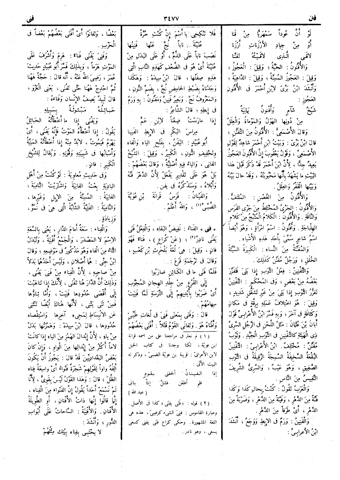 ( فني ) الفَناء نَقِيض البقاء والفعل فَنى يَفْنَى نادر عن كراع فَناء فهو فانٍ وقيل هي لغة بلحرث ابن كعب وقال في ترجمة قرع فلما فَنى ما في الكنائن ضارَبُوا إلى القُرْعِ من جِلْدِ الهِجانِ المُجَوَّبِ أَي ضربوا بأَيديهم إِلى التِّرَسةِ لما فَنِيت سهامهم قال وفَنى بمعنى فَنِيَ في لغات طيّء وأَفْناه هو وتَفانى القومُ قتلاً أَفنى بعضهم بعضاً وتفانوا أَي أَفنى بعضهم بعضاً في الحرب وفَنِيَ يَفْنى فَناء هَرِمَ وأَشرف على الموت هَرَماً وبذلك فسر أَبو عبيد حديث عمر رضي الله عنه أَنه قال حَجَّةً ههنا ثم احْدِجْ ههنا حتى تَفْنى يعني الغزو قال لبيد يصف الإنسان وفَناءه حَبائِلُه مَبْثوثةٌ بسَبِيلِه ويَفْنى إِذا ما أَخْطَأَتْه الحَبائلُ يقول إِذا أَخطأَه الموت فإِنه يفنى أَي يَهْرَمُ فيموت لا بدَّ منه إِذا أَخطأَته المنِيَّةُ وأَسبابها في شَبِيبَته وقُوَّته ويقال للشيخ الكبير فانٍ وفي حديث معاوية لو كنتُ من أَهل البادِيةِ بعت الفانِيةَ واشتريت النامِيةَ الفانِيةُ المُسِنَّة من الإِبل وغيرها والنامِيةُ الفَتِيَّةُ الشابَّة التي هي في نموّ وزيادة والفِناء سَعةٌ أَمامَ الدار يعني بالسعة الاسم لا المصدر والجمع أَفْنِيةٌ وتبدل الثاء من الفاء وهو مذكور في موضعه وقال ابن جني هما أَصلان وليس أَحدهما بدلاً من صاحبه لأَن الفِناء من فَنِيَ يَفْنى وذلك أَن الدار هنا تَفْنى لأَنك إِذا تناهيت إِلى أَقصى حدودها فَنِيَتْ وأَما ثِناؤها فمن ثَنى يَثْني لأَنها هناك أَيضاً تنثني عن الانبساط لمجيء آخرها واسْتِقْصاء حدودها قال ابن سيده وهمزتها بدل من ياء لأَن إِبدال الهمز من الياء إِذا كانت لاماً أَكثر من إِبدالها من الواو وإن كان بعض البغداديين قد قال يجوز أَن يكون أَلفه واواً لقولهم شجرة فَنْواء أَي واسِعة فِناء الظل قال وهذا القول ليس بقوي لأَنا لم نسمع أَحداً يقول إِن الفَنْواء من الفِناء إنما قالوا إِنها ذات الأَفنان أَو الطويلة الأَفنان والأَفْنِية السَّاحات على أَبواب الدور وأَنشد لا يُجْتَبى بِفناء بَيْتِك مثْلهم