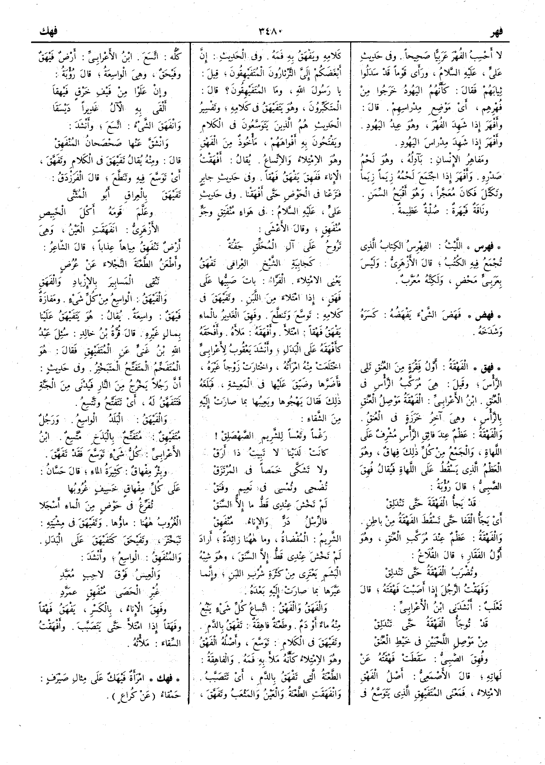 لا أَحسب الفُهْر عربيّاً صحيحاً وفي حديث علي عليه السلام ورأَى قوماً قد سَدَلوا ثيابهم فقال كأَنهم اليهود خرجوا من فُهْرهم أَي موضع مِدْراسهم قال وأَفْهَرَ إِذا شهد الفُهْر وهو عيد اليهود وأَفهر إِذا شهد مِدْراس اليهود ومفاهرُ الإِنسان بَآدِلُه وهو لحم صدره وأَفْهَر إِذا اجتمع لحمه زِيَماً زِيَماً وتَكَتَّل فكان مُعَجَّراً وهو أَقبح السمن وناقة فَيْهرة صلبة عظيمة ( فهرس ) الليث الفِهْرِس الكتاب الذي تُجْمع فيه الكتُب قال الأَزهري وليس بعربيّ محض ولكنه معرّب ( فهض ) فَهَضَ الشيءَ يَفْهَضُه كسَرَه وشَدَخَه ( فهق ) الفَهْقةُ أَول فَقْرة من العنق تلي الرأس وقيل هي مُرَكْبُ الرأس في العنق ابن الأَعرابي الفَهْقة مَوْصِلُ العنق بالرأس وهي آخر خَرزَةٍ في العنق والفَهْقةُ عظم عند فائق الرأس مشرف على اللَّهاة والجمع من كل ذلك فِهَاقٌ وهو العظم الذي يسقط على اللهاة فيقال فُهِقَ الصبي قال رؤبة قد يَجَأُ الفَهْقَةَ حتى تَنْدَلِقْ أَي يَجَأُ القَفا حتى تسقط الفَهْقةُ من باطن والفهقة عظم عند مُرَكَّب العنق وهو أَول الفَقَار قال القلاخ وتُضرَبُ الفَهْقَةُ حتى تَنْدلِقْ وفَهَقْتُ الرجلَ إذا أَصبت فَهْقَتهُ قال ثعلب أَنشدني الأَعرابي قد تُوجَأُ الفَهْقةُ حتى تَنْدَلِقُ من مَوْصِلِ اللَّحْيين في خَيْط العُنُقْ وفُهِقَ الصبيُّ سقطت فَهْقتُه عن لَهاته قال الأصمعي أصل الفَهْقِ الامتلاء فمعنى المُتَفَيْهق الذي يتوسع في كلامه ويَفْهَقُ به فمه وفي الحديث إن أبغضكم إليَّ الثَّرثاروُن المُتَفَيْهِقُون قيل يا رسول الله وما المُتَفَيْهِقُون ؟ قال المتكبرون وهو يَتَفَيْهقُ في كلامه وتفسير الحديث هم الذين يتوسعون في الكلام ويفتحون به أفواههم مأخوذ من الفَهْق وهو الامتلاء والاتساع يقال أفْهَقْتُ الإناء فَفَهِقَ يَفْهَقُ فَهْقاً وفي حديث جابر فنزعنا في الحوض حتى أَفْهَقْنا وفي حديث علي عليه السلام في هواء مُنْفَتِق وجوّ مُنْفَهِق وقال الأعشى تَرُوحُ على آل المُحَلّقِ جَفْنَةٌ كجابِيةِ الشيخ العِراقيّ تَفْهَقُ يعني الامتلاء الفراء بات صبِيُّها على فَهَقٍ إذا امتلأَ من اللبن وتَفَيْهقَ في كلامه توسَّع وتنطَّع وفَهِقَ الغدير بالماء يَفْهَقُ فَهْقاً امتلأَ وأَفْهَقَهُ ملأَه وأفْحقَهُ كأفْهقَهُ على البدل وأنشد يعقوب لأعرابي اختلعت منه امرأته واختارت زوجاً غيره فأَضرَّها وضيّق عليها في المعيشة فبلغه ذلك فقال يهجوها ويعيبها بما صارت إليه من الشقاء رَغْماً وتَعْساً للشَّريم الصَّهْصَلِقْ كانت لَدَيْنا لا تَبيتُ ذا أَرَقْ ولا تَشَكَّى خَمَصاً في المُرْتَزَقْ تُضْحي وتُمْسي في نعيمٍ وفَنَقْ لم تَخْشَ عندي قَطُّ ما إلاَّ السَّنَقْ فالرَّسْلُ دَرٌّ والإناءُ مُنْفَهِقْ الشريم المُفْضاة وما ههنا زائدة أَراد لم تخش عندي قط إلا السَّنَقَ وهو شبه البَشَم يعتري من كثرة شرب اللبن وإنما عيَّرها بما صارت إليه بعده والفَهَقُ والفَهْق اتساع كل شيءٍ ينبع منه ماء أو دم وطعنة فاهقَةٌ تَفْهَقُ بالدم وتَفَيْهَقَ في الكلام توسع وأصله الفَهْقُ وهو الامتلاء كأنه ملأَ به فمه والفاهِقَةُ الطعنة التي تَفْهَق بالدم أي تتصبب وانْفَهَقت الطعنة والعين والمَثْعَبُ وتَفَهًق كله اتسع ابن الأعرابي أرض فَيْهق وفَيْحَقٌ وهي الواسعة قال رؤبة وإن عَلَوْا من فَيْفِ خَرْقٍ فَيْهقَا ألْقى به الآلُ غديراً دَيْسَقَا وانْفَهَقَ الشيءُ اتسع وأنشد وانْشَقَّ عنها صَحْصَحانُ المُنْفَهِقْ قال ومنه يقال تَفَيْهقَ في الكرم وتَفَهَّقَ أي توسع فيه وتنطَّع قال الفرزدق تَفَيْهَقَ بالعِراق أبو المُثَنَّى وعَلَّم قومَهُ أكلَ الخَبِيصِ الأزهري انْفَهَقت العين وهي أرض تَنْفَهِقُ مِياهاً عِذاباً قال الشاعر وأطْعَنُ الطَّعْنَة النَّجْلاءَ عن عُرُضٍ تَنْقي المَسابِيرَ بالإرْباد والفَهَقِ والفَيْهَقُ الواسع من كل شيء ومفازة فَيْهَق واسعة يقال هو يَتَفَيْهَقُ علينا بمال غيره قال قرة بن خالد سئل عبد الل