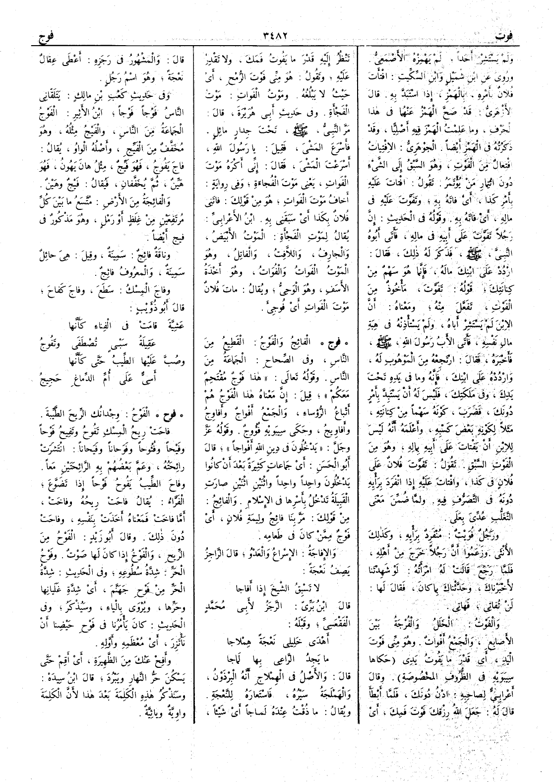 ( فوج ) الفائِجُ والفَوْجُ القَطِيعُ من الناس وفي الصحاح الجماعة من الناس وقوله تعالى هذا فَوْجٌ مُقْتَحِمٌ معكم قيل إِن معناه هذا الفَوْجَ هم أَتباعُ الرُّؤساء والجمع أَفْواجٌ وأَفاوِجُ وأَفاويجُ وحكى سيبويه فُؤُوج وقوله عز وجل يدخلون في دين الله أَفْواجاً قال أَبو الحسن أَي جماعاتٍ كثيرةً بعدَ أَنْ كانوا يدخلون واحداً واحداً واثنين اثنين صارت القبيلة تدخل بأَسْرِها في الإِسلام والفائِج من قولك مَرَّ بنا فائِجُ وليمةِ فلانٍ أَي فَوْجٌ ممن كان في طعامه والإِفاجةُ الإِسْراعُ والعَدْوُ قال الراجز يصف نعجة لا تَسْبِقُ الشيْخَ إِذا أَفاجا قال ابن بري الرجز لأَبي محمد الفقعسي وقبله أَهْدى خلِيلي نَعْجَةً هِمْلاجا ما يَجِدُ الرَّاعِي بها لَماجا قال والأَصل في الهِمْلاجِ أَنه البِرْذَوْنُ والهَمْلَجةُ سيره فاستعاره للنعجة ويقال ما ذُقْتُ عنده لَماجاً أَي شيئاً قال والمشهور في رجزه أَعْطَى عقالٌ نَعْجَةً وهو اسم رجل وفي حديث كعب بن مالك يَتَلَقّاني الناسُ فَوْجاً فَوْجاً ابن الأَثير الفَوْجُ الجماعة من الناسِ والفَيْجُ مثله وهو مخفف من الفَيِّجِ وأَصله الواو يقال فاجَ يَفُوجُ فهو فَيِّجٌ مثل هانَ يَهُونُ فهو هَيِّنٌ ثم يخففان فيقال فَيْجٌ وهَيْنٌ والفائجةُ من الأَرض مُتَّسَعُ ما بين كل مُرتَفِعَيْنِ من غِلَظ أَو رمل وهو مذكور في فيج أَيضاً وناقةٌ فائجٌ سمينة وقيل هي حائل سمينة والمعروف فائِجٌ وفاجَ المِسْكُ سَطَعَ وفاجَ كَفاحَ قال أَبو ذؤَيب عَشِيَّةَ قامَتْ في الفِناءِ كأَنَّها عَقِيلةُ سَبْيٍ تُصْطَفَى وتَفوجُ وصُبَّ عليها الطِّيبُ حتى كأَنها أَسِيٌّ على أُمِّ الدِّماغِ حَجِيجُ ( فوح ) الفَوْحُ وِجْدانك الريحَ الطيبة فاحَتْ ريح المسكِ تَفُوحُ وتَفِيحُ فَوْحاً وفَيْحاً وفُؤُوحاً وفَوَحاناً وفَيَحاناً انتشرت رائحته وعمَّ بعضهم به الرائحتين مَعاً وفاحَ الطِّيبُ يَفُوحُ فَوحاً إِذا تَضَوَّعَ الفراء يقال فاحتْ ريحه وفاختْ أَما فاختْ فمعناه أَخذتْ بنفسِه وفاحتْ دون ذلك وقال أَبو زيد الفَوْحُ من الريح والفَوْخُ إِذا كان لها صوت وفَوْحُ الحرّ شدّة سُطوعِه وفي الحديث شِدَّةُ الحرِّ من فَوْحِ جهَنَّم أَي شدَّةِ غَلَيانها وحَرِّها وينروى بالياء وسيذكر وفي الحديث كان يأْمرنا في فَوْح حَيْضِنا أَن نَأْتَزِرَ أَي معظمه وأَوّله وأَفِحْ عنك من الظهيرة أَي أَقِمْ حتى يَسْكُنَ حَرُّ النهار ويَبْرُدَ قال ابن سيده وسنذكر هذه الكلمة بعد هذا لأَن الكلمة واوية ويائية